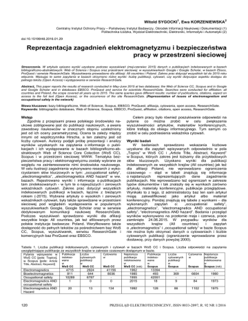Witold SYGOCKI1, Ewa KORZENIEWSKA2 Centralny Instytut Ochrony Pracy – Państwowy Instytut Badawczy, Ośrodek Informacji Naukowej i Dokumentacji (1) Politechnika Łódzka, Wydział Elektrotechniki, Elektroniki, Informatyki i Automatyki (2) doi:10.15199/48.2016.01.29 Reprezentacja zagadnień elektromagnetyzmu i bezpieczeństwa pracy w przestrzeni sieciowej Streszczenie. W artykule opisano wyniki uzyskane podczas wyszukiwań (maj-czerwiec 2015) danych o publikacjach indeksowanych w bazach bibliograficzno-abstraktowych: Web of Science i Scopus oraz przestrzeni sieciowej: w wyszukiwarkach Google i Google Scholar, w bazach Ebsco, ProQuest i serwisie ResearchGate. Wyszukiwania prowadzono dla afiliacji: All countries i Poland. Zakres prac dotyczył wszystkich lat do 2015 roku włącznie. Wpisując te same zapytania w bazach otrzymano różne wyniki: liczbę publikacji, cytowań, czy wyniki dotyczące aspektu dostępu do pełnego tekstu (Open Access) i występowania w serwisie ResearchGate. Abstract. This paper reports the results of research conducted in May-June 2015 at two databases: the Web of Science CC, Scopus and in Google and Google Scholar and in databases EBSCO, ProQuest and service for scientists ResearchGate. Searches were conducted for affiliation: all countries and Poland, the scope covered all years up to 2015. The same queries gave different results: number of publications, citations, aspect on access to the full text (Open Access), or the occurrence of the site ResearchGate. (Representation of issues of electromagnetism and occupational safety in the network) Słowa kluczowe: bazy bibliograficzne, Web of Science, Scopus, EBSCO, ProQuest, afiliacja, cytowania, open access, ResearchGate. Keywords: bibliographic databases, Web of Science, Scopus, EBSCO, ProQuest, affiliation, citations, open access, ResearchGate. Wstęp Zgodnie z przepisami prawa polskiego środowisko naukowe zobligowane jest do publikacji naukowych, a awans zawodowy naukowców w znacznym stopniu uzależniony jest od ich oceny parametrycznej. Ocena ta zależy między innymi od współczynnika Hirscha, a ten zależny jest od liczby cytowań. Autorzy podjęli próbę prezentacji i analizy wyników uzyskanych na zapytania o informacje o publikacjach i ich występowanie w bazach bibliograficzno-abstraktowych Web of Science Core Colection (WoS CC), Scopus i w przestrzeni sieciowej WWW. Tematyka bezpieczeństwa pracy i elektromagnetyzmu zostały wybrane ze względu na zainteresowanie nimi środowiska naukowego. W celu ilustracji zagadnienia wykonywano research z wykorzystaniem słów kluczowych w tym: „occupational safety”, „electromagnetics”, „electromagnetics AND hazard” w ww. bazach. Rejestrowano wyniki i informacje o publikacjach tam zindeksowanych - w tym te o najwyższych i zerowych wskaźnikach cytowań. Zakres prac dotyczył wszystkich indeksowanych publikacji w bazach, łącznie z bieżącym rokiem (-2015). Wybrane artykuły o wysokich i zerowych wskaźnikach cytowań, były także sprawdzane w przestrzeni sieciowej pod względem występowania w popularnych wyszukiwarkach Google, Google Scholar oraz w serwisie dedykowanym komunikacji naukowej ResearchGate. Podczas wyszukiwań sprawdzano wyniki dla afiliacji wszystkie kraje: All countries, jak też afiliowanych przez polskie instytucje badawcze: Poland. Weryfikowano także dostępność do pełnych tekstów za pośrednictwem baz WoS CC, Scopus, wyszukiwarek, serwisu ResearchGate i komercyjnych baz ProQuest oraz EBSCO. Celem pracy było również poszukiwanie odpowiedzi na pytanie co można zrobić w celu zwiększenia wyszukiwalności artykułów, materiałów konferencyjnych, które trafiają do obiegu informacyjnego. Tym samym co zrobić w celu podniesienia wskaźnika cytowań. Wyniki badań W badaniach sprawdzono wskazania liczbowe uzyskane dla zapytań wpisywanych odpowiednio w pola „Topics” w WoS CC i „Article Title, Abstract, Keyword” w Scopus, których zakres jest tożsamy dla przykładowych słów kluczowych. Uzyskano wyniki dla publikacji indeksowanych ze wszystkich krajów (All countries) jak też dla afiliacji Poland, nie wprowadzano ograniczenia czasowego – stąd w tabeli znajdują się informacje o najstarszych reprezentujących dane zagadnienie publikacjach. Nie wprowadzano też ograniczeń w zakresie typów dokumentów i tak znalazły się w wynikach zarówno artykuły, materiały konferencyjne, publikacje przeglądowe. Wynikało to z tego, iż administratorzy baz ten sam artykuł mogą zakwalifikować jako artykuł albo materiał konferencyjny. Poniżej znajdują się tabele z wynikami – dla wykonanych zapytań o: „occupational safety”, „electromagnetics”, “electromagnetics AND occupational safety”, “electromagnetics AND hazard”. Badania i przegląd wyników wykonywano na przełomie maja i czerwca, prace zamknięto 24.06.2015. W przypadku wyników dla wszystkich krajów (All countries) i zapytań o „electromagnetics” i „occupational safety” w bazie Scopus nie można było otrzymać danych o cytowaniach i liczbie cytowanych publikacji (ograniczenie wprowadzone przez dostawcę, przy danych powyżej 2000). Tabela 1. Liczba publikacji indeksowanych, cytowanych i cytowań w bazach WoS CC i Scopus. Liczba odpowiedzi na zapytania uwzględniające publikacje ze wszystkich krajów w zakresie czasowym dostępnym w bazie. Pytania wpisywane w WoS CC [pole: Topics], w Scopus [pole: Article Title, Abstract, Keyword] Electromagnetics Bioelectromagnetics Occupational safety Electromagnetics AND occupational safety Electromagnetics AND Hazard Publikacje indeksowane w WoS CC Liczba cytowanych publikacji w WoS CC Cytowania w WoS CC Najstarsza publikacja indeksowana w WoS CC (rok) Publikacje indeksowane w Scopus Liczba cytowanych publikacji w Scopus Cytowania Najstarsza w publikacja indeksowana w Scopus Scopus (rok) 4715 811 10289 1 2924 644 6787 0 41156 8036 0 1962 1985 1955 2015 13394 493 42551 18 369 9 6604 84 1980 1