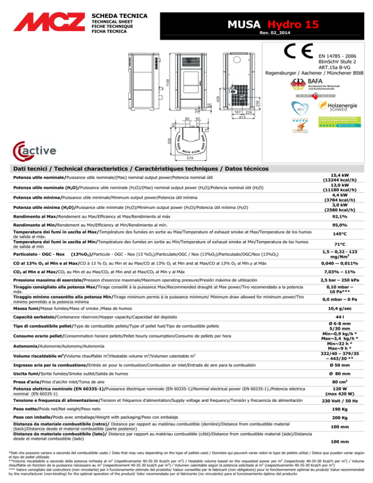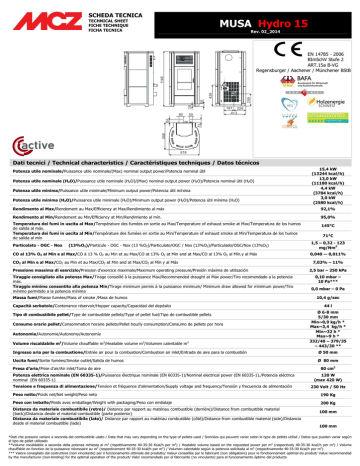 SCHEDA TECNICA TECHNICAL SHEET FICHE TECHNIQUE FICHA TECNICA MUSA Hydro 15 Rev. 02_2014 30 60 259 439 1149 EN 14785 - 2006 BImSchV Stufe 2 ART.15a B-VG Regensburger / Aachener / Münchener BStB 187 226 413 50 558 73 63 80 578 Dati tecnici / Technical characteristics / Caractéristiques techniques / Datos técnicos Potenza utile nominale/Puissance utile nominale/(Max) nominal output power/Potencia nominal útil Potenza utile nominale (H2O)/Puissance utile nominale (H2O)/(Max) nominal output power (H2O)/Potencia nominal útil (H2O) Potenza utile minima/Puissance utile minimale/Minimum output power/Potencia útil mínima Potenza utile minima (H2O)/Puissance utile minimale (H2O)/Minimum output power (H2O)/Potencia útil mínima (H2O) 15,4 kW (13244 kcal/h) 13,0 kW (11180 kcal/h) 4,4 kW (3784 kcal/h) 3,0 kW (2580 kcal/h) Rendimento al Max/Rendement au Max/Efficiency at Max/Rendimiento al máx 92,1% Rendimento al Min/Rendement au Min/Efficiency at Min/Rendimiento al mín. 95,0% Temperatura dei fumi in uscita al Max/Température des fumées en sortie au Max/Temperature of exhaust smoke at Max/Temperatura de los humos de salida al máx. Temperatura dei fumi in uscita al Min/Température des fumées en sortie au Min/Temperature of exhaust smoke at Min/Temperatura de los humos de salida al mín Particolato - OGC - Nox (13%O2)/Particule - OGC - Nox (13 %O2)/Particulate/OGC / Nox (13%O2)/Particulado/OGC/Nox (13%O2) CO al 13% O2 al Min e al Max/CO à 13 % O2 au Min et au Max/CO at 13% O2 at Min and at Max/CO al 13% O2 al Mín.y al Máx CO2 al Min e al Max/CO2 au Min et au Max/CO2 at Min and at Max/CO2 al Mín y al Máx Pressione massima di esercizio/Pression d'exercice maximale/Maximum operating pressure/Presión máxima de utilización Tiraggio consigliato alla potenza Max/Tirage conseillé à la puissance Max/Recommended draught at Max power/Tiro recomendado a la potencia máx. Tiraggio minimo consentito alla potenza Min/Tirage minimum permis à la puissance minimum/ Minimum draw allowed for minimum power/Tiro mínimo permitido a la potencia mínima Massa fumi/Masse fumées/Mass of smoke /Masa de humos Capacità serbatoio/Contenance réservoir/Hopper capacity/Capacidad del depósito Tipo di combustibile pellet/Type de combustible pellets/Type of pellet fuel/Tipo de combustible pellets Consumo orario pellet/Consommation horaire pellets/Pellet hourly consumption/Consumo de pellets por hora Autonomia/Autonomie/Autonomy/Autonomía Volume riscaldabile m3/Volume chauffable m3/Heatable volume m3/Volumen calentable m3 145°C 71°C 1,5 – 0,32 - 123 mg/Nm3 0,040 — 0,011% 7,03% – 11% 2,5 bar – 250 kPa 0,10 mbar – 10 Pa*** 0,0 mbar – 0 Pa 10,4 g/sec 44 l Ø 6-8 mm 5/30 mm Min~0,9 kg/h * Max~3,4 kg/h * Min~32 h * Max~9 h * 332/40 – 379/35 – 443/30 ** Ingresso aria per la combustione/Entrée air pour la combustion/Combustion air inlet/Entrada de aire para la combustión Ø 50 mm Uscita fumi/Sortie fumées/Smoke outlet/Salida de humos Ø 80 mm Presa d’aria/Prise d'air/Air inlet/Toma de aire 80 cm2 Potenza elettrica nominale (EN 60335-1)/Puissance électrique nominale (EN 60335-1)/Nominal electrical power (EN 60335-1)./Potencia eléctrica nominal (EN 60335-1) 120 W (max 420 W) Tensione e frequenza di alimentazione/Tension et fréquence d'alimentation/Supply voltage and frequency/Tensión y frecuencia de alimentación 230 Volt / 50 Hz Peso netto/Poids net/Net weight/Peso neto 190 Kg Peso con imballo/Poids avec emballage/Weight with packaging/Peso con embalaje 200 Kg Distanza da materiale combustibile (retro)/ Distance par rapport au matériau combustible (derrière)/Distance from combustible material (back)/Distancia desde el material combustible (parte posterior) Distanza da materiale combustibile (lato)/ Distance par rapport au matériau combustible (côté)/Distance from combustible material (side)/Distancia desde el material combustible (lado) 100 mm 100 mm *Dati che possono variare a seconda del combustibile usato / Data that may vary depending on the type of pellets used / Données qui peuvent varier selon le type de pellets utilisé / Datos que pueden variar según el tipo de pellet utilizado **Volume riscaldabile a seconda della potenza richiesta al m3 (rispettivamente 40-35-30 Kcal/h per m3) / Heatable volume based on the requested power per m3 (respectively 40-35-30 Kcal/h per m3) / Volume chauffable en fonction de la puissance nécessaire au m3 (respectivement 40-35-30 kcal/h par m3) / Volumen calentable según la potencia solicitada al m3 (respectivamente 40-35-30 Kcal/h por m3) *** Valore consigliato dal costruttore (non vincolante) per il funzionamento ottimale del prodotto/ Valeur conseillée par le fabricant (non obligatoire) pour le fonctionnement optimal du produit/ Value recommended by the manufacturer (non-binding) for the optimal operation of the product/ Valor recomendado por el fabricante (no vinculante) para el funcionamiento óptimo del producto SCHEDA TECNICA TECHNICAL SHEET TECHNISCHES DATENBLATT FICHE TECHNIQUE FICHA TECNICA MUSA Hydro 15 Rev. 02_2014 Collegamento Impianto Idraulico / Plumbing System Connection /Anschluss Hydraulische Anlage / Raccordement Installation Hydraulique / Conexión Instalación Hidráulica MUSA senza kit produzione acqua sanitaria / MUSA without domestic water kit/ MUSA ohne Bausatz Brauchwasser / MUSA sans kit eau sanitaire / MUSA sin kit de producción de agua sanitaria. A1=Mandata acqua riscaldamento 3/4”M A2=Ritorno acqua riscaldamento 3/4”M C=Valvola di sicurezza 3 bar– 1/2”F E=Svuotamento impianto 1/2”F A1=Heating water delivery 3/4”M A2=Heating water return 3/4”M C=Safety valve 3 bar – 1/2”F E=System emptying 1/2”F MUSA con kit produzione acqua sanitaria / MUSA with domestic water kit / MUSA mit Bausatz Brauchwasse / MUSA avec kit eau sanitaire / MUSA con kit de producción de agua sanitaria. A1=Mandata acqua riscaldamento 3/4”M A2=Ritorno acqua riscaldamento 3/4”M C= Valvola di sicurezza 3 bar– 1/2”F E= Svu