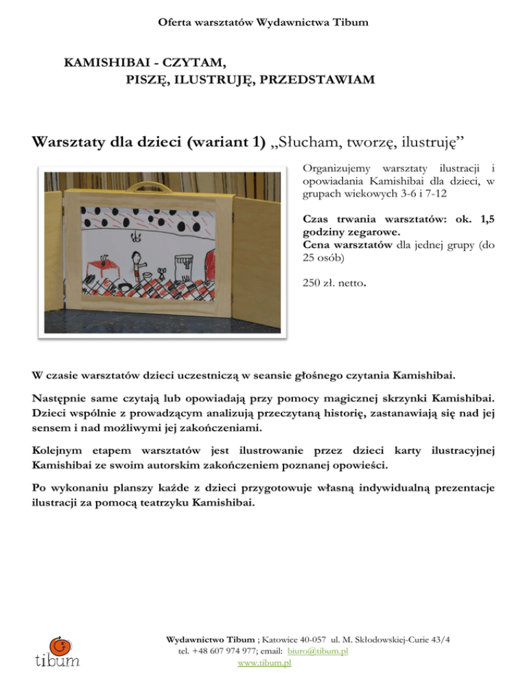 Oferta warsztatów Wydawnictwa Tibum KAMISHIBAI - CZYTAM, PISZĘ, ILUSTRUJĘ, PRZEDSTAWIAM Warsztaty dla dzieci (wariant 1) „Słucham, tworzę, ilustruję” Organizujemy warsztaty ilustracji i opowiadania Kamishibai dla dzieci, w grupach wiekowych 3-6 i 7-12 Czas trwania warsztatów: ok. 1,5 godziny zegarowe. Cena warsztatów dla jednej grupy (do 25 osób) 250 zł. netto. W czasie warsztatów dzieci uczestniczą w seansie głośnego czytania Kamishibai. Następnie same czytają lub opowiadają przy pomocy magicznej skrzynki Kamishibai. Dzieci wspólnie z prowadzącym analizują przeczytaną historię, zastanawiają się nad jej sensem i nad możliwymi jej zakończeniami. Kolejnym etapem warsztatów jest ilustrowanie przez dzieci karty ilustracyjnej Kamishibai ze swoim autorskim zakończeniem poznanej opowieści. Po wykonaniu planszy każde z dzieci przygotowuje własną indywidualną prezentacje ilustracji za pomocą teatrzyku Kamishibai. Wydawnictwo Tibum ; Katowice 40-057 ul. M. Skłodowskiej-Curie 43/4 tel. +48 607 974 977; email: [email protected] www.tibum.pl Oferta warsztatów Wydawnictwa Tibum Warsztaty dla dzieci (wariant 2) „Tworzymy opowieści Kamishibai” przy użyciu Story Cube. Warsztaty ilustracji i opowiadania Kamishibai dla dzieci, podczas których dzieci tworzą własne opowieści Kamishibai przy użyciu Story Cubes (kostki z piktogramami) Wiek uczestników: 6-12 lat. Czas trwania warsztatów: ok. 3 godziny zegarowe /z 2 przerwami/ Cena warsztatów dla jednej grupy (do 25 osób) 500 zł. netto Warsztaty dla dzieci (wariant 3) „Tworzymy książkę Kamishibai” Wiek uczestników: 6-12 lat. Czas trwania warsztatów: ok. godziny zegarowe /4-5 dni / Cena warsztatów: 60 zł. netto/ 1h 20 Plan ramowy warsztatów: W pierwszej części warsztatów dzieci uczestniczyć będą w seansach głośnego czytania przy użyciu Parawanu Kamishibai. Aby zaznajomić uczestników z technika Kamishibai będziemy ilustrować własne zakończenie czytanej opowieści. Ilu uczestników tyle zakończeń… Najodważniejsi przejmą rolę opowiadacza i sami przedstawią własne zakończenie. Wydawnictwo Tibum ; Katowice 40-057 ul. M. Skłodowskiej-Curie 43/4 tel. +48 607 974 977; email: [email protected] www.tibum.pl Oferta warsztatów Wydawnictwa Tibum Aby oswoić dzieci z opowiadaniem za pomocą ilustracji stworzymy mini-teatrzyk z papieru i spróbujemy wymyśleć krótkie historie do prezentacji Kamishibai. Kolejnym etapem warsztatów jest rozmowa na temat ulubionych bajek i wybór tytułu znanej wszystkim dzieciom bajki, którą wspólnie zilustrujemy na kolejnych zajęciach. Aby zamienić seans Kamishibai w prawdziwy pokaz o charakterze teatralnym dzieci przygotują plakat oraz bilety na swoje przedstawienie. Finałem warsztatów jest przedstawienie seansu Kamishibai przez samych twórców Warsztaty dla dzieci od lat 7 Czas trwania: ok. 20 godzin Warsztaty „Magiczna skrzynko otwórz się!” dla bibliotekarzy, nauczycieli, edukatorów, pedagogów, rodziców. Czas trwania warsztatów: ok. 3 godziny zegarowe, cena do uzgodnienia Zawartość merytoryczna warsztatów: 1.Historia Kamishibai Przegląd historycznych dziejów Kamishibai od XII w. do współczesności. 2. Dlaczego Kamishibai? Wydawnictwo Tibum ; Katowice 40-057 ul. M. Skłodowskiej-Curie 43/4 tel. +48 607 974 977; email: [email protected] www.tibum.pl Oferta warsztatów Wydawnictwa Tibum • Czym różni się Kamishibai od książki obrazkowej - rola ilustracji w czytaniu dzieciom, jak ilustracja wspiera tekst i podtrzymuje uwagę młodych słuchaczy. • Co powoduje że dzieci są zafascynowane "magiczną skrzynką"? • Rola aktywizacyjna Kamishibai - Kamishibai jako narzędzie umożliwiające naukę czytania i opowiadania, samodzielnego formułowania wypowiedzi i rozwoju percepcji u dzieci w wieku 3-12. • Kamishibai jako narzędzie pracy nauczyciela i bibliotekarza. 3. Jak zorganizować seans Kamishibai by w pełni wykorzystać możliwości „magicznej skrzynki” • Przygotowanie pomieszczenia. • Przygotowanie przedstawienia/ seansu głośnego czytania. • Dodatkowe elementy mogące urozmaicić seans Kamishibai. • Pasywny czy dynamiczny Kamishibai? 4. Po przedstawieniu - jak zagospodarować czas po przedstawieniu. 5. Jak twórczo pracować z dzieckiem przy pomocy Kamishibai? • Jak wykorzystać seans Kamishibai do pracy z dziećmi w różnym wieku. • Tworzymy własny Kamishibai – używając skrzynki Kamishibai • Tworzymy własne opowieści Kamishibai, Kamishibai Wydawnictwa Tibum Otrzymało Nagrodę Główną w Konkursie Świat Przyjazny Dziecku organizowanym przez Komitet Ochrony Praw Dziecka w kategorii Kultura za rok 2013 Wydawnictwo Tibum ; Katowice 40-057 ul. M. Skłodowskiej-Curie 43/4 tel. +48 607 974 977; email: [email protected] www.tibum.pl