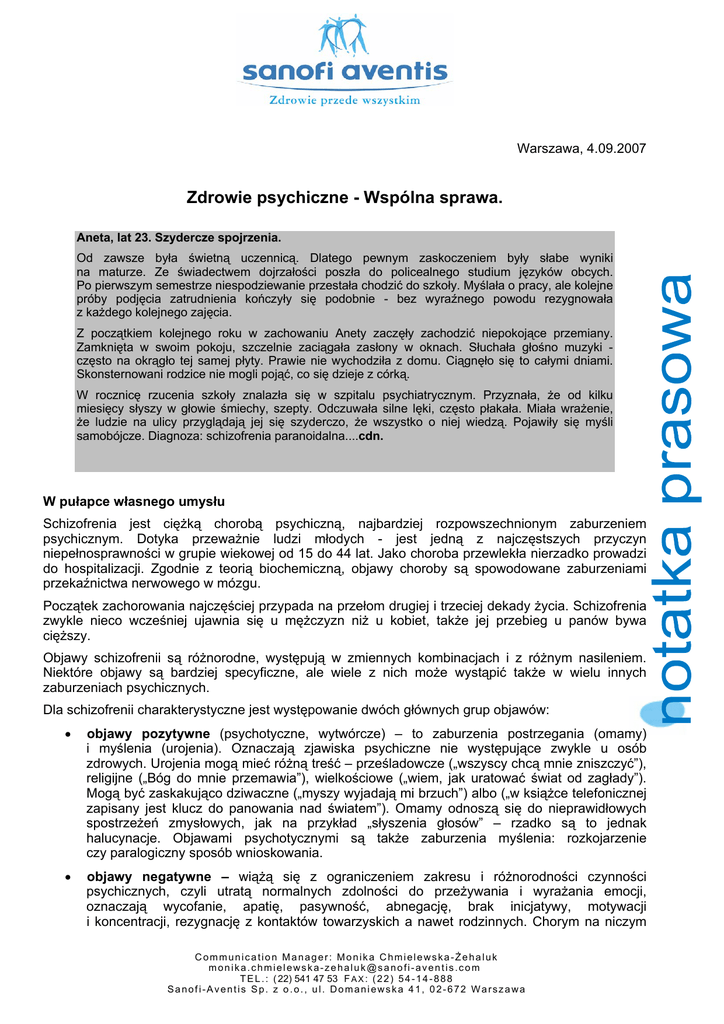 Warszawa, 4.09.2007 Zdrowie psychiczne - Wspólna sprawa. Aneta, lat 23. Szydercze spojrzenia. Od zawsze była świetną uczennicą. Dlatego pewnym zaskoczeniem były słabe wyniki na maturze. Ze świadectwem dojrzałości poszła do policealnego studium języków obcych. Po pierwszym semestrze niespodziewanie przestała chodzić do szkoły. Myślała o pracy, ale kolejne próby podjęcia zatrudnienia kończyły się podobnie - bez wyraźnego powodu rezygnowała z każdego kolejnego zajęcia. Z początkiem kolejnego roku w zachowaniu Anety zaczęły zachodzić niepokojące przemiany. Zamknięta w swoim pokoju, szczelnie zaciągała zasłony w oknach. Słuchała głośno muzyki często na okrągło tej samej płyty. Prawie nie wychodziła z domu. Ciągnęło się to całymi dniami. Skonsternowani rodzice nie mogli pojąć, co się dzieje z córką. W rocznicę rzucenia szkoły znalazła się w szpitalu psychiatrycznym. Przyznała, że od kilku miesięcy słyszy w głowie śmiechy, szepty. Odczuwała silne lęki, często płakała. Miała wrażenie, że ludzie na ulicy przyglądają jej się szyderczo, że wszystko o niej wiedzą. Pojawiły się myśli samobójcze. Diagnoza: schizofrenia paranoidalna....cdn. W pułapce własnego umysłu Schizofrenia jest ciężką chorobą psychiczną, najbardziej rozpowszechnionym zaburzeniem psychicznym. Dotyka przeważnie ludzi młodych - jest jedną z najczęstszych przyczyn niepełnosprawności w grupie wiekowej od 15 do 44 lat. Jako choroba przewlekła nierzadko prowadzi do hospitalizacji. Zgodnie z teorią biochemiczną, objawy choroby są spowodowane zaburzeniami przekaźnictwa nerwowego w mózgu. Początek zachorowania najczęściej przypada na przełom drugiej i trzeciej dekady życia. Schizofrenia zwykle nieco wcześniej ujawnia się u mężczyzn niż u kobiet, także jej przebieg u panów bywa cięższy. Objawy schizofrenii są różnorodne, występują w zmiennych kombinacjach i z różnym nasileniem. Niektóre objawy są bardziej specyficzne, ale wiele z nich może wystąpić także w wielu innych zaburzeniach psychicznych. Dla schizofrenii charakterystyczne jest występowanie dwóch głównych grup objawów: • objawy pozytywne (psychotyczne, wytwórcze) – to zaburzenia postrzegania (omamy) i myślenia (urojenia). Oznaczają zjawiska psychiczne nie występujące zwykle u osób zdrowych. Urojenia mogą mieć różną treść – prześladowcze („wszyscy chcą mnie zniszczyć”), religijne („Bóg do mnie przemawia”), wielkościowe („wiem, jak uratować świat od zagłady”). Mogą być zaskakująco dziwaczne („myszy wyjadają mi brzuch”) albo („w książce telefonicznej zapisany jest klucz do panowania nad światem”). Omamy odnoszą się do nieprawidłowych spostrzeżeń zmysłowych, jak na przykład „słyszenia głosów” – rzadko są to jednak halucynacje. Objawami psychotycznymi są także zaburzenia myślenia: rozkojarzenie czy paralogiczny sposób wnioskowania. • objawy negatywne – wiążą się z ograniczeniem zakresu i różnorodności czynności psychicznych, czyli utratą normalnych zdolności do przeżywania i wyrażania emocji, oznaczają wycofanie, apatię, pasywność, abnegację, brak inicjatywy, motywacji i koncentracji, rezygnację z kontaktów towarzyskich a nawet rodzinnych. Chorym na niczym Communication Manager: Monika Chmielewska-Żehaluk [email protected] T E L . : ( 22) 541 47 53 F A X : ( 2 2 ) 5 4 - 1 4 - 8 8 8 Sanofi-Aventis Sp. z o.o., ul. Domaniewska 41, 02-672 Warszawa nie zależy, stają się zupełnie bezwolni. Objawy negatywne często odpowiadają za trwałe wyłączenie chorego z życia zawodowego i społecznego. Wymienia się także objawy afektywne, które najczęściej oznaczają lęk i zaburzenia nastroju. Warto pamiętać, że wszystkie wymienione objawy wiążą się z wielkim cierpieniem chorego oraz jego najbliższych. Diagnozę w schizofrenii stawia się na podstawie rozmowy z pacjentem i obserwacji jego zachowania. Bardzo istotne są także informacje od rodziny i osób trzecich. Szczegółowe kryteria zostały opisane w klasyfikacjach międzynarodowych: obowiązującej w Polsce ICD-10 oraz amerykańskiej DSM-IV. Nie ma testów ani badań laboratoryjnych pozwalających na pewne stwierdzenie schizofrenii. Choroba zazwyczaj przybiera formę zaostrzeń, przebiega „rzutami”, przy czym faza „negatywna” (apatia, bierność) pojawia się po ustąpieniu objawów psychotycznych. Schizofrenia może też przejść w niekorzystną formę przewlekłą gdzie objawy obecne są prawie stale. Skrajnie niekorzystny przebieg choroby dotyczy około 20% pacjentów. Chorzy na schizofrenię są w większym stopniu narażeni na choroby somatyczne, między innymi serca, układu oddechowego, cukrzycę, wielorakie infekcje. Wiele przemawia za tym, że przyczyną takiego stanu rzeczy jest ograniczona dostępność chorych do podstawowej opieki medycznej. Tragicznym wymiarem choroby są częste próby samobójcze. Połowa chorych przynajmniej raz próbuje pozbawić się życia. Co najmniej 1 na 20 chorych na schizofrenię zginie śmiercią samobójczą. Pan Leszek, lat 67. Na rencie od 1975 roku. Miał zaledwie 25 lat. Budował wtedy swój pierwszy dom. Zaczął się skarżyć się na kłopoty z koncentracją. Pewnego wieczoru wyrwał ze ścian wszystkie przewody. Twierdził, że są w nich ukryte ładunki, które mają zakodowany niszczycielski sygnał. W środku nocy wywiózł żonę z malutkim dzieckiem do lasu. Uważał, że tylko tam będą bezpieczni. Od ich ślubu mijały wówczas 3 lata. Został przyjęty do szpitala psychiatrycznego. Długo nie uznawał rozpoznania schizofrenii, nie chciał przyjmować leków. Zamęczał lekarzy, zgłaszając uciążliwe objawy uboczne leczenia - sztywność mięśni, drżenie rąk, nadmierne uspokojenie, senność. Przez kolejne lata pan Leszek co najmniej trzy razy w roku trafiał do szpitala. Początkowo chorował bardzo burzliwie, ale po kilku ty