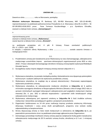 UMOWA NR ........................ Zawarta w dniu ………………… roku w Warszawie, pomiędzy: Miastem stołecznym Warszawa, Pl. Bankowy 3/5, 00-950 Warszawa, NIP: 525-22-48-481, reprezentowanym na podstawie pełnomocnictwa Prezydenta m.st. Warszawy z dnia 05.11.2015 r. Nr GP-OR.0052.4318.2015 przez Pana Tomasza Kuczborskiego – p.o. Dyrektora Ośrodka, zwanym w dalszej treści umowy „Zamawiającym”, a ……………………………………………………………………………………………………………………….. reprezentowaną przez ........................................................................................, zwanym w dalszej treści umowy „Wykonawcą”, zwane łącznie w dalszej treści umowy „Stronami”, na podstawie przepisów art. 4 pkt 8 Ustawy Prawo zamówień publicznych (Dz. U. z 2015 r. poz. 2164) w związku z wyborem oferty Wykonawcy z dnia …………………………. , została zawarta Umowa o następującej treści: § 1. 1. Przedmiotem umowy jest świadczenie przez Wykonawcę na rzecz Zamawiającego, zabezpieczenia medycznego uczestników imprez sportowo-rekreacyjnych organizowanych przez BOS w roku 2016 r. Prawa i obowiązki Zamawiającego określone niniejszą umową będzie wykonywał Białołęcki Ośrodek Sportu. 2. Szczegółowy wykaz imprez objętych niniejszą umową stanowi załącznik nr 1. 1. 2. 3. 4. 5. 6. 7. § 2. Wykonawca oświadcza, że posiada niezbędną wiedzę i doświadczenie oraz dysponuje potencjałem technicznym i osobami zdolnymi do wykonania przedmiotu umowy. Wykonawca oświadcza, że znajduje się w sytuacji ekonomicznej i finansowej zapewniającej wykonanie przedmiotu umowy. Wykonawca oświadcza, że zabezpieczenie medyczne określone w Załączniku nr 1 spełnia minimalne wymagania określone w Rozporządzeniu Ministra Zdrowia z dnia 6 lutego 2012 roku w sprawie minimalnych wymagań dotyczących zabezpieczenia pod względem medycznym imprezy masowej (Dz. U. poz. 181) w zakresie wyposażenia i uprawnień osób świadczących usługi zabezpieczenia medycznego. Wykonawca zobowiązany jest zapewnić ustaloną w Załączniku Nr 1 ilość środków ochrony medycznej i ratowników posiadających zgodne z przepisami przeszkolenie. Organizator każdorazowo na 14 dni przez realizacją imprezy przekaże ostateczną informację dotyczącą liczebności i czasu pracy służb porządkowych, programu oraz wskaże osobę odpowiedzialną za bezpieczeństwo. Strony dopuszczają zmiany w ilości służb medycznych w odniesieniu do Załącznika na 1, po poprzednim porozumieniu stron na podstawie pisemnego zgłoszenia przez Organizatora. Zamawiający przewiduje możliwość zmiany umowy poprzez zwiększenie liczby godzin świadczenia zabezpieczenia medycznego do 20 % wartości umowy brutto, określonej w § 5 ust. 1 niniejszej umowy. Strona 1 z 3 8. Na czas realizacji niniejszej umowy wykonawca posiada ubezpieczenie od odpowiedzialności cywilnej w zakresie prowadzonej działalności medycznej na kwotę nie mniejszą niż: 100000 zł (słownie : sto tysięcy złotych zero groszy brutto). Wykonawca przedłoży Zamawiającemu w terminie 5 dni od dnia zawarcia umowy polisę lub inny dokument potwierdzający posiadanie ubezpieczenia. Niedostarczenie dokumentu ubezpieczenia w wymaganym terminie lub zerwanie ciągłości ubezpieczenia stanowić będzie podstawę do rozwiązania umowy przez Zamawiającego z winy wykonawcy. § 3. 1. Ceny jednostkowe brutto za świadczenie 1 godziny zabezpieczenia medycznego określona jest w Załączniku nr 1 do niniejszej umowy oraz nie mogą być podwyższone przez cały okres obowiązywania umowy. 2. Cena jednostkowa brutto może być okresowo obniżona w okresie obowiązywania umowy, w przypadku wprowadzenia przez Wykonawcę cen promocyjnych. 1. 1. 2. 3. 4. 5. 6. 7. 8. 9. 10. § 4. Umowa zostaje zawarta na czas określony, tj. od dnia 07.03.2016 r. do dnia 05.12.2016 r. § 5. Łączna należność Wykonawcy z tytułu wykonania przedmiotu umowy nie może przekroczyć kwoty ………………….. zł (słownie: ………………………………………………………………………) brutto. Rozliczenia za wykonane usługi następować będą fakturami częściowymi, wystawianymi każdorazowo po wykonaniu przez Zamawiającego usługi zabezpieczenia medycznego , według cen jednostkowych brutto i ilości przepracowanych godzin. Ceny jednostkowe brutto za świadczenie 1 godziny zabezpieczenia medycznego obejmują wszystkie koszty związane z wykonaniem niniejszej umowy Faktury wystawione na Miasto Stołeczne Warszawa Pl. Bankowy 3/5, 00-950 Warszawa, NIP 525-22-48-481 należy złożyć w sekretariacie Białołęckiego Ośrodka Sportu, 03-144 Warszawa, ul. Światowida 56. Odbiorcą i płatnikiem faktur będzie Białołęcki Ośrodek Sportu ul. Światowida 56, 03-144 Warszawa. Prawidłowo wystawiona faktura powinna być dostarczona przez Wykonawcę do siedziby Białołęckiego Ośrodka Sportu w terminie 7 dni od dnia dostawy. Należność za wykonanie przedmiotu umowy będzie regulowana przelewem na konto Wykonawcy o numerze: ………………………………………………………………………………………… . Terminy płatności faktur będą wynosiły 21 dni po wykonaniu usługi i dostarczeniu do Białołęckiego Ośrodka Sportu prawidłowo wystawionej faktury VAT wraz z dokumentami potwierdzającymi fakt wykonania usługi. Faktura za wykonanie usługi w miesiącu grudniu 2016 r. zostanie dostarczona do siedziby Białołęckiego Ośrodka Sportu najpóźniej do dnia 20 grudnia 2016 r., a jej płatność nastąpi do dnia 30 grudnia 2016 r. Bieg terminu płatności liczony będzie od daty wpływu do Białołęckiego Ośrodka Sportu prawidłowo wystawionej przez Wykonawcę faktury VAT. Za termin zapłaty faktury Strony uznają dzień, w którym Białołęcki Ośrodek Sportu polecił swojemu bankowi dokonanie przelewu wynagrodzenia Wykonawcy na jego rachunek b