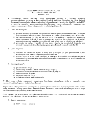 PRZEDMIOTOWY SYSTEM OCENIANIA JĘZYK HISZPAŃSKI 2016/2017 GIMNAZJUM 1. Przedmiotowy system oceniania został sporządzony zgodnie z: Zasadami oceniania wewnątrzszkolnego zawartymi w Przewodniku Ucznia i Rodziców Gimnazjum im. Matki Jadwigi Borzęckiej, Statutem Szkoły, Rozporządzeniem Ministra Edukacji Narodowej z dnia 30 kwietnia 2007 r. w sprawie warunków i sposobu oceniania, klasyfikowania i promowania uczniów i słuchaczy oraz przeprowadzania sprawdzianów i egzaminów w szkołach publicznych. 2. Uczeń ma obowiązek: a) posiadać na lekcji: podręcznik, zeszyt ćwiczeń oraz zeszyt do prowadzenia notatek (w którym będzie prowadził notatki zgodnie z rozdziałem 4, §27, pkt 4 Przewodnika Ucznia i Rodziców) b) być przygotowanym do zajęć na lekcjach języka hiszpańskiego, z możliwością zgłoszenia nieprzygotowania do lekcji 2 razy w semestrze (z wyjątkiem dni, w których ma się odbyć zapowiedziana praca kontrolna, sprawdzian lub test), jednak musi to zgłosić przed zajęciami. c) przyswajać na bieżąco wszystkie słówka, które pojawiły się na zajęciach (wchodzą one również w zakres materiału obowiązującego na sprawdzianach i pracach kontrolnych) 3. Uczeń ma prawo: a) otrzymać od nauczyciela wyniki i oceny prac pisemnych (w tym sprawdzianów i prac kontrolnych) z ich ustnym lub pisemnym uzasadnieniem b) poprawy oceny z jednej pracy kontrolnej w semestrze, i wszystkich ocen niedostatecznych otrzymanych ze sprawdzianów, odpowiedzi ustnych lub pracy domowej, w terminie ustalonym przez nauczyciela. 4. Ocenie podlegają*: a) b) c) d) e) f) prace kontrolne (waga 3) sprawdziany (materiał z trzech ostatnich lekcji) (waga 2) odpowiedzi ustne (materiał z trzech ostatnich lekcji) (waga 2) zadania domowe (waga1) aktywność na lekcji (waga 2) dodatkowe zadania, projekty (waga 2) W skład oceny wchodzi poprawność gramatyczna, leksykalna, ortograficzna (tylko w przypadku prac pisemnych), a także bogactwo środków leksykalnych. Aktywność na lekcji premiowana jest za pomocą systemu plusów i minusów: 3 plusy są równe ocenie bardzo dobrej, natomiast 3 minusy (które można otrzymać za brak materiałów, które uczeń ma obowiązek mieć na lekcji lub zadania domowego) skutkują oceną niedostateczną. Ocena końcowa jest wystawiana z uwzględnieniem średniej ważonej ocen cząstkowych, otrzymanych w czasie semestru/ roku szkolnego. Nie jest jednak średnią arytmetyczną. 5. Stopnie procentowe: a) 100% i więcej celujący b) 86% - 99% bardzo dobry c) 71% - 85% dobry d) 56% - 70% dostateczny e) 41% - 55% dopuszczający f) 0% - 40% niedostateczny 6. Ogólne wymagania edukacyjne: Ocena dopuszczająca dostateczna dobra bardzo dobra celująca Wymagania. Uczeń: Dysponuje niewystarczającym zasobem słownictwa, struktur gramatycznych, popełnia błędy fonetyczne i ortograficzne, komunikacja w języku hiszpańskim sprawia mu trudności (zarówno w odbiorze jak i udzielaniu informacji), jednak wykazuje aktywność i zaangażowanie na lekcji. Opanował materiał w sposób niedokładny, co zakłada, że zna podstawowe słownictwo i struktury gramatyczne, jednak używanie ich sprawia mu kłopot, czasem popełnia błędy fonetyczne i ortograficzne, potrafi, choć z trudnościami, komunikować się w języku hiszpańskim. Opanował materiał i posiada wiedzę i umiejętności przewidziane na dany poziom, sporadycznie popełnia błędy językowe, które jednak nie utrudniają mu komunikacji w języku hiszpańskim. Posiada wiedzę i umiejętności przewidziane na danym poziomie. Prawie nie popełnia błędów gramatycznych ani leksykalnych, nie popełnia błędów fonetycznych ani ortograficznych, komunikuje się w języku hiszpańskim w sposób płynny i poprawny. Opanował bezbłędnie materiał przewidziany na danym poziomie, spełnia wszystkie warunki na ocenę bardzo dobrą, i dodatkowo jego wiedza w zakresie języka i kultury hiszpańskiej wykraczają poza materiał przewidziany na zajęciach. Uczeń bierze udział w dodatkowych projektach/ konkursach/ zadaniach/ zajęciach. Ocenę niedostateczną uczeń otrzymuje gdy nie spełnia warunków koniecznych do otrzymania oceny dopuszczającej.