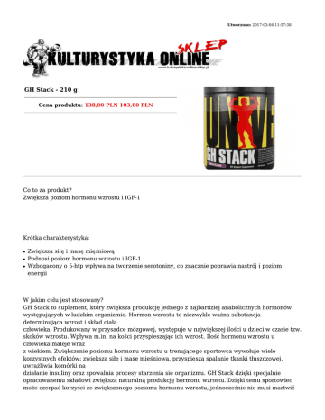 Utworzono: 2017-03-04 11:57:38 GH Stack - 210 g Cena produktu: 138,00 PLN 103,00 PLN Co to za produkt? Zwiększa poziom hormonu wzrostu i IGF-1 Krótka charakterystyka: ● ● ● Zwiększa siłę i masę mięśniową Podnosi poziom hormonu wzrostu i IGF-1 Wzbogacony o 5-htp wpływa na tworzenie serotoniny, co znacznie poprawia nastrój i poziom energii W jakim celu jest stosowany? GH Stack to suplement, który zwiększa produkcję jednego z najbardziej anabolicznych hormonów występujących w ludzkim organizmie. Hormon wzrostu to niezwykle ważna substancja determinująca wzrost i skład ciała człowieka. Produkowany w przysadce mózgowej, występuje w największej ilości u dzieci w czasie tzw. skoków wzrostu. Wpływa m.in. na kości przyspieszając ich wzrost. Ilość hormonu wzrostu u człowieka maleje wraz z wiekiem. Zwiększenie poziomu hormonu wzrostu u trenującego sportowca wywołuje wiele korzystnych efektów: zwiększa siłę i masę mięśniową, przyspiesza spalanie tkanki tłuszczowej, uwrażliwia komórki na działanie insuliny oraz spowalnia procesy starzenia się organizmu. GH Stack dzięki specjalnie opracowanemu składowi zwiększa naturalną produkcję hormonu wzrostu. Dzięki temu sportowiec może czerpać korzyści ze zwiększonego poziomu hormonu wzrostu, jednocześnie nie musi martwić się skutkami ubocznymi, które mogą pojawić się podczas kuracji hormonem wzrostu pod postacią zastrzyków. Ponieważ GH Stack zawiera w składzie również wyciąg z Griffonia Simplicifolia, bardzo korzystnie wpływa na samopoczucie człowieka, poziom energii oraz koncentracji. Wyciąg z griffonia simplicifolia zwieksza produkcję serotoniny, która jest bardzo ważnym neurohormonem, który odpowiada za odczuwanie szczęścia. Dzięki zwiększonej produkcji serotoniny, człowiek ma więcej energii i znacznie lepsze samopoczucie. Odwrotnie, obniżony poziom serotoniny objawia się depresją. Skład: Wartości odżywcze Porcja: 2 łyżeczki (10 g) Ilość porcji w opakowaniu: 21 (210 g) Zawartość: 210 g (21 porcji) Składniki % Zapotrzebowanie dzienne Ekstrakt z Mucuna Pruriens 250 mg - Simplicifolia 250 mg - Ornityna 3g - Arginina 1,2 g - Lizyna 1,2 g - Glicyna 1,1 g - Glutamina 1g - © 2008 Fitness Authority Sposób użycia: Jedną porcję 10 g (czyli 2 płaskie łyżeczki od herbaty), rozpuść w szklance wody. Spożyj na pusty żołądek, zachowując odstęp co najmniej 20 minut od następnego posiłku. Spożywać najlepiej po treningu siłowym. Adres: http://www.ko.sklep.pl/ Telefon: kom. 782 010 880 Email: [email protected]
