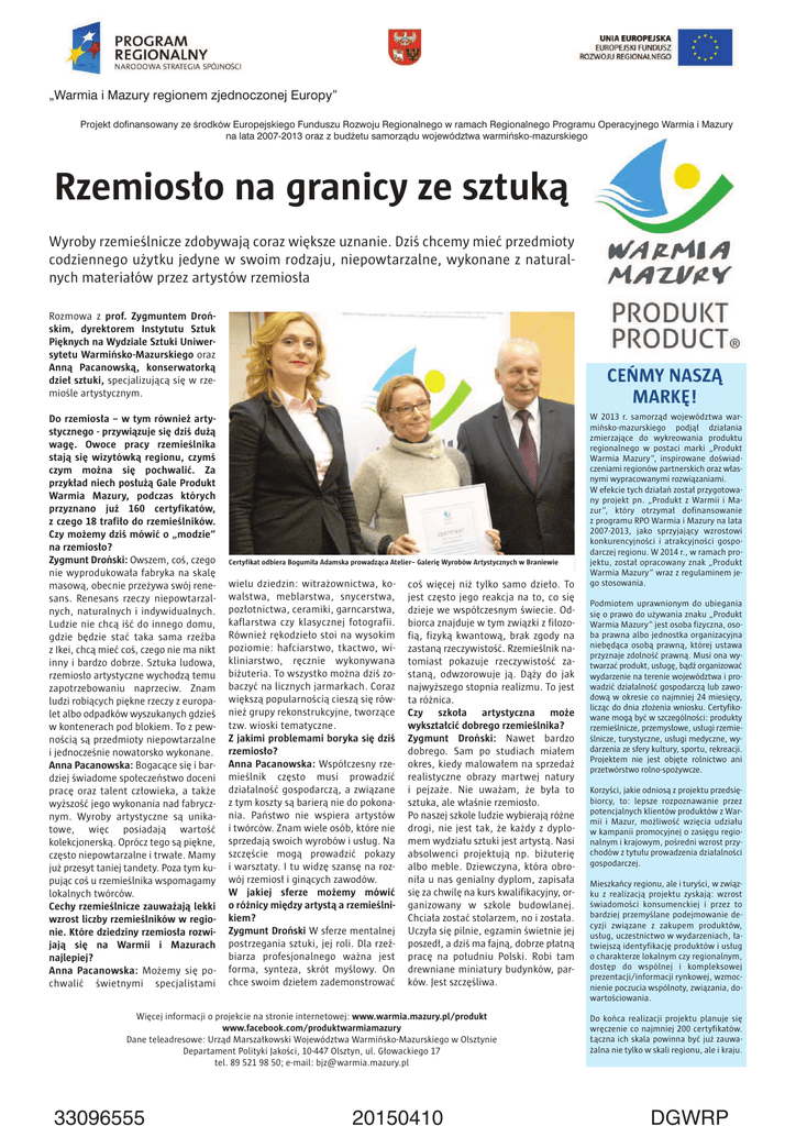 „Warmia i Mazury regionem zjednoczonej Europy” Projekt dofinansowany ze środków Europejskiego Funduszu Rozwoju Regionalnego w ramach Regionalnego Programu Operacyjnego Warmia i Mazury na lata 2007-2013 oraz z budżetu samorządu województwa warmińsko-mazurskiego Rzemiosło na granicy ze sztuką Wyroby rzemieślnicze zdobywają coraz większe uznanie. Dziś chcemy mieć przedmioty codziennego użytku jedyne w swoim rodzaju, niepowtarzalne, wykonane z naturalnych materiałów przez artystów rzemiosła Rozmowa z prof. Zygmuntem Drońskim, dyrektorem Instytutu Sztuk Pięknych na Wydziale Sztuki Uniwersytetu Warmińsko-Mazurskiego oraz Anną Pacanowską, konserwatorką dzieł sztuki, specjalizującą się w rzemiośle artystycznym. Do rzemiosła – w tym również artystycznego - przywiązuje się dziś dużą wagę. Owoce pracy rzemieślnika stają się wizytówką regionu, czymś czym można się pochwalić. Za przykład niech posłużą Gale Produkt Warmia Mazury, podczas których przyznano już 160 certyfikatów, z czego 18 trafiło do rzemieślników. Czy możemy dziś mówić o „modzie” na rzemiosło? Zygmunt Droński: Owszem, coś, czego nie wyprodukowała fabryka na skalę masową, obecnie przeżywa swój renesans. Renesans rzeczy niepowtarzalnych, naturalnych i indywidualnych. Ludzie nie chcą iść do innego domu, gdzie będzie stać taka sama rzeźba z Ikei, chcą mieć coś, czego nie ma nikt inny i bardzo dobrze. Sztuka ludowa, rzemiosło artystyczne wychodzą temu zapotrzebowaniu naprzeciw. Znam ludzi robiących piękne rzeczy z europalet albo odpadków wyszukanych gdzieś w kontenerach pod blokiem. To z pewnością są przedmioty niepowtarzalne i jednocześnie nowatorsko wykonane. Anna Pacanowska: Bogacące się i bardziej świadome społeczeństwo doceni pracę oraz talent człowieka, a także wyższość jego wykonania nad fabrycznym. Wyroby artystyczne są unikatowe, więc posiadają wartość kolekcjonerską. Oprócz tego są piękne, często niepowtarzalne i trwałe. Mamy już przesyt taniej tandety. Poza tym kupując coś u rzemieślnika wspomagamy lokalnych twórców. Cechy rzemieślnicze zauważają lekki wzrost liczby rzemieślników w regionie. Które dziedziny rzemiosła rozwijają się na Warmii i Mazurach najlepiej? Anna Pacanowska: Możemy się pochwalić świetnymi specjalistami CEŃMY NASZĄ MARKĘ! Certyfikat odbiera Bogumiła Adamska prowadząca Atelier– Galerię Wyrobów Artystycznych w Braniewie wielu dziedzin: witrażownictwa, kowalstwa, meblarstwa, snycerstwa, pozłotnictwa, ceramiki, garncarstwa, kaflarstwa czy klasycznej fotografii. Również rękodzieło stoi na wysokim poziomie: hafciarstwo, tkactwo, wikliniarstwo, ręcznie wykonywana biżuteria. To wszystko można dziś zobaczyć na licznych jarmarkach. Coraz większą popularnością cieszą się również grupy rekonstrukcyjne, tworzące tzw. wioski tematyczne. Z jakimi problemami boryka się dziś rzemiosło? Anna Pacanowska: Współczesny rzemieślnik często musi prowadzić działalność gospodarczą, a związane z tym koszty są barierą nie do pokonania. Państwo nie wspiera artystów i twórców. Znam wiele osób, które nie sprzedają swoich wyrobów i usług. Na szczęście mogą prowadzić pokazy i warsztaty. I tu widzę szansę na rozwój rzemiosł i ginących zawodów. W jakiej sferze możemy mówić o różnicy między artystą a rzemieślnikiem? Zygmunt Droński W sferze mentalnej postrzegania sztuki, jej roli. Dla rzeźbiarza profesjonalnego ważna jest forma, synteza, skrót myślowy. On chce swoim dziełem zademonstrować coś więcej niż tylko samo dzieło. To jest często jego reakcja na to, co się dzieje we współczesnym świecie. Odbiorca znajduje w tym związki z filozofią, fizyką kwantową, brak zgody na zastaną rzeczywistość. Rzemieślnik natomiast pokazuje rzeczywistość zastaną, odwzorowuje ją. Dąży do jak najwyższego stopnia realizmu. To jest ta różnica. Czy szkoła artystyczna może wykształcić dobrego rzemieślnika? Zygmunt Droński: Nawet bardzo dobrego. Sam po studiach miałem okres, kiedy malowałem na sprzedaż realistyczne obrazy martwej natury i pejzaże. Nie uważam, że była to sztuka, ale właśnie rzemiosło. Po naszej szkole ludzie wybierają różne drogi, nie jest tak, że każdy z dyplomem wydziału sztuki jest artystą. Nasi absolwenci projektują np. biżuterię albo meble. Dziewczyna, która obroniła u nas genialny dyplom, zapisała się za chwilę na kurs kwalifikacyjny, organizowany w szkole budowlanej. Chciała zostać stolarzem, no i została. Uczyła się pilnie, egzamin świetnie jej poszedł, a dziś ma fajną, dobrze płatną pracę na południu Polski. Robi tam drewniane miniatury budynków, parków. Jest szczęśliwa. Więcej informacji o projekcie na stronie internetowej: www.warmia.mazury.pl/produkt www.facebook.com/produktwarmiamazury Dane teleadresowe: Urząd Marszałkowski Województwa Warmińsko-Mazurskiego w Olsztynie Departament Polityki Jakości, 10-447 Olsztyn, ul. Głowackiego 17 tel. 89 521 98 50; e-mail: [email protected] 33096555 20150410 W 2013 r. samorząd województwa warmińsko-mazurskiego podjął działania zmierzające do wykreowania produktu regionalnego w postaci marki „Produkt Warmia Mazury”, inspirowane doświadczeniami regionów partnerskich oraz własnymi wypracowanymi rozwiązaniami. W efekcie tych działań został przygotowany projekt pn. „Produkt z Warmii i Mazur”, który otrzymał dofinansowanie z programu RPO Warmia i Mazury na lata 2007-2013, jako sprzyjający wzrostowi konkurencyjności i atrakcyjności gospodarczej regionu. W 2014 r., w ramach projektu, został opracowany znak „Produkt Warmia Mazury” wraz z regulaminem jego stosowania. Podmiotem uprawnionym do ubiegania się o prawo do używania znaku „Produkt Warmia Mazury” jest osoba fizyczna, osoba prawna albo jednostka organizacyjna niebędąca osobą prawną, której ustawa przyznaje zdolność prawną.