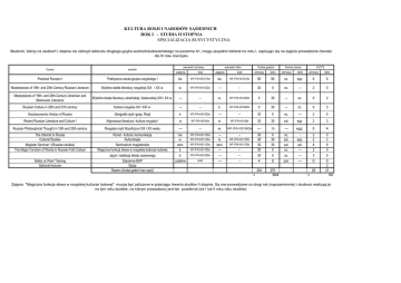 KULTURA ROSJI I NARODÓW SĄSIEDNICH ROK I - STUDIA II STOPNIA SPECJALIZACJA RUSYCYSTYCZNA Studenci, którzy na studiach I stopnia nie zaliczyli lektoratu drugiego języka wschodniosłowiańskiego na poziomie A1, mogą uzupełnić lektorat na roku I, zapisując się na zajęcia prowadzone również dla III roku licencjatu Course semestr Practical Russian I semestr zimowy semestr letni liczba godzin forma oceny ECTS zajęcia kod zajęcia kod zimowy letni zimowy letni zimowy letni Praktyczna nauka języka rosyjskiego I ćw. WF.IFW-HS101Da ćw. WF.IFW-HS101Db 90 90 oc. egz. 6 6 Masterpieces of 19th- and 20th-Century Russian Literature Wybitne dzieła literatury rosyjskiej XIX i XX w. w. WF.IFW-HS102Da --- --- 30 0 oc. --- 2 0 Masterpieces of 19th- and 20th-Century Ukrainian and Belarusian Literature Wybitne dzieła literatury ukraińskiej i białoruskiej XIX i XX w. --- --- w. WF.IFW-HS103Db 0 30 --- oc. 0 2 Russian Culture in 20th and 21th century Kultura rosyjska XX i XXI w. --- --- k. WF.IFW-HS104Db 0 30 --- oc. 0 3 Socioeconomic History of Russia Geografia społ.-gosp. Rosji k. WF.IFW-HS105Da --- --- 30 0 oc. --- 2 0 Recent Russian Literature and Culture I Najnowsza literatura i kultura rosyjska I w WF.IFW-HS106a w. WF.IFW-HS106b 30 30 zal. egz. 2 3 Russian Philosophical Thought in 19th and 20th century Rosyjska myśl filozoficzna XIX i XX wieku --- --- w. WF.IFW-GS106Da --- 30 --- egz. 0 4 The Internet in Russia Cultural Studies Magister Seminar I (Russian studies) The Magic Function of Words in Russian Folk Culture Runet - kultura i komunikacja Kulturologia Seminarium magisterskie Magiczna funkcja słowa w rosyjskiej kulturze ludowej ćw. w. sem. k. WF.IFW-HS110Da --- WF.IFW-HS119Da --w. sem. --- --- 30 30 30 30 0 30 30 0 oc. zal. zal. oc. egz. zal. --- 2 2 8 2 0 3 8 0 Język i redakcja tekstu naukowego k. WF.IFW-HS120Da --- --- 30 0 oc. --- 3 0 Szkolenie BHP Opcje Razem (liczba godzin bez opcji) zdalne BHP --- --- 4 0 zal. --- 0 0 2 31 Safety at Work Training Optional lectures WF.IFW-HS112Da WF.IFW-HS113Da WF.IFW-HS112Db WF.IFW-HS113Db 334 = 270 604 29 = 60 Zajęcia "Magiczna funkcja słowa w rosyjskiej kulturze ludowej" muszą być zaliczone w przeciągu trwania studiów II stopnia. Są one prowadzone co drugi rok (naprzemiennie) i studenci realizują je na tym roku studiów, na którym prowadzony jest ten przedmiot (na I lub II roku roku studiów). KULTURA ROSJI I NARODÓW SĄSIEDNICH ROK I - STUDIA II STOPNIA SPECJALIZACJA UKRAINISTYCZNA Studenci, którzy na studiach I stopnia nie zaliczyli lektoratu drugiego języka wschodniosłowiańskiego na poziomie A1, mogą uzupełnić lektorat na roku I, zapisując się na zajęcia prowadzone również dla III roku licencjatu Course semestr Practical Russian I semestr zimowy semestr letni liczba godzin forma oceny ECTS zajęcia kod zajęcia kod zimowy letni zimowy letni zimowy letni Praktyczna nauka języka rosyjskiego ćw. WF.IFW-HS101Da ćw. WF.IFW-HS101Db 90 90 oc. egz. 6 6 Masterpieces of 19th- and 20th-Century Russian Literature Wybitne dzieła literatury rosyjskiej XIX i XX wieku w. WF.IFW-HS102Da --- --- 30 0 oc. --- 2 0 Masterpieces of 19th- and 20th-Century Ukrainian and Belarusian Literature Wybitne dzieła literatury ukraińskiej i białoruskiej XIX i XX wieku --- --- w. WF.IFW-HS103Db 0 30 --- oc. 0 2 Russian Culture in 20th and 21th century Kultura rosyjska XX i XXI wieku --- --- k. WF.IFW-HS104Db 0 30 --- oc. 0 3 --- --- 30 0 oc. --- 2 0 w. WF.IFW-HS116Db 30 30 zal. egz. 2 3 Socioeconomic History of Russia Geografia społ.-gosp. Rosji k. WF.IFW-HS105Da Recent Ukrainian Literature and Culture Najnowsza literatura i kultura ukraińska w. WF.IFW-HS116Da Ukrainian Philosophical Thought in 19th and 20th century Ukraińska myśl społ.-polityczna XIX i XX wieku w. WF.IFW-HS109Da --- --- 30 0 egz. --- 4 0 The Internet in Ukraine Cultural Studies Magister Seminar I (Ukrainian studies) Internet na Ukrainie Kulturologia Seminarium magisterskie Magiczna funkcja słowa w rosyjskiej kulturze ludowej --w. sem. k. WF.IFW-HS111Db ćw. w. sem. --- WF.IFW-HS111Db 0 30 30 30 30 30 30 0 --zal. zal. oc. oc. egz. zal. --- 0 2 8 2 2 3 8 0 Język i redakcja tekstu naukowego Szkolenie BHP Opcje Razem (liczba godzin bez opcji) k. zdalne ----- --- 30 4 0 0 oc. zal. ----- 3 0 334 = 270 604 0 0 2 29 60 Safety at Work Training Optional lectures WF.IFW-HS112Da WF.IFW-HS113Da BHP WF.IFW-HS112Db WF.IFW-HS113Db --- --- 31 = Zajęcia "Magiczna funkcja słowa w rosyjskiej kulturze ludowej" muszą być zaliczone w przeciągu trwania studiów II stopnia. Są one prowadzone co drugi rok (naprzemiennie) i studenci realizują je na tym roku studiów, na którym prowadzony jest ten przedmiot (na I lub II roku roku studiów). KULTURA ROSJI I NARODÓW SĄSIEDNICH ROK II - STUDIA II STOPNIA SPECJALIZACJA RUSYCYSTYCZNA semestr semestr zimowy semestr letni liczba godzin forma oceny ECTS zajęcia kod zajęcia kod zimowy letni zimowy letni zimowy letni Practical Russian II Praktyczna nauka języka rosyjskiego II ćw. WF.IFW-HS201Da --- --- 90 0 egz. --- 10 0 Practical Russian - Lannguage of Business - advanced Praktyczna nauka języka rosyjskiego – język biznesu --- --- ćw. WF.IFW-HS202Db 0 30 --- oc. 0 3 History of Russia in 20th c. Historia Rosji XX wieku w. WF.IFW-HS205Da --- --- 30 0 egz. --- 5 0 Belarus in 20th c. Białoruś w XX wieku w. WF.IFW-HS207Da --- --- 30 0 oc. --- 2 0 The Culture of Eastern Christianity Kultura chrześcijaństwa wschodniego w. WF.IFW-HS208Da --- --- 30 0 oc. --- 2 0 --- -- 60 0 egz. --- 8 0 --sem. --- 15 30 0 30 zal. zal. -zal. 285 = 60 345 1 8 2 38 = 0 16 3 22 60 Eastern Slavonic Language Drugi język wschodniosłowiański A2 ćw. WF.IFW-HS214Da WF.IFW-HS215Da Protection of Intellectual Property Rights Magister Seminar II (Russian studies) Optional lectures Ochrona własności intelektualnej Seminarium magisterskie II Opcje Razem (liczba godzin bez opcji) ćw. sem. Wydział WF.IFW-HS209Ra WF.IFW-HS209Rb Zajęcia "Magiczna funkcja słowa w