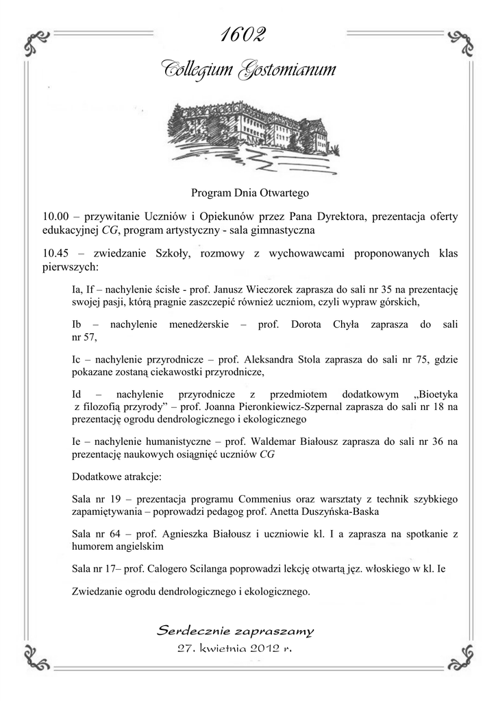 1602 Vollegium Zostomianum Program Dnia Otwartego 10.00 – przywitanie Uczniów i Opiekunów przez Pana Dyrektora, prezentacja oferty edukacyjnej CG, program artystyczny - sala gimnastyczna 10.45 – zwiedzanie Szkoły, rozmowy z wychowawcami proponowanych klas pierwszych: Ia, If – nachylenie ścisłe - prof. Janusz Wieczorek zaprasza do sali nr 35 na prezentację swojej pasji, którą pragnie zaszczepić również uczniom, czyli wypraw górskich, Ib – nr 57, nachylenie menedżerskie – prof. Dorota Chyła zaprasza do sali Ic – nachylenie przyrodnicze – prof. Aleksandra Stola zaprasza do sali nr 75, gdzie pokazane zostaną ciekawostki przyrodnicze, Id – nachylenie przyrodnicze z przedmiotem dodatkowym „Bioetyka z filozofią przyrody” – prof. Joanna Pieronkiewicz-Szpernal zaprasza do sali nr 18 na prezentację ogrodu dendrologicznego i ekologicznego Ie – nachylenie humanistyczne – prof. Waldemar Białousz zaprasza do sali nr 36 na prezentację naukowych osiągnięć uczniów CG Dodatkowe atrakcje: Sala nr 19 – prezentacja programu Commenius oraz warsztaty z technik szybkiego zapamiętywania – poprowadzi pedagog prof. Anetta Duszyńska-Baska Sala nr 64 – prof. Agnieszka Białousz i uczniowie kl. I a zaprasza na spotkanie z humorem angielskim Sala nr 17– prof. Calogero Scilanga poprowadzi lekcję otwartą jęz. włoskiego w kl. Ie Zwiedzanie ogrodu dendrologicznego i ekologicznego. Serdecznie zapraszamy 27. kwietnia 2012 r.