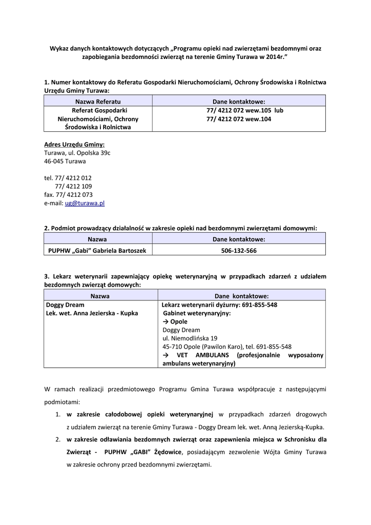 Wykaz danych kontaktowych dotyczących „Programu opieki nad zwierzętami bezdomnymi oraz zapobiegania bezdomności zwierząt na terenie Gminy Turawa w 2014r.” 1. Numer kontaktowy do Referatu Gospodarki Nieruchomościami, Ochrony Środowiska i Rolnictwa Urzędu Gminy Turawa: Nazwa Referatu Referat Gospodarki Nieruchomościami, Ochrony Środowiska i Rolnictwa Dane kontaktowe: 77/ 4212 072 wew.105 lub 77/ 4212 072 wew.104 Adres Urzędu Gminy: Turawa, ul. Opolska 39c 46-045 Turawa tel. 77/ 4212 012 77/ 4212 109 fax. 77/ 4212 073 e-mail: [email protected] 2. Podmiot prowadzący działalność w zakresie opieki nad bezdomnymi zwierzętami domowymi: Nazwa Dane kontaktowe: PUPHW „Gabi” Gabriela Bartoszek 506-132-566 3. Lekarz weterynarii zapewniający opiekę weterynaryjną w przypadkach zdarzeń z udziałem bezdomnych zwierząt domowych: Nazwa Doggy Dream Lek. wet. Anna Jezierska - Kupka Dane kontaktowe: Lekarz weterynarii dyżurny: 691-855-548 Gabinet weterynaryjny: → Opole Doggy Dream ul. Niemodlińska 19 45-710 Opole (Pawilon Karo), tel. 691-855-548 → VET AMBULANS (profesjonalnie wyposażony ambulans weterynaryjny) W ramach realizacji przedmiotowego Programu Gmina Turawa współpracuje z następującymi podmiotami: 1. w zakresie całodobowej opieki weterynaryjnej w przypadkach zdarzeń drogowych z udziałem zwierząt na terenie Gminy Turawa - Doggy Dream lek. wet. Anną Jezierską-Kupka. 2. w zakresie odławiania bezdomnych zwierząt oraz zapewnienia miejsca w Schronisku dla Zwierząt - PUPHW „GABI” Żędowice, posiadającym zezwolenie Wójta Gminy Turawa w zakresie ochrony przed bezdomnymi zwierzętami. 3. w zakresie zapewnienia wyłapanym zwierzętom przez ww podmiot miejsca w Schronisku dla Zwierząt - Fundacją S.O.S dla Zwierząt z siedzibą przy ul. Antoniów 1, 41-508 Chorzów -Maciejkowice. 4. w zakresie zapewnienia usuwania i utylizacji padłych zwierząt - „Farmutil HS”S.A. ul. Pustkowska 18, Węgry 46-023 Osowiec. 5. w zakresie zapewnienia miejsca dla bezdomnych zwierząt gospodarskich – gmina współpracuje z właścicielem gospodarstwa rolnego, który zadeklarował współpracę w tym zakresie. 6. wydatkowanie środków finansowych przeznaczonych na realizację Programu odbywa się w sposób celowy i oszczędny, z zachowaniem zasad uzyskiwania najlepszych efektów oraz optymalnego doboru metod i środków służących osiągnięciu założonych celów, na podstawie umów, których przedmiotem są usługi związane z realizacją Programu.