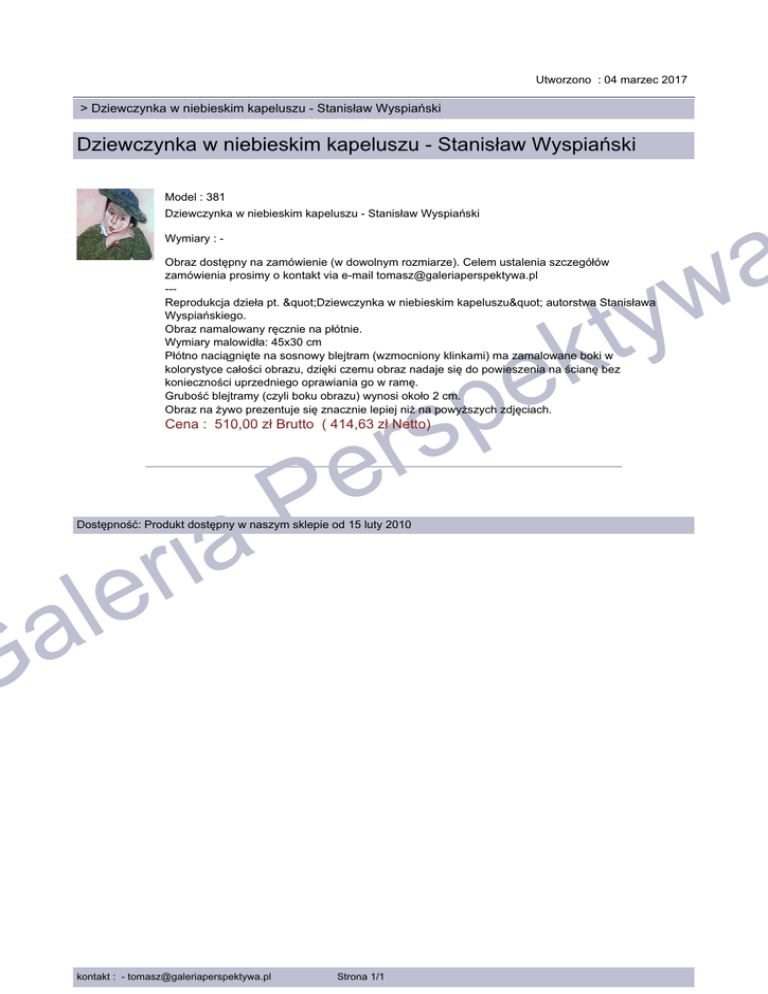 Utworzono : 04 marzec 2017 > Dziewczynka w niebieskim kapeluszu - Stanisław Wyspiański Dziewczynka w niebieskim kapeluszu - Stanisław Wyspiański Model : 381 Dziewczynka w niebieskim kapeluszu - Stanisław Wyspiański a w ty Wymiary : - Obraz dostępny na zamówienie (w dowolnym rozmiarze). Celem ustalenia szczegółów zamówienia prosimy o kontakt via e-mail [email protected] --Reprodukcja dzieła pt. "Dziewczynka w niebieskim kapeluszu" autorstwa Stanisława Wyspiańskiego. Obraz namalowany ręcznie na płótnie. Wymiary malowidła: 45x30 cm Płótno naciągnięte na sosnowy blejtram (wzmocniony klinkami) ma zamalowane boki w kolorystyce całości obrazu, dzięki czemu obraz nadaje się do powieszenia na ścianę bez konieczności uprzedniego oprawiania go w ramę. Grubość blejtramy (czyli boku obrazu) wynosi około 2 cm. Obraz na żywo prezentuje się znacznie lepiej niż na powyższych zdjęciach. p rs Cena : 510,00 zł Brutto ( 414,63 zł Netto) a i r e l a e P Dostępność: Produkt dostępny w naszym sklepie od 15 luty 2010 G kontakt : - [email protected] k e Strona 1/1
