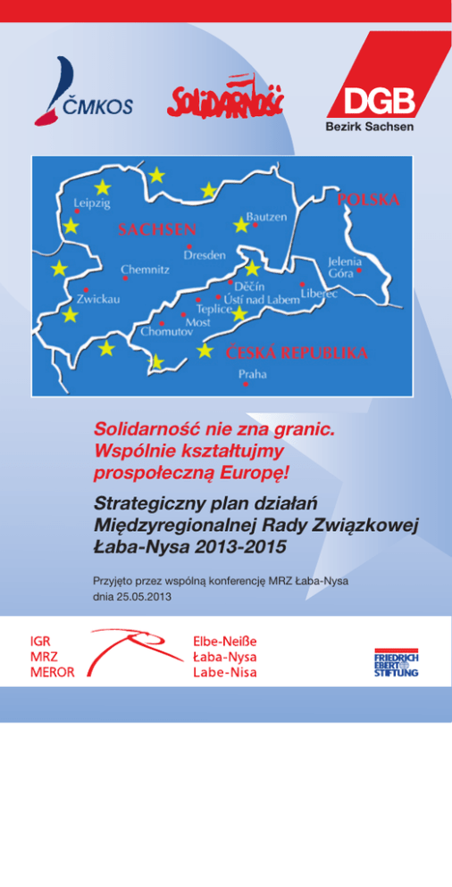 Bezirk Sachsen Solidarność nie zna granic. Wspólnie kształtujmy prospołeczną Europę! Strategiczny plan działań Międzyregionalnej Rady Związkowej Łaba-Nysa 2013-2015 Przyjęto przez wspólną konferencję MRZ Łaba-Nysa dnia 25.05.2013 REGIONALBÜRO SLOWAKISCHE REPUBLIK Międzyregionalna Rada Związkowa (MRZ) Łaba-Nysa od 20 lat angażuje się na rzecz solidarnego rozwoju pogranicza w Unii Europejskiej. Żyje ideą godzenia interesów i spójności sąsiadujących krajów i regionów. Od czasu swego utworzenia w 1993 r. MRZ wyprofilowała się jako społeczne sumienie i przyczyniła się do zrastania się wspólnego obszaru pogranicza. Spójność w Europie zagrożona jest wskutek kryzysu finansowego i gospodarczego oraz jednostronnej polityki cięć w państwach członkowskich Unii Europejskiej. Doprowadziły one do pogorszenia warunków życia i pracy w wielu krajach. Cięcia w inwestycjach, oświacie, zabezpieczeniu społecznym, wynagrodzeniach, szczególnie w krajach południowych odbierają ludziom perspektywy bezpiecznego życia. Szczególnie dramatyczne jest wysokie bezrobocie młodzieży przekraczające w niektórych krajach 50 proc. Wzrost zatrudnienia na umowy śmieciowe w prawie wszystkich krajach UE przyczynia się do niepewności społeczeństwa. Związki zawodowe w Europie i na Trójstyku opowiadają się za programem inwestycyjnym dla stworzenia przyszłościowego zatrudnienia i przezwyciężenia rozłamu w Europie. Unia Europejska musi przy tym zobowiązać się do postępu w sprawach społecznych. W ten sposób Unia Europejska mogłaby stać się kołem zamachowym dla sprawiedliwości społecznej w Europie. Koncentracja Unii Europejskiej i jej krajów członkowskich na kredo liberalnej gospodarki jeszcze bardziej się zaostrzyła. W standardowym katalogu znajdziemy: • • • • • • cięcia płac, świadczeń socjalnych itd. podnoszenie wieku emerytalnego i cięcia emerytur uelastycznianie rynku pracy i osłabianie ochrony przed wypowiedzeniem ograniczanie praw pracowniczych i związkowych kapitalizacja systemów zabezpieczenia społecznego prywatyzacja dóbr i usług publicznych Europa musi przeciwstawić się ingerencjom w zabezpieczenie społeczne, podstawowe prawa socjalne i prawa związkowe. W przeciwnym razie grozi nam konkurowanie najniższą osłoną socjalną i ochroną stosunku zatrudnienia. W najgorszym przypadku grozi nam wzmocnienie postaw nacjonalistycznych i skrajnie prawicowych w Europie i na pograniczu. W dalszym ciągu będziemy się temu sprzeciwiać działaniami transgranicznymi. Związki zawodowe opowiadają się za spójnością gospodarczą, społeczną i terytorialną. Zaostrzającej się konkurencji przeciwstawiamy zasadę solidarności. Naszym celem jest zabezpieczenie dobrych warunków pracy, nauki i życia, uczciwej mobilności i wysokiego zabezpieczenia społecznego we wszystkich regionach Europy. W ten sposób łączymy cele i pola działania w zakresie polityki gospodarczej, społecznej oraz polityki zatrudnienia. W celu kształtowania prospołecznej Europy Międzyregionalna Rada Związkowa Łaba-Nysa ściśle współpracuje z krajowymi federacjami związkowymi i ich strukturami oraz z Europejską Konfederacją Związków Zawodowych. Działania Międzyregionalnej Rady Związkowej Łaba-Nysa • • • • rozpowszechnianie inicjatyw międzyregionalnych poprzez poprawę komunikacji z centralnymi zarządami związków zawodowych i Europejską Konfederacją Związków Zawodowych, intensyfikacja współpracy z Parlamentem Europejskim, wzmacnianie pozycji Międzyregionalnych Rad Związkowych wobec Komisji Europejskiej, zwalczanie ekstremizmów poprzez wspólne akcje. Polityka strukturalna W traktacie lizbońskim Unia Europejska i państwa członkowskie zobowiązują się do polityki spójności gospodarczej, społecznej i terytorialnej. Celem europejskiej polityki strukturalnej jest rozwój Unii jako całości poprzez zmniejszanie istniejących różnic stanu zaawansowania poszczególnych regionów. Kryzys gospodarczy i finansowy w ostatnich latach ponownie zwiększył różnice między regionami. Dzięki strategii Europa 2020 w regionach ma się wspierać inteligentny, zrównoważony i sprzyjający włączeniu społecznemu wzrost. Do 2020 r. ma nastąpić poprawa w następujących polach działania: MRZ Łaba-Nysa • • • • • zwiększenie stopy zatrudnienia podniesienie udziału wydatków na badania i innowacje zmiany klimatu i energia (emisje gazów cieplarnianych, energie odnawialne, efektywność energetyczna) edukacja (obniżenie wskaźnika osób przedwcześnie kończących naukę, zwiększenie odsetka osób z wyższym wykształceniem) zwalczanie ubóstwa i wykluczenia społecznego. Europejskie Fundusze Strukturalne w perspektywie finansowej 2014-2020 będą skoncentrowane na te cele. Na Trójstyku Dolny Śląsk-Saksonia-północne Czechy istnieje w tych dziedzinach pilna potrzeba działania. Niedobory istnieją w szczególności w zakresie wskaźników zatrudnienia, innowacyjności i możliwości badawczo-rozwojowych przedsiębiorstw, kształcenia i doskonalenia zawodowego oraz zwalczania ubóstwa i wykluczenia społecznego. Aby rozwinąć Trójstyk jako spójny obszar gospodarki i pracy, Międzyregionalna Rada Związkowa Łaba-Nysa już od kilku lat postuluje opracowywanie kompleksowych koncepcji rozwoju regionalnego. Opowiadamy się przy tym za ścisłym powiązaniem działań z zakresu polityki gospodarczej i polityki rynku pracy. Przestrzeganie i forsowanie istniejących standardów pracy i standardów socjalnych jest naszym obowiązkiem. Przy kształtowaniu przemian strukturalnych na pograniczu Międzyregionalna Rada Związkowa stawia na rozwój i stabilizację regionalnych sieci i klastrów. Na pograniczach trzeba opracowywać i realizować wspólne strategie międzyregionalne, służące celowi zrównoważonego i przyszłościowego rozwoju. Nowoczesna międzyregionalna polityka strukturalna potrzebuje kom