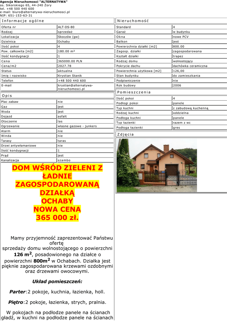 Agencja Nieruchomosci "ALTERNATYWA" os. Sikorskiego 65, 44-240 Żory tel. +48 500 440 600 e-mail: [email protected] NIP: 651-153-63-31 Informacje ogólne Nieruchomość Oferta nr ALT-DS-80 Standard 4 Rodzaj sprzedaż Garaż w budynku Lokalizacja Skoczów (gw) Okna nowe PCV Dzielnica Ochaby Balkon jest Ilość pokoi 4 Powierzchnia działki [m2] 800.00 Pow. całkowita [m2] 180.00 m² Zagosp. działki zagospodarowana Ilość kondygnacji 1 Kształt działki trapez Cena 365000.00 PLN Rodzaj domu wolnostojący Cena/m2 2027.78 Pokrycie dachu dachówka ceramiczna Status aktualna Powierzchnia użytkowa [m2] 126,00 Imię i nazwisko Krystian Stanik Stan budynku do zamieszkania Telefon +48 500 440 600 Podpiwniczenie nie E-mail [email protected] Rok budowy 2006 Pomieszczenia Opis Ilość pokoi 4 Plac zabaw nie Podłogi pokoi panele Gaz jest Typ kuchni z zabudową kuchenną Woda jest Rodzaj kuchni oddzielna Dojazd asfalt Podłoga kuchni panele Otoczenie las Typ łazienki razem z wc Ogrzewanie własne gazowe - junkers Podłoga łazienki gres Alarm nie Winda nie Tarasy taras Drzwi antywłamaniowe nie Ilość kondygnacji 1 Prąd jest Kanalizacja szambo DOM WŚRÓD ZIELENI Z ŁADNIE ZAGOSPODAROWANĄ DZIAŁKĄ OCHABY NOWA CENA 365 000 zł. Mamy przyjemność zaprezentować Państwu ofertę sprzedaży domu wolnostojącego o powierzchni 126 m2, posadowionego na działce o powierzchni 800m2 w Ochabach. Działka jest pięknie zagospodarowana krzewami ozdobnymi oraz drzewami owocowymi. Układ pomieszczeń: Parter:2 pokoje, kuchnia, łazienka, holl. Piętro:2 pokoje, łazienka, strych, pralnia. W pokojach na podłodze panele na ścianach gładź, w kuchni na podłodze panele na ścianach Zdjęcia płytki, łazienki w glazurze. Dom ogrzewany jest gazowo, kominek kaflowy ogrzewa 2 pokoje na górze. Woda ze studni, szambo trzykomorowe. Brama wjazdowa kuta na pilota, brama garażowa na pilota. Wideofon. Zapraszamy na prezentację. Zapewniamy Państwu przeprowadzenie transakcji od momentu prezentacji do chwili przekazania nieruchomości, oraz pomoc w uzyskaniu najdogodniejszego kredytu hipotecznego. Zapraszamy do odwiedzin naszej strony. www.alternatywa-nieruchomosci.pl Kontakt: Krystian Stanik tel. 500 440 600 [email protected] ( licencja zawodowa nr 21811 ) Nieruchomości "Alternatywa" Os. Sikorskiego 65 ( za sklepem meble Bodzio ) 44-240 Żory www.alternatywa-nieruchomosci.pl Agencja Nieruchomosci "ALTERNATYWA" os. Sikorskiego 65, 44-240 Żory tel. +48 500 440 600 e-mail: [email protected] NIP: 651-153-63-31
