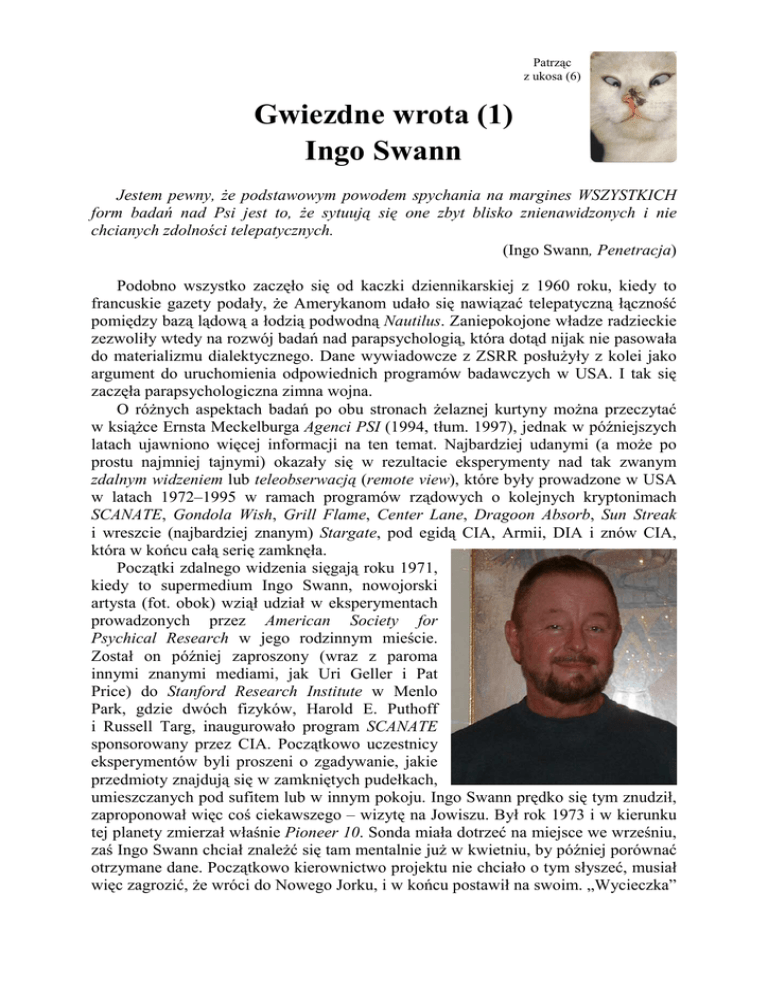 Patrząc z ukosa (6) Gwiezdne wrota (1) Ingo Swann Jestem pewny, Ŝe podstawowym powodem spychania na margines WSZYSTKICH form badań nad Psi jest to, Ŝe sytuują się one zbyt blisko znienawidzonych i nie chcianych zdolności telepatycznych. (Ingo Swann, Penetracja) Podobno wszystko zaczęło się od kaczki dziennikarskiej z 1960 roku, kiedy to francuskie gazety podały, Ŝe Amerykanom udało się nawiązać telepatyczną łączność pomiędzy bazą lądową a łodzią podwodną Nautilus. Zaniepokojone władze radzieckie zezwoliły wtedy na rozwój badań nad parapsychologią, która dotąd nijak nie pasowała do materializmu dialektycznego. Dane wywiadowcze z ZSRR posłuŜyły z kolei jako argument do uruchomienia odpowiednich programów badawczych w USA. I tak się zaczęła parapsychologiczna zimna wojna. O róŜnych aspektach badań po obu stronach Ŝelaznej kurtyny moŜna przeczytać w ksiąŜce Ernsta Meckelburga Agenci PSI (1994, tłum. 1997), jednak w późniejszych latach ujawniono więcej informacji na ten temat. Najbardziej udanymi (a moŜe po prostu najmniej tajnymi) okazały się w rezultacie eksperymenty nad tak zwanym zdalnym widzeniem lub teleobserwacją (remote view), które były prowadzone w USA w latach 1972–1995 w ramach programów rządowych o kolejnych kryptonimach SCANATE, Gondola Wish, Grill Flame, Center Lane, Dragoon Absorb, Sun Streak i wreszcie (najbardziej znanym) Stargate, pod egidą CIA, Armii, DIA i znów CIA, która w końcu całą serię zamknęła. Początki zdalnego widzenia sięgają roku 1971, kiedy to supermedium Ingo Swann, nowojorski artysta (fot. obok) wziął udział w eksperymentach prowadzonych przez American Society for Psychical Research w jego rodzinnym mieście. Został on później zaproszony (wraz z paroma innymi znanymi mediami, jak Uri Geller i Pat Price) do Stanford Research Institute w Menlo Park, gdzie dwóch fizyków, Harold E. Puthoff i Russell Targ, inaugurowało program SCANATE sponsorowany przez CIA. Początkowo uczestnicy eksperymentów byli proszeni o zgadywanie, jakie przedmioty znajdują się w zamkniętych pudełkach, umieszczanych pod sufitem lub w innym pokoju. Ingo Swann prędko się tym znudził, zaproponował więc coś ciekawszego – wizytę na Jowiszu. Był rok 1973 i w kierunku tej planety zmierzał właśnie Pioneer 10. Sonda miała dotrzeć na miejsce we wrześniu, zaś Ingo Swann chciał znaleŜć się tam mentalnie juŜ w kwietniu, by później porównać otrzymane dane. Początkowo kierownictwo projektu nie chciało o tym słyszeć, musiał więc zagrozić, Ŝe wróci do Nowego Jorku, i w końcu postawił na swoim. „Wycieczka” zakończyła się pełnym sukcesem, co oznacza, Ŝe większość zebranych danych została potwierdzona, a pozostałe nie zostały obalone. W szczególności Ingo Swann zobaczył, Ŝe Jowisz ma pierścień, czego wówczas nikt się nie spodziewał (oficjalnie odkrył go dopiero Voyager 1 w 1979 roku). Z czasem eksperymenty przekroczyły granice laboratorium i zaczęły obejmować najbliŜsze okolice. Wypracowano wtedy następujący schemat postępowania. Jedna osoba sporządzała listę celów, do których moŜna dojechać w ciągu pół godziny, po czym umieszczała kaŜdy z adresów w kopercie z sobie tylko znanym oznaczeniem kodowym. Inna osoba losowała jedną z kopert i przekazywała ją zespołowi, który wsiadał do samochodu i wyjeŜdŜał za miasto. Dopiero wtedy kopertę otwierano, aby poznać cel podróŜy, po czym ekipa o umówionej wcześniej godzinie przybywała na miejsce i rozpoczynała obserwację. W tym samym czasie zdalny obserwator, znający tylko oznaczenie kodowe, rozpoczynał mentalne namierzanie celu. Wspierał go w tym prowadzący (teŜ nie znający punktu docelowego), pełniący rolę stabilizatora. Chodzi mianowicie o to, Ŝe wizje obserwowanego obiektu odbiera podświadomość, natomiast świadomy umysł ma skłonność zakłócania przekazu, dodając od siebie wyobraŜenia oraz racjonalizacje. Prowadzący odgrywa więc rolę „świadomości zastępczej”, która podpowiada, czym naleŜy się zająć i w którą stronę skierować wewnętrzny wzrok zdalnego obserwatora. Ten z kolei mówi głośno o wszystkim, co widzi, sporządza teŜ rysunki, zanim świadomy umysł wtrąci swoje trzy grosze. Odbierane wraŜenia mają wyraźnie prawopółkulowy charakter i obejmują kształty, kolory, fakturę materiału, a takŜe temperaturę, smaki, zapachy i dźwięki. Z pozoru wydaje się, Ŝe mamy tu do czynienia z przekazem telepatycznym, jednak przykład Jowisza (a takŜe późniejsze eksperymenty) jasno pokazuje, Ŝe cel moŜna namierzyć takŜe wtedy, gdy nikt na niego nie patrzy. Zdalny obserwator ma zresztą najczęściej poczucie bilokacji (czyli przebywania w dwóch miejscach jednocześnie), moŜe takŜe, zgodnie z sugestią prowadzącego, obejrzeć obiekt np. z lotu ptaka. Przypomina to więc najbardziej podróŜe poza ciałem, o których pisałem poprzednim razem. JuŜ pierwsze eksperymenty ze zdalnym widzeniem były bardzo obiecujące, dotyczyły jednak ludzi wybitnie uzdolnionych, którzy mimo niekiedy spektakularnych sukcesów musieli nadal uczyć się na własnych błędach. Dalszy wysiłek zmierzał więc do wypracowania procedur, które umoŜliwiłyby specjalnie przeszkolonym ludziom osiąganie wysokiej niezawodności. Przy okazji zrezygnowano takŜe z zespołu obserwującego, który okazał się całkowicie zbędny. Odpowiednie procedury (tzw. protokoły) opracował Ingo Swann, stworzył teŜ tzw. metodę współrzędnych. Początkowo były to współrzędne geograficzne namierzanego obiektu, później zrezygnowano i z tego, ograniczając się do abstrakcyjnych oznaczeń kodowych, których sens znał (od razu lub później) jedynie zleceniodawca obserwacji. Swann uznał teŜ za konieczne włączenie do systemu szkoleń zdalnych obserwatorów zaliczenie kursu wychodzenia z ciała w The Monroe Institute. W rezultacie osiągnięto wysoką powtar