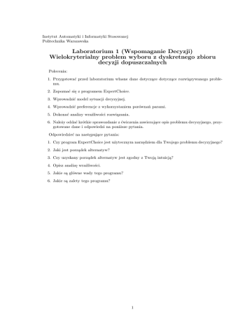 Instytut Automatyki i Informatyki Stosowanej Politechnika Warszawska Laboratorium 1 (Wspomaganie Decyzji) Wielokryterialny problem wyboru z dyskretnego zbioru decyzji dopuszczalnych Polecenia: 1. Przygotować przed laboratorium własne dane dotyczące dotyczące rozwiązywanego problemu. 2. Zapoznać się z programem ExpertChoice. 3. Wprowadzić model sytuacji decyzyjnej. 4. Wprowadzić preferencje z wykorzystaniem porównań parami. 5. Dokonać analizy wrażliwości rozwiązania. 6. Należy oddać krótkie sprawozdanie z ćwiczenia zawierające opis problemu decyzyjnego, przygotowane dane i odpowiedzi na poniższe pytania. Odpowiedzieć na następujące pytania: 1. Czy program ExpertChoice jest użytecznym narzędziem dla Twojego problemu decyzyjnego? 2. Jaki jest porządek alternatyw? 3. Czy uzyskany porządek alternatyw jest zgodny z Twoją intuicją? 4. Opisz analizę wrażliwości. 5. Jakie są główne wady tego programu? 6. Jakie są zalety tego programu? 1 Expert Choice uproszczona instrukcja obsługi 1 Tworzenie nowego modelu Wybieramy File - New, wpisujemy nazwę modelu. Wybieramy metodę budowy modelu “Direct“. 2 Definiowanie celu i dodawanie kryteriów W linii definiującej cel wprowadź definicję celu. Węzeł celu pojawi się u góry ekranu. W celu dodania węzłów kryteriów poniżej węzła celu wybierz Edit - Insert. Dodawać podkryteria kryterium można podobnie, wybierając Edit - Insert, podczas gdy kryterium jest podświetlone. Model nie musi być symetryczny. Można zdefiniować podkryteria dla pewnych kryteriów a dla innych - nie. 3 Wprowadzanie alternatyw i kopiowanie ich w obrębie modelu Wybierz węzeł, który ma być ojcem dla alternatyw. Wprowadź dla tego węzła alternatywy za pomocą operacji podobnych jak wyżej (Edit - Insert). Komenda Edit - Replicate - to all Leaves służy do kopiowania alternatyw do innych węzłów (wzdłuż dolnego poziomu drzewa). 4 Wprowadzanie porównań Następnie przechodzimy do fazy wprowadzania preferencji użytkownika. Preferencje mogą być wprowadzane poprzez porównania parami kryteriów i alternatyw. Żeby wstępnie porównać kryteria i alternatywy, należy wybrać ojca kryteriów lub alternatyw i wydać komendę Assessment Pairwise. Wybieramy typ porównań ”Preference”- dla alternatyw i ”Importance” dla kryteriów. Korzystamy z trybu ”Verbal”. Następnie odpowiadamy na wstępne pytania dotyczące alternatyw określając, czy jedna alternatywa jest bardziej, mniej, lub tak samo preferowana w stosunku do drugiej (wybierając More, Equally lub Less); możemy też tę fazę pracy pominąć wciskając Skip Preliminary Questions. Następnie określamy siłę preferencji zaznaczając nasz wybór na ”skali” (myszką lub kalwiszami strzałkowymi). Aby odwrócić kierunek dominacji alternatyw wciskamy Invert. Po zakończeniu ocen każdej pary wciskamy Enter. Po zakończeniu procesu oceny program przedstawia priorytety obliczone dla naszych porównań oraz współczynnik niespójności (Inconsistency Ratio) u góry ekranu. Jeśli ten współczynnik jest mniejszy od 0.10, to zachowujemy tak uzyskane priorytety (Record). W przeciwnym przypadku klikamy na Compare z dołu ekranu, wybieramy Matrix u góry i wykonujemy kroki opisane w punkcie ”Poprawa niespójności oceny”. Możliwe jest również dokonywanie porównań w tablicy lub z użyciem reprezentacji graficznej (z ekranu Assesment klikamy na Matrix, Questionnarie lub Graphics u góry ekranu). 5 Poprawianie niespójności oceny Bedąc w trybie Matrix wybieramy Inconsistency a następnie most dla najbardziej niespójnego lub second most dla dla drugiego co do niespójności porównania. Dalej wybieramy Best Fit program proponuje pewną wartość, która najbardziej zmniejsza niespójność. Jeśli chcemy zmienić nasze porównanie danej pary, wpisujemy inną wartość; wciskamy Calculate. Program pokazuje priorytety i poprawioną wartość współczynnika niespójności. Jeśli jesteśmy zadowoleni, klikamy na Record. W przeciwnym razie wybieramy ponownie Compare aby przejść przez etap sprawdzania niespójności (Inconsistency) 2 6 Synteza Po wprowadzeniu ocen/porównań dla wszystkich kryteriów, podkryteriów i alternatyw, jeśli wszystkim węzłom zostały już nadane wagi, wybieramy Synthesis z głównego okna a następnie from Goal. Można również syntetyzować rozpoczynając od jakiegokolwiek podświetlonego węzła. 7 Analiza wrażliwości Aby zbadać wrażliwość uzyskanego rozwiązania, wybieramy jeden z pięciu typów z podmenu Sensivity-Graphs w głównym oknie. 3