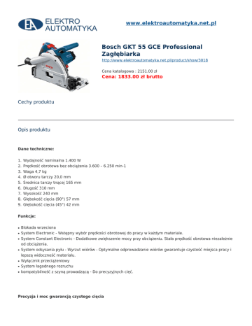www.elektroautomatyka.net.pl Bosch GKT 55 GCE Professional Zagłębiarka http://www.elektroautomatyka.net.pl/product/show/3018 Cena katalogowa : 2151.00 zł Cena: 1833.00 zł brutto Cechy produktu Opis produktu Dane techniczne: 1. 2. 3. 4. 5. 6. 7. 8. 9. Wydajność nominalna 1.400 W Prędkość obrotowa bez obciążenia 3.600 – 6.250 min-1 Waga 4,7 kg Ø otworu tarczy 20,0 mm Średnica tarczy tnącej 165 mm Długość 310 mm Wysokość 240 mm Głębokość cięcia (90°) 57 mm Głębokość cięcia (45°) 42 mm Funkcje: ● ● ● ● ● ● ● Blokada wrzeciona System Electronic - Wstępny wybór prędkości obrotowej do pracy w każdym materiale. System Constant Electronic - Dodatkowe zwiększenie mocy przy obciążeniu. Stała prędkość obrotowa niezależnie od obciążenia. System odsysania pyłu - Wyrzut wiórów - Optymalne odprowadzanie wiórów gwarantuje czystość miejsca pracy i lepszą widoczność materiału. Wyłącznik przeciążeniowy System łagodnego rozruchu kompatybilność z szyną prowadzącą - Do precyzyjnych cięć. Precyzja i moc gwarancją czystego cięcia ● ● ● ● Czyste, dokładne cięcia dzięki precyzyjnej tarczy pilarskiej oraz dopasowanemu systemowi szyn prowadzących z antyodpryskową listwą dociskającą Komfortową pracę, zwłaszcza w pomieszczeniach, zapewnia efektywny system odsysania pyłu i cicho działająca tarcza Regulacja prędkości obrotowej, wydajny silnik 1.400 W oraz system Constant Electronic umożliwiają cięcie różnych materiałów, np. drewna, płyt, aluminium i szkła akrylowego Precyzyjna regulacja kąta cięcia i głębokości cięcia zapewnia dokładność pracy W wyposażeniu standardowym: Nr katalogowy 0 601 675 001 L-BOXX 374, Wkład do L-BOXX na urządzenie ELEKTRO-AUTOMATYKA Sprzedaż elektronarzędzi, urządzeń spawalniczych, maszyn budowlanych, pneumatyki, narzędzi warsztatowych, firmowych ubrań roboczych oraz maszyn ogrodowo leśnych. Sklep Bochnia ul. Brzeska 50 32-700 Bochnia Sklep Brzesko ul. Szarych Szeregów 23 32-800 Brzesko Serwis, Magazyn ul. Św. Brata Alberta 4 32-800 Brzesko tel. 691 572 333 e-mail: [email protected] tel. 609 523 230 e-mail: [email protected] tel. 609 523 645 e-mail: [email protected]