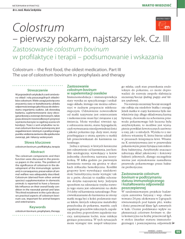 Do w WARTO WIEDZIEĆ WETERYNARIA W PRAKTYCE dr n. med. Maria Serdyńska POSŁUC EKSTRA TEKST Colostrum m – pierwszy pokarm, najstarszy lek. Cz. III m Zastosowanie colostrum bovinum w profilaktyce i terapii – podsumowanie i wskazania EKSTRA TEKST Colostrum – the first food, the oldest medication. Part III The use of colostrum bovinum in prophylaxis and therapy Streszczenie W poprzednich artykułach z serii omówiono skład i rolę poszczególnych składników colostrum. Wiele uwagi poświęcono znaczeniu siary w kształtowaniu układu odpornościowego jako klucza do dobrostanu organizmu ssaków. Jak dowodzą badania, suplementowanie siary obcogatunkowej u zwierząt domowych, także poza okresem noworodkowym przynosi wymierne korzyści w ogólnej ocenie ich kondycji. Trzeci z serii artykułów na temat colostrum bovinum poświęcony jest zagadnieniom istotnym z praktycznego punktu widzenia zarówno dla opiekunów zwierząt, jak i lekarzy weterynarii. Słowa kluczowe colostrum bovinum, profilaktyka, terapia Abstract The colostrum components and their function were discussed in the previous papers in the series. The problem of the significance of colostrum in the development of the immunologic system and, in consequence, preservation of animal welfare was adequately described. Colostrum (derived from other animal species) supplementation in domestic animals is reported to have a favourable influence on their overall body condition in the neonatal period and later. This third instalment in the cycle discusses practical aspects of colostrum bovinum use, important for animal keepers and veterinarians. Keywords colostrum bovinum, prophylaxis, therapy Zastosowanie colostrum bovinum w supelemntacji osesków Immunomodulacja i immunoprotekcja siary wynika ze specyficznego i unikalnego składu, którego nie można odtworzyć w żadnym preparacie mlekozastępczym. Odstawienie noworodków od matki nazywane jest osieroceniem i niekoniecznie musi być związane z jej śmiercią. Może wynikać również np. z odrzucenia miotu, stanu hypogalactii, czyli wytwarzania nieodpowiedniej ilości i jakości pokarmu (np. duży miot, stany przebiegające z utratą apetytu u matki) lub przeciwwskazań do karmienia naturalnego. Jedną z sytuacji, w których konieczne jest odstawienie od karmienia, jest konflikt serologiczny, wywołujący u kotów jednostkę chorobową nazwaną izoerytrolizą. W kilka godzin po pierwszym karmieniu rozwija się groźna w skutkach żółtaczka hemolityczna. Konflikt grupowy krwi wywołujący niedokrwistość hemolityczną może wystąpić także u psów, chociaż to rzadkie schorzenie dotyka najczęściej koty. Jedynym sposobem na odsunięcie ryzyka rozwoju tego stanu jest odstawienie na około 3-4 doby od karmienia naturalnego. Przeciwwskazaniami do karmienia ze strony matki mogą być z kolei: podawanie matce leków, których toksyczne metabolity przechodzą do pokarmu, mastitis, czyli zapalenie gruczołów mlecznych, zapalenie pochwy, poporodowe zapalenie macicy, zatrzymanie lochii, inne infekcje grożące posocznicą. W tych sytuacjach może wystąpić tzw. zespół toksyczne- DO O go mleka, czyli stan przenikania endotoksyn do pokarmu, co może doprowadzić do rozwoju zespołu słabnięcia szczeniąt/kociąt (fading puppy and kitten syndrome). Na rozwoju szczeniąt/kociąt szczególnie odbija się niedobór białka i energii. Linkowanie Jeżeli matka w ciąży karmiona była niewewnętrzne właściwie (np. długo składowaną karmą bytową), chorowała na schorzenia przewodu pokarmowego lub leczona była antybiotykami, to możliwe jest wystąpienie powikłań krwotocznych zarówno u niej, jak i u młodych. Wynika to z niedoboru witaminy K, która bierze udział w procesach krzepnięcia krwi. Witamina K syntetyzowana jest w przewodzie pokarmowym przez bytującą tam mikroflorę bakteryjną. Antybiotyki znacząco zaburzają skład jakościowy i ilościowy bakterii jelitowych, dlatego szczególnie istotne jest stymulowanie zasiedlenia przewodu pokarmowego przez bakterie probiotyczne. m m Lin zew Zastosowanie colostrum bovinum w podtrzymaniu statusu immunologicznego i kształtowaniu odpowiedzi poszczepiennej W randomizowanym projekcie badawczym autorstwa Satyaraj i wsp. obserwowano 24 psy, ulokowane w 2 grupach równoważnych pod kątem płci, wieku i ilości przeciwciał klasy IgA zawartych w kale. Ocenie poddawano wpływ suplementacji colostrum bovinum vs. dieta komercyjna na liczbę przeciwciał IgA w stolcu (marker statusu immunologicznego) i poszczepienną odpowiedź MARZEC • 3/2016 www.weterynaria.elamed.pl 99 WARTO WIEDZIEĆ układu odpornościowego. Obserwacja, podzielona na fazę wstępną i testową, trwała łącznie 48 tygodni. W czasie pierwszych 8 tygodni fazy wstępnej wszystkim zwierzętom podawano karmę komercyjną. Następnie wszystkie psy zaszczepiono szczepionką CDV (Canine Distemper Virus) zgodnie z rutynowym kalendarzem szczepień. Po zaszczepieniu psy z grupy badanej otrzymywały karmę komercyjną wzbogaconą o preparat colostrum bovinum, psy w drugiej grupie – kontrolnej, karmiono jak w fazie wstępnej (bez suplementacji colostrum bovinum). Do oceny statusu immunologicznego i odpowiedzi poszczepiennej posłużono się badaniami krwi żylnej, oceniając liczbę przeciwciał w surowicy oraz poziom białka C-reaktywnego. Analizowano również liczbę przeciwciał klasy IgA w stolcu zwierząt. Badania poziomu przeciwciał klasy IgG dokonywano co 8 tygodni od podania szczepionki. Maksymalny poziom przeciwciał notowano w 8. tygodniu fazy zasadniczej. Następnie zauważono, że pomiędzy 8. a 16. tyg. obserwacji dochodzi do szybkiego spadku liczby przeciwciał w grupie kontrolnej, natomiast w grupie badanej nie opisano takiego zjawiska. Do końca trwania badania poziom przeciwciał w grupie badanej utrzymywał się na stale wysokim poziomie, zbliżonym do najwyższej zanotowanej wartości. Również w grupie badanej znacząco wzrosła ilość wydzielnicz