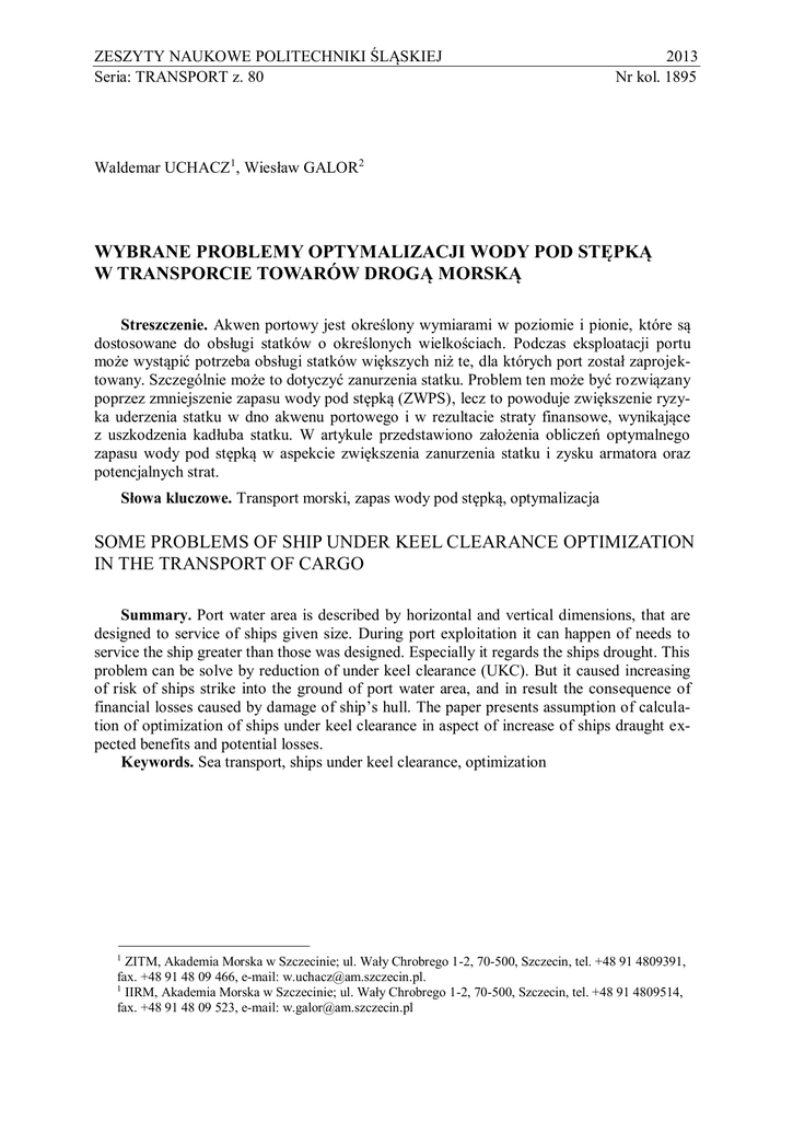 ZESZYTY NAUKOWE POLITECHNIKI ŚLĄSKIEJ Seria: TRANSPORT z. 80 2013 Nr kol. 1895 Waldemar UCHACZ1, Wiesław GALOR2 WYBRANE PROBLEMY OPTYMALIZACJI WODY POD STĘPKĄ W TRANSPORCIE TOWARÓW DROGĄ MORSKĄ Streszczenie. Akwen portowy jest określony wymiarami w poziomie i pionie, które są dostosowane do obsługi statków o określonych wielkościach. Podczas eksploatacji portu może wystąpić potrzeba obsługi statków większych niż te, dla których port został zaprojektowany. Szczególnie może to dotyczyć zanurzenia statku. Problem ten może być rozwiązany poprzez zmniejszenie zapasu wody pod stępką (ZWPS), lecz to powoduje zwiększenie ryzyka uderzenia statku w dno akwenu portowego i w rezultacie straty finansowe, wynikające z uszkodzenia kadłuba statku. W artykule przedstawiono założenia obliczeń optymalnego zapasu wody pod stępką w aspekcie zwiększenia zanurzenia statku i zysku armatora oraz potencjalnych strat. Słowa kluczowe. Transport morski, zapas wody pod stępką, optymalizacja SOME PROBLEMS OF SHIP UNDER KEEL CLEARANCE OPTIMIZATION IN THE TRANSPORT OF CARGO Summary. Port water area is described by horizontal and vertical dimensions, that are designed to service of ships given size. During port exploitation it can happen of needs to service the ship greater than those was designed. Especially it regards the ships drought. This problem can be solve by reduction of under keel clearance (UKC). But it caused increasing of risk of ships strike into the ground of port water area, and in result the consequence of financial losses caused by damage of ship’s hull. The paper presents assumption of calculation of optimization of ships under keel clearance in aspect of increase of ships draught expected benefits and potential losses. Keywords. Sea transport, ships under keel clearance, optimization ZITM, Akademia Morska w Szczecinie; ul. Wały Chrobrego 1-2, 70-500, Szczecin, tel. +48 91 4809391, fax. +48 91 48 09 466, e-mail: [email protected]. 1 IIRM, Akademia Morska w Szczecinie; ul. Wały Chrobrego 1-2, 70-500, Szczecin, tel. +48 91 4809514, fax. +48 91 48 09 523, e-mail: [email protected] 1 146 W. Uchacz, W. Galor 1. INTRODUCTION Many ports built in previous decades, are facing a need operation of ships larger than those for which it was designed. Construction of new port is associated with very high costs, are affected by, among other natural environmental conditions. In view of changing economic conditions, as well as geopolitical, in relatively short periods of time are changing the directions of transport. Due to the economics of building new ports, where the return on investment is very long, there is a high risk of investment profitable cost effectiveness. World fleet is characterized by a division into different groups of vessels, one of the marker is their size. An example might be a type “Baltimax” ships with maximum overall dimensions allow navigation through the Danish Straits. Type of these ships size is limited by fairway depth of at 15.4 m. Port water area is specified dimensions in the horizontal plane, and depth. Support for larger ships than originally planned, the port water area needs to be modernized through the reconstruction of individual building elements of port structure. However, there remains a serious problem of the depth of the basins, which for a given port is maintained at a fixed level, and the change (increase depth) is very expensive. Moreover, the deepening is not always acceptable, because it might hazard the stability of hydro technical constructions. This raises the problem of maximum exploit of an existing depth. Examples of ports with insufficient depth to handle of "Baltimax" ships, are the main Polish ports (Świnoujście, Gdynia and Gdańsk), where more and more ships call at more than planned for the port [6]. Maximum draft of these ships is more than acceptable for a given port. This raises the need to reduce their draft, in order to fit up to a maximum depth of the ports, and this makes this type of ship capacity is not fully utilized. 2. OWNERS PROFIT Owners profit associated with the operation of ships is the difference between the ships freight expense being charged for the carriage of cargo by sea and the cost of transportation services. The total cost associated with the operation of ships is divided into three elements [5]: costs of maintaining the ship, which are relatively stable and reflect the need to ship in constant operational stand by, costs of load and ships movement, depending on the size of the production of transport, administration costs (fixed coasts). (1) where: – owners profit, – freight, – ship’s operating costs. For bulk cargo the freight is depended on carried cargo volume. Some problems of ship under keel clearance optimization… 147 (2) where: – freight unit cargo, – volume of cargo. The volume of cargo for the type of vessel is dependent on the possibility of a ship loading. In the case of limitations due to insufficient depth of the port water area, the vessel can be loaded up to the draft resulting from the restrictions by under keel clearance. Hence: (3) where: – admissible ships drought resulting the depth of port water and ships under keel clearance, – cargo volume for given change of drought ship (i.e. for 1cm) Therefore, the owners profit increases for bulk cargo ships due to increasing of ships draught as result of under keel water decreasing- linear dependence (Fig.1). (4) where: – owners profit, – profit for maximal ships drought, – cargo volume for given change of draught ship, – ships under keel clearance. Rys. 1. Zysk armatora statku z tytułu przewozu ładunku Fig. 1. Owners profit as result of volume carriage cargo 148 W. Uchacz, W. Galor 3. THE COST OF THE SHIP HITS THE BOTTOM OF THR GROUND When a ship hits the bottom (Fig. 2), its hull presses on the ground which results in the passive ground pressure. That pressure is the ground reaction to the hu