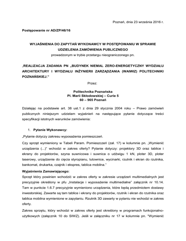 Poznań, dnia 23 września 2016 r. Postępowanie nr AD/ZP/46/16 WYJAŚNIENIA DO ZAPYTAŃ WYKONAWCY W POSTĘPOWANIU W SPRAWIE UDZIELENIA ZAMÓWIENIA PUBLICZNEGO prowadzonym w trybie przetargu nieograniczonego pn. „REALIZACJA ZADANIA PN „BUDYNEK NIEMAL ZERO-ENERGETYCZNY WYDZIAŁU ARCHITEKTURY I WYDZIAŁU INŻYNIERII ZARZĄDZANIA (WAIWIZ) POLITECHNIKI POZNAŃSKIEJ.” Przez: Politechnika Poznańska Pl. Marii Skłodowskiej – Curie 5 60 – 965 Poznań Działając na podstawie art. 38 ust.1 z dnia 29 stycznia 2004 roku – Prawo zamówień publicznych niniejszym udzielam wyjaśnień na następujące pytanie dotyczące treści specyfikacji istotnych warunków zamówienia: 1. Pytanie Wykonawcy: „Pytanie dotyczy zakresu wyposażenia pomieszczeń. Czy sprzęt wymieniony w Tabeli Param. Pomieszczeń (zał. 17) w kolumnie pn. „Wymienić urządzenia (...)” wchodzi w zakres oferty? Pytanie dotyczy: projektory 3D oraz tablice i ekrany do projektorów, szyna suwnicowa i suwnica o udźwigu 1 kN, ploter 3D, ploter laserowy, urządzenie do cięcia styropianu, lutownice, wycinarki, rzutnik i ekran do rzutnika, bankomat, drukarka, czajnik i ekspres, tablica mobilna.” Wyjaśnienia Zamawiającego: Sprzęt który powinien wchodzić w zakres oferty w zakresie urządzeń multimedialnych jest precyzyjnie określony w pfu „Instalacje i wyposażenie multimedialne” załącznik nr 10.14. Tam w punkcie 1.6.7 precyzyjnie wymieniono urządzenia, które będą przedmiotem dostawy inwestorskiej. Zawarte są tam tablice i ekrany do projektorów, rzutnik i ekran do rzutnika oraz tablica mobilna wymienione w zapytaniu. Rzutnik 3D zawarty w pytaniu nie wchodzi w zakres oferty. Zakres sprzętu, który wchodzi w zakres oferty jest określony w programach funkcjonalnoużytkowych (załącznik 10 do SIWZ). Jeśli w załączniku nr 17 w kolumnie pn. "Wymienić urządzenia (..)" wymieniono dla poszczególnych pomieszczeń konkretne urządzenia należy tę informację potraktować jako uzupełnienie opisu przeznaczenia pomieszczenia a nie wyposażenia, które musi być zawarte w ofercie. Zamawiający podtrzymuje postanowienia treści SIWZ. 2. Pytanie Wykonawcy: „Dotyczy zakresu wyposażenia pomieszczeń. Czy sprzęt AGD (lodówki, zmywarki, ekspresy, czajniki itp.) wchodzi w zakres oferty?” Wyjaśnienia Zamawiającego: Nie. Zamawiający podtrzymuje postanowienia treści SIWZ. 3. Pytanie Wykonawcy: „Dotyczy wyposażenia sanitariatów. Czy sanitariaty należy wyposażyć w elektryczne suszarki do rąk?” Wyjaśnienia Zamawiającego: Zgodnie z SIWZ – Dobór typu suszarek nastąpi na etapie projektu wykonawczego po przedstawieniu wzorów do akceptacji Zamawiający podtrzymuje postanowienia treści SIWZ. 4. Pytanie Wykonawcy: „Dotyczy wyposażenia sanitariatów. Proszę o zgrubne określenie standardu wyposażenia pomieszczeń sanitarnych w osprzęt typu dozowniki mydła, pojemniki na papier itd. Czy wystarczający będzie np. standard PCV czy należy ująć w ofercie osprzęt wykonany np. ze stali nierdzewnej.” Wyjaśnienia Zamawiającego: W ofercie należy ująć osprzęt dla pomieszczeń sanitarnych wykonany z materiałów zapewniających, zgodnie z SIWZ, jakość, trwałość, bezawaryjność. Szczegółowy dobór na etapie projektu wykonawczego Zamawiający podtrzymuje postanowienia treści SIWZ. 5. Pytanie Wykonawcy: „Dotyczy wykończenia stropów. Czy wykończenie stropów betonowych należy wykonać w technologii betonu architektonicznego? Jeśli nie, to czy przewiduje się tynkowanie i malowanie stropów betonowych?” Wyjaśnienia Zamawiającego: Zamawiający wymaga wykonania robót betonowych o podwyższonej jakości zgodnie z zapisami SIWZ. Nie przewiduje się tynkowania, W przypadkach określonych w projekcie wykonawczym aranżacji wnętrz dopuszcza się możliwość malowania Zamawiający podtrzymuje postanowienia treści SIWZ. 6. Pytanie Wykonawcy: „Prosimy o przesłanie zestawienia zewnętrznej stolarki okiennej PCW, zestawienia drzwi wewnętrznych oraz ślusarki aluminiowej dla fasad słupowo ryglowych od strony atrium. Wyjaśnienia Zamawiającego: Do odczytania z modelu BIM. Szczegółowy zakres zestawień należy określić w projekcie wykonawczym. Zamawiający podtrzymuje postanowienia treści SIWZ. 7. Pytanie Wykonawcy: „Dotyczy wyposażenia stolarki i ślusarki. Prosimy o podanie wymaganego wyposażenia dla stolarki i ślusarki (typ okuć, klamek, ilość samozamykaczy, kontroli dostępu itd.).” Wyjaśnienia Zamawiającego: Zakres wymaganego wyposażenia dla stolarki i ślusarki na potrzeby kontroli dostępu znajduje się w dokumencie SWIZ 10.18 w pkt. 2.3.3 Tabela 1. Wykaz przejść objętych KD znajduje się pkt. 2.4.1 Tabela 2. Typ okuć, klamek na etapie projektu wykonawczego po przedłożeniu wzorów do akceptacji. Zamawiający podtrzymuje postanowienia treści SIWZ. 8. Pytanie Wykonawcy: „Dotyczy technologii wykonania ścian wewnętrznych. Jakie są wymagania Zamawiającego odnośnie technologii wykonania ścian wydzielających pomieszczenie -1.16? Pytanie dotyczy ściany między osiami D i E oraz ściany między osiami 11 i 12.” Wyjaśnienia Zamawiającego: Pomieszczenie -1.16- ściany między osiami D i E – fasada atrium jak na kondygnacjach +1 i +2, pomieszczenie -1.16- ściany między osiami11 i 12 – ściana wewnętrzną szklana. Zamawiający podtrzymuje postanowienia treści SIWZ. 9. Pytanie Wykonawcy: „Dotyczy branży: instalacje elektryczne. Prosimy o podanie parametru: minimalny czasu pracy agregatu prądotwórczego w trakcie jego pracy, jako zasilanie rezerwowe.” Wyjaśnienia Zamawiającego: Minimalny czas pracy agregatu prądotwórczego w trakcie jego pracy, jako zasilanie rezerwowe wynosić będzie 8 godzin.. Zamawiający podtrzymuje postanowienia treści SIWZ. 10. Pytanie Wykonawcy: „Dotyczy wewnętrznych ścianek szklanych. Proszę o wyjaśnienie rozbieżności między udostępnionymi przez Zamawiającego rysunkami PFU i modelem BIM. Rozbieżnoś