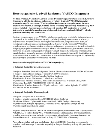 Rozstrzygnięcie 6. edycji konkursu VASCO Integracja W dniu 19 maja 2012 roku w Atrium Domu Dochodowego przy Placu Trzech KrzyŜy w Warszawie odbyło się oficjalne ogłoszenie wyników 6. edycji VASCO Integracja i wręczenie nagród laureatom. W tej edycji do konkursu przystąpiło ponad dwustu architektów wnętrz, a komisja, w skład której wchodzą wykładowcy warszawskiej ASP oraz architekci – laureaci poprzednich edycji, oceniała 177 projektów w dwóch kategoriach: projektów zrealizowanych i projektów koncepcyjnych. DOMO+ objęło patronat medialny nad konkursem. Konkurs organizowany przez VASCO, wiodącego producenta grzejników dekoracyjnych, w ciągu sześciu lat stał się jednym z największych i najbardziej renomowanych w branŜy projektowania wnętrz w Polsce. Głównym celem konkursu jest promowanie dobrych rozwiązań w zakresie zastosowania grzejników dekoracyjnych. Grzejniki VASCO są projektowane z myślą o architekturze, dlatego mają proste, geometryczne formy i znakomicie integrują się w przestrzeni nowoczesnych wnętrz. Architekci stosują je w swoich projektach, poniewaŜ mogą umieścić grzejnik w eksponowanych miejscach, tam gdzie wymagają tego zasady budowy systemów grzewczych i jednocześnie mogą mieć pewność, Ŝe dzięki swojemu ponadczasowemu wzornictwu i standardowi wykonania będzie on nawiązywał do najbardziej ekskluzywnych elementów wyposaŜenia wnętrza. Zwycięzcami 6 edycji Konkursu VASCO Integracja są: w kategorii Projektów Zrealizowanych: I miejsce: Stanisław Deńko i Małgorzata Deńko, Biuro Architektoniczne WIZJA z Krakowa II miejsce: Beata i Rafał Kołątaj , Firma IDEA 1990 z Krakowa III miejsce: Justyna Friedberg Morpho Studio z Krakowa WyróŜnienie: Łukasz Malinowski, LMarchitekt z Gliwic WyróŜnienie:. Mateusz Stolarski, Aleksandra Zdziechowska, Wojciech Jaksa, Piotr Walerysiak, TAMIZO ARCHITECTS GROUP z Łodzi WyróŜnienie: Ewelina Jankowska, Wojciech Gruszczyński, Alina Rybacka IPNOTIC ARCHITECTURE z Poznania w kategorii Projektów Koncepcyjnych: I miejsce: Grzegorz Pik z Wrocławia II miejsce: Marcin Lenczowski, ARCHITEKCIplus z Krakowa III miejsce: Edward Dylawerski, Katarzyna Sitnik, NUX Design z Warszawy WyróŜnienie: Katarzyna Rydzyńska, Martyna Nowak, Rydzyńska Design z Łodzi WyróŜnienie: Łukasz Rząd z Łodzi Nagroda specjalna rower STRIDA SX ufundowany przez partnera konkursu – dystrybutora ARCHICAD w Polsce firmę WSC Witold Szymanik i Spółka została przyznana autorom projektu koncepcyjnego za najlepiej przygotowaną wizualizację. Laureatami nagrody są Edward Dylawerski i Katarzyna Sitnik z firmy NUX DESIGN z Warszawy. Nagroda specjalna patrona medialnego - telewizji DOMO +, została przyznana dla projektu zrealizowanego. Laureatką nagrody jest Justyna Friedberg z firmy Morpho Studio z Krakowa. Zwycięskie projekty zrealizowane będą zaprezentowane w miesięczniku „Czas na Wnętrze”, który jest patronem prasowym konkursu. Rozdanie nagród 6. edycji konkursu odbyło się podczas uroczystej Gali, po części oficjalnej wystąpiła gwiazda wieczoru Ray Wilson z zespołem Genesis Quortet. Wszystkie informacje o konkursie i galerie nagrodzonych i wyróŜnionych projektów są na stronie www.ma.vascoart.pl Czytaj więcej: http://www.domoplus.pl/d_news_44_-rozstrzygniecie-6-edycji-konkursuvasco-integracja.html#ixzz2FbTdV8AD proj. Łukasz Rząd, źródło http://lukaszrzad.blogspot.com/ proj. Łukasz Rząd, źródło http://lukaszrzad.blogspot.com/ proj. Łukasz Rząd, źródło http://lukaszrzad.blogspot.com/