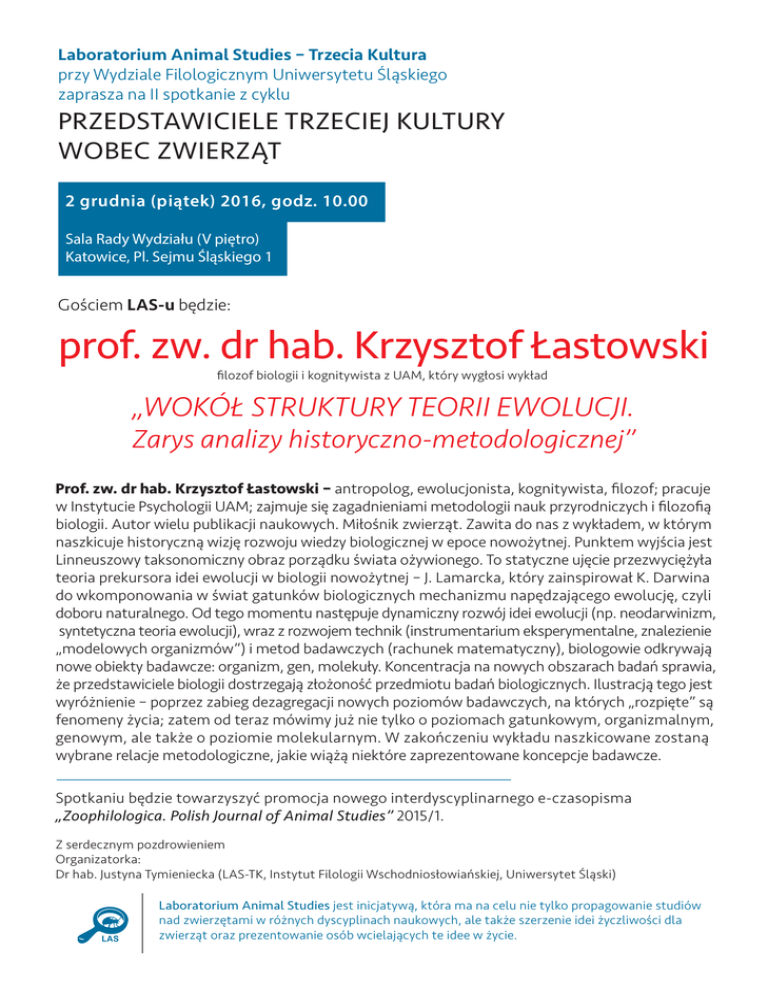 Laboratorium Animal Studies – Trzecia Kultura przy Wydziale Filologicznym Uniwersytetu Śląskiego zaprasza na II spotkanie z cyklu PRZEDSTAWICIELE TRZECIEJ KULTURY WOBEC ZWIERZĄT 2 grudnia (piątek) 2016, godz. 10.00 Sala Rady Wydziału (V piętro) Katowice, Pl. Sejmu Śląskiego 1 Gościem LAS-u będzie: prof. zw. dr hab. Krzysztof Łastowski filozof biologii i kognitywista z UAM, który wygłosi wykład „WOKÓŁ STRUKTURY TEORII EWOLUCJI. Zarys analizy historyczno-metodologicznej” Prof. zw. dr hab. Krzysztof Łastowski – antropolog, ewolucjonista, kognitywista, filozof; pracuje w Instytucie Psychologii UAM; zajmuje się zagadnieniami metodologii nauk przyrodniczych i filozofią biologii. Autor wielu publikacji naukowych. Miłośnik zwierząt. Zawita do nas z wykładem, w którym naszkicuje historyczną wizję rozwoju wiedzy biologicznej w epoce nowożytnej. Punktem wyjścia jest Linneuszowy taksonomiczny obraz porządku świata ożywionego. To statyczne ujęcie przezwyciężyła teoria prekursora idei ewolucji w biologii nowożytnej – J. Lamarcka, który zainspirował K. Darwina do wkomponowania w świat gatunków biologicznych mechanizmu napędzającego ewolucję, czyli doboru naturalnego. Od tego momentu następuje dynamiczny rozwój idei ewolucji (np. neodarwinizm, syntetyczna teoria ewolucji), wraz z rozwojem technik (instrumentarium eksperymentalne, znalezienie „modelowych organizmów”) i metod badawczych (rachunek matematyczny), biologowie odkrywają nowe obiekty badawcze: organizm, gen, molekuły. Koncentracja na nowych obszarach badań sprawia, że przedstawiciele biologii dostrzegają złożoność przedmiotu badań biologicznych. Ilustracją tego jest wyróżnienie – poprzez zabieg dezagregacji nowych poziomów badawczych, na których „rozpięte” są fenomeny życia; zatem od teraz mówimy już nie tylko o poziomach gatunkowym, organizmalnym, genowym, ale także o poziomie molekularnym. W zakończeniu wykładu naszkicowane zostaną wybrane relacje metodologiczne, jakie wiążą niektóre zaprezentowane koncepcje badawcze. Spotkaniu będzie towarzyszyć promocja nowego interdyscyplinarnego e-czasopisma „Zoophilologica. Polish Journal of Animal Studies” 2015/1. Z serdecznym pozdrowieniem Organizatorka: Dr hab. Justyna Tymieniecka (LAS-TK, Instytut Filologii Wschodniosłowiańskiej, Uniwersytet Śląski) Laboratorium Animal Studies jest inicjatywą, która ma na celu nie tylko propagowanie studiów nad zwierzętami w różnych dyscyplinach naukowych, ale także szerzenie idei życzliwości dla zwierząt oraz prezentowanie osób wcielających te idee w życie.