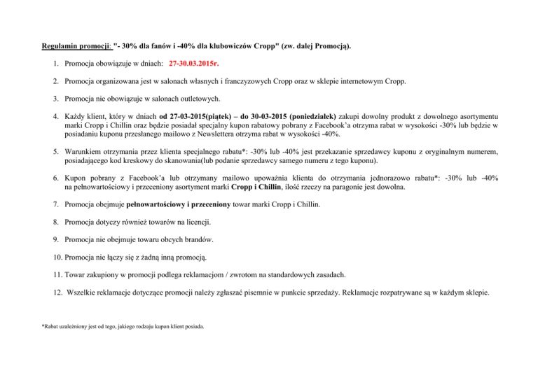 Regulamin promocji: "- 30% dla fanów i -40% dla klubowiczów Cropp" (zw. dalej Promocją). 1. Promocja obowiązuje w dniach: 27-30.03.2015r. 2. Promocja organizowana jest w salonach własnych i franczyzowych Cropp oraz w sklepie internetowym Cropp. 3. Promocja nie obowiązuje w salonach outletowych. 4. Każdy klient, który w dniach od 27-03-2015(piątek) – do 30-03-2015 (poniedziałek) zakupi dowolny produkt z dowolnego asortymentu marki Cropp i Chillin oraz będzie posiadał specjalny kupon rabatowy pobrany z Facebook’a otrzyma rabat w wysokości -30% lub będzie w posiadaniu kuponu przesłanego mailowo z Newslettera otrzyma rabat w wysokości -40%. 5. Warunkiem otrzymania przez klienta specjalnego rabatu*: -30% lub -40% jest przekazanie sprzedawcy kuponu z oryginalnym numerem, posiadającego kod kreskowy do skanowania(lub podanie sprzedawcy samego numeru z tego kuponu). 6. Kupon pobrany z Facebook’a lub otrzymany mailowo upoważnia klienta do otrzymania jednorazowo rabatu*: -30% lub -40% na pełnowartościowy i przeceniony asortyment marki Cropp i Chillin, ilość rzeczy na paragonie jest dowolna. 7. Promocja obejmuje pełnowartościowy i przeceniony towar marki Cropp i Chillin. 8. Promocja dotyczy również towarów na licencji. 9. Promocja nie obejmuje towaru obcych brandów. 10. Promocja nie łączy się z żadną inną promocją. 11. Towar zakupiony w promocji podlega reklamacjom / zwrotom na standardowych zasadach. 12. Wszelkie reklamacje dotyczące promocji należy zgłaszać pisemnie w punkcie sprzedaży. Reklamacje rozpatrywane są w każdym sklepie. *Rabat uzależniony jest od tego, jakiego rodzaju kupon klient posiada.