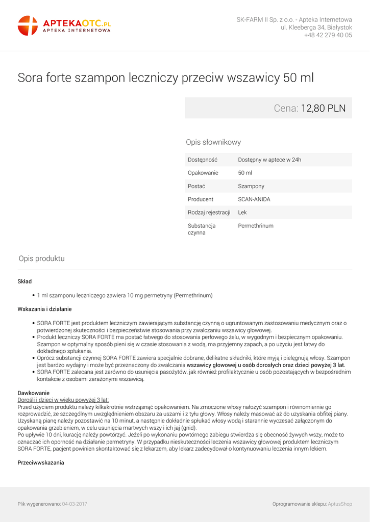SK-FARM II Sp. z o.o. - Apteka Internetowa ul. Kleeberga 34, Białystok +48 42 279 40 05 Sora forte szampon leczniczy przeciw wszawicy 50 ml Cena: 12,80 PLN Opis słownikowy Dostępność Dostępny w aptece w 24h Opakowanie 50 ml Postać Szampony Producent SCAN-ANIDA Rodzaj rejestracji Lek Substancja czynna Permethrinum Opis produktu Skład 1 ml szamponu leczniczego zawiera 10 mg permetryny (Permethrinum) Wskazania i działanie SORA FORTE jest produktem leczniczym zawierającym substancję czynną o ugruntowanym zastosowaniu medycznym oraz o potwierdzonej skuteczności i bezpieczeństwie stosowania przy zwalczaniu wszawicy głowowej. Produkt leczniczy SORA FORTE ma postać łatwego do stosowania perłowego żelu, w wygodnym i bezpiecznym opakowaniu. Szampon w optymalny sposób pieni się w czasie stosowania z wodą, ma przyjemny zapach, a po użyciu jest łatwy do dokładnego spłukania. Oprócz substancji czynnej SORA FORTE zawiera specjalnie dobrane, delikatne składniki, które myją i pielęgnują włosy. Szampon jest bardzo wydajny i może być przeznaczony do zwalczania wszawicy głowowej u osób dorosłych oraz dzieci powyżej 3 lat. SORA FORTE zalecana jest zarówno do usunięcia pasożytów, jak również profilaktycznie u osób pozostających w bezpośrednim kontakcie z osobami zarażonymi wszawicą. Dawkowanie Dorośli i dzieci w wieku powyżej 3 lat: Przed użyciem produktu należy kilkakrotnie wstrząsnąć opakowaniem. Na zmoczone włosy nałożyć szampon i równomiernie go rozprowadzić, ze szczególnym uwzględnieniem obszaru za uszami i z tyłu głowy. Włosy należy masować aż do uzyskania obfitej piany. Uzyskaną pianę należy pozostawić na 10 minut, a następnie dokładnie spłukać włosy wodą i starannie wyczesać załączonym do opakowania grzebieniem, w celu usunięcia martwych wszy i ich jaj (gnid). Po upływie 10 dni, kurację należy powtórzyć. Jeżeli po wykonaniu powtórnego zabiegu stwierdza się obecność żywych wszy, może to oznaczać ich oporność na działanie permetryny. W przypadku nieskuteczności leczenia wszawicy głowowej produktem leczniczym SORA FORTE, pacjent powinien skontaktować się z lekarzem, aby lekarz zadecydował o kontynuowaniu leczenia innym lekiem. Przeciwwskazania Plik wygenerowano: 04-03-2017 Oprogramowanie sklepu: AptusShop SK-FARM II Sp. z o.o. - Apteka Internetowa ul. Kleeberga 34, Białystok +48 42 279 40 05 Nadwrażliwość na substancję czynną – permetrynę, inne piretroidy, pyretryny lub na którąkolwiek substancję pomocniczą szamponu leczniczego. Produktu SORA FORTE nie należy stosować u dzieci w wieku poniżej 3 lat, ze względu na brak wystarczajacych danych dotyczących bezpieczeństwa stosowania. Informacje dodatkowe Przed użyciem zapoznaj się z ulotką dołączoną do opakowania, która zawiera wskazania, przeciwwskazania, dane dotyczące działań niepożądanych i dawkowanie oraz informacje dotyczące stosowania i przechowywania produktu leczniczego, bądź skonsultuj się z lekarzem lub farmaceutą, gdyż każdy lek niewłaściwie stosowany zagraża Twojemu życiu lub zdrowiu. Służymy Państwu pomocą pod adresem [email protected]. Plik wygenerowano: 04-03-2017 Powered by TCPDF (www.tcpdf.org) Oprogramowanie sklepu: AptusShop