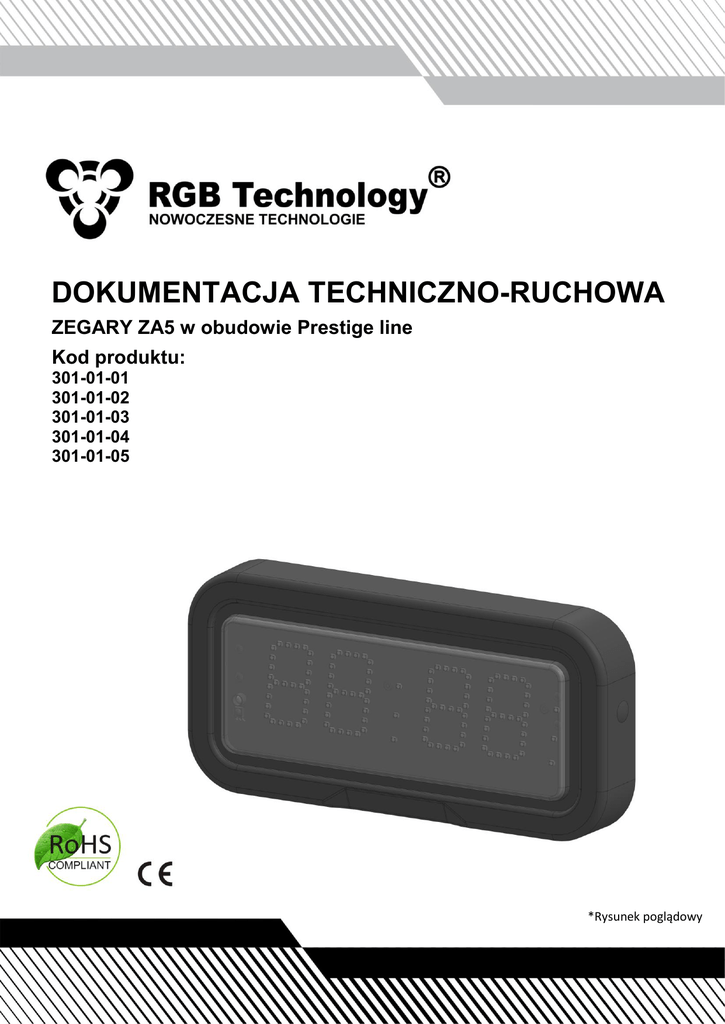 DOKUMENTACJA TECHNICZNO-RUCHOWA ZEGARY ZA5 w obudowie Prestige line Kod produktu: 301-01-01 301-01-02 301-01-03 301-01-04 301-01-05 *Rysunek poglądowy Spis Treści 1 Dane techniczne ................................................................................................................................................................. 3 2 Transport i magazynowanie ............................................................................................................................................... 3 3 Budowa urządzenia ............................................................................................................................................................ 3 3.1 3.1.1 3.2 3.2.1 4 Wykaz przewodów ............................................................................................................................................ 4 Wymiary urządzenia ZA5 ........................................................................................................................................... 4 Mocowanie urządzenia ZA5 .............................................................................................................................. 4 Montaż urządzenia ............................................................................................................................................................. 5 4.1 Urządzenia ZA5 .......................................................................................................................................................... 5 4.2 Konfiguracja ZA5 ........................................................................................................................................................ 5 4.2.1 5 Budowa zegarów ZA5 ................................................................................................................................................ 4 Konfiguracja urządzenia poprzez wbudowaną stronę WWW - Web panel ...................................................... 5 Moduł extendera compact-clock ........................................................................................................................................ 5 5.1 Opis złącz extendera compact-clock .......................................................................................................................... 6 6 Automatyczna regulacja jasności świecenia urządzenia .................................................................................................... 6 7 Moduł przekaźnika wykonawczego .................................................................................................................................... 6 7.1 8 Parametry przekaźnika wykonawczego ..................................................................................................................... 6 Opcje dodatkowe ............................................................................................................................................................... 7 8.1 Pilot IR ........................................................................................................................................................................ 7 8.2 Zasilanie PoE .............................................................................................................................................................. 7 8.3 Moduł GPS ................................................................................................................................................................. 7 8.4 Czujnik temperatury .................................................................................................................................................. 7 8.5 Sygnalizator dźwiękowy ............................................................................................................................................. 7 9 Pierwsze uruchomienie ...................................................................................................................................................... 7 10 Utylizacja i recykling ........................................................................................................................................................... 8 11 2 10.1 Recykling materiałów opakowania ............................................................................................................................ 8 10.2 Utylizacja urządzenia ................................................................................................................................................. 8 Najczęściej popełniane błędy podczas montażu ................................................................................................................ 8 DTR_301-01-XX-001_PL_f 1 Producent RGB Technology Sp. z o. o. Tymieo 18 76-035 Tymieo POLSKA 2 Dane techniczne Zegar ZA5 Wymiary urządzenia *mm+: Format Wyświetlania: Dopuszczalny zakres napięd wejściowych (długookresowo): Dopuszczalny zakres napięd wejściowych (krótkookresowo): Dopuszczalny zakres częstotliwości napięcia wejściowego: Wysokośd cyfry *mm]: Waga urządzenia: 1 Stopieo ochrony IP Średni pobór mocy urządzenia: Temperatura pracy (otoczenia): Temperatura pracy (powierzchnia urządzenia): 298 x 141 x 42 HH:MM 100 ÷ 240 VAC 85 ÷ 264 VAC 47 ÷ 63 Hz 50 0.95kg 66 5W -25°C ÷ 45°C -25°C ÷ 60°C Dostępne kolory diod wraz z numerem katalogowym: Numer katalogowy Kolor 301-01-01 301-01-02 301-01-03 301-01-04 301-01-05 Czerwony Zielony Niebieski Żółty Bursztynowy Tabela 1 3 Transport i magazynowanie Urządzenie jest wrażliwe na uszkodzenia mechaniczne. Należy zadbad aby na czas transportu było odpowiednio zabezpieczone tak, aby wyeliminowad ewentualne uszkodzenia. Zabrania się transportowad komponenty urządzenia osobno w opakowaniu zbiorczym - każdy element musi byd zapakowany oddzielnie i nie może mied możliwości ‘obijania’ się podcza