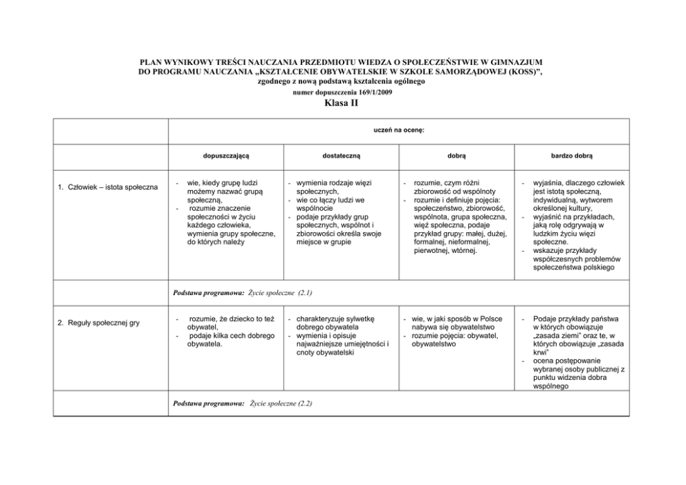 PLAN WYNIKOWY TREŚCI NAUCZANIA PRZEDMIOTU WIEDZA O SPOŁECZEŃSTWIE W GIMNAZJUM DO PROGRAMU NAUCZANIA „KSZTAŁCENIE OBYWATELSKIE W SZKOLE SAMORZĄDOWEJ (KOSS)”, zgodnego z nową podstawą kształcenia ogólnego numer dopuszczenia 169/1/2009 Klasa II uczeń na ocenę: dostateczną dopuszczającą 1. Człowiek – istota społeczna - - wie, kiedy grupę ludzi możemy nazwać grupą społeczną, rozumie znaczenie społeczności w życiu każdego człowieka, wymienia grupy społeczne, do których należy - wymienia rodzaje więzi społecznych, - wie co łączy ludzi we wspólnocie - podaje przykłady grup społecznych, wspólnot i zbiorowości określa swoje miejsce w grupie dobrą - rozumie, czym różni zbiorowość od wspólnoty rozumie i definiuje pojęcia: społeczeństwo, zbiorowość, wspólnota, grupa społeczna, więź społeczna, podaje przykład grupy: małej, dużej, formalnej, nieformalnej, pierwotnej, wtórnej. bardzo dobrą - - - wyjaśnia, dlaczego człowiek jest istotą społeczną, indywidualną, wytworem określonej kultury, wyjaśnić na przykładach, jaką rolę odgrywają w ludzkim życiu więzi społeczne. wskazuje przykłady współczesnych problemów społeczeństwa polskiego Podstawa programowa: Życie społeczne (2.1) 2. Reguły społecznej gry - rozumie, że dziecko to też obywatel, podaje kilka cech dobrego obywatela. - charakteryzuje sylwetkę dobrego obywatela - wymienia i opisuje najważniejsze umiejętności i cnoty obywatelski - wie, w jaki sposób w Polsce nabywa się obywatelstwo - rozumie pojęcia: obywatel, obywatelstwo - - Podstawa programowa: Życie społeczne (2.2) Podaje przykłady państwa w których obowiązuje „zasada ziemi” oraz te, w których obowiązuje „zasada krwi” ocena postępowanie wybranej osoby publicznej z punktu widzenia dobra wspólnego 3. Sztuka porozumiewania się. - - wymienia zasady uważnego słuchania, wyjaśnia pojęcia: nadawca, odbiorca rozumie, co znaczy skutecznie wyrażać własne zdanie, wyjaśnia pojęcia: polemika, sztuka przekonywania.. - rozumie i wyjaśnia pojęcia: komunikacja, komunikat, kodowanie, parafrazowanie, pytanie otwarte, zamknięte, tendencyjne, - podaje przykład pytań zamkniętych i otwartych. - wyjaśnia pojęcia: prezentacja, argument, kontrargument, , modulacja i ton głosu, gestykulacja, retoryka, - rozumie znaczenie umiejętności mówienia „nie”. - - - wyjaśnia, kiedy komunikacja miedzy ludźmi jest nieudana, rozumie znaczenie komunikatów niewerbalnych, wyjaśnia przyczyny nieporozumień między ludźmi rozumie znaczenie „mowy ciała” podczas wyrażania własnego zdania, potrafi sformułować tezę własnej opinii, potrafi być asertywnym. - - - - - - wyjaśnia, co zrobić, żeby emocje nie przeszkadzały w dobrej komunikacji, daje kilka dobrych rad, dzięki którym ludzie lepiej się komunikują, tłumaczy, co zakłóca komunikację między ludźmi, np. w rodzinie bądź grupie rówieśniczej potrafi sformułować własną opinię i poprzeć ją racjonalnymi argumentami, ocenia wystąpienie swoich kolegów pod kątem jasności i logiki argumentacji potrafi obronić swoje stanowisko w obliczu presji grupy, przygotowuje i wygłasza przed klasą przemówienie na wybrany przez siebie lub nauczyciela temat. Podstawa programowa: Podstawowe umiejętności życia w grupie (1.1) 4. Jak zdobywać informacje i jak z nich korzystać (edukacja czytelnicza i medialna) - wymienia główne źródła informacji, z których można czerpać informacje na tematy związane z życiem publicznym, - potrafi określić, z jakiego źródła w konkretnej sytuacji trzeba skorzystać, - potrafi sformułować pytania pozwalające uzyskać potrzebne informacje, - rozumie, dlaczego warto korzystać z rożnych źródeł informacji. Podstawa programowa: Środki masowego przekazu (3.3) - - uświadamia sobie, skąd mogą wynikać różnice w informacjach możliwych do uzyskania z różnych źródeł, wskazuje na najbardziej wiarygodne źródła informacji. - ocenia poszczególne źródła informacji, umie z nich korzystać, wyszukując dane na określone tematy. 5. Jak odróżnić opinie od faktów - - rozumie, na czym polega różnica między opinią i faktem, podaje przykład faktu i opinii. - potrafi ocenić w tekstach reklamowych elementy perswazyjne i informacyjne, - wyjaśnia pojęcia: fakt, opinia, perswazja, reklama - - rozumie, skąd mogą brać się różnice w interpretacji faktów przez różne osoby, grupy, instytucje, środki masowego przekazu, wyjaśnia pojęcia: propaganda, reklama podprogowa, manipulacja. - wymienia czynniki, które sprzyjają współpracy w grupie oraz ją utrudniają, podaje cechy charakteru, którymi powinien odznaczać się lider, wymienia kilka zasad promowania obywatelskich inicjatyw. - - - potrafi wytłumaczyć, jakie korzyści mogą wynikać z trafnego odróżnienia opinii od faktów, wskazać opinie i fakty w wypowiedziach dotyczących życia publicznego. podaje na przykładzie reklam, w jaki sposób jej twórcy próbują manipulować konsumentami. Podstawa programowa: Środki masowego przekazu (3.3) 6. Rodzaje grup społecznych. - Pozyskiwanie sojusznika. - podaje przykłady grup społecznych, do których należy, rozumie pojęcia: grupa społeczna, lider, sojusznik - podaje przykłady ról społecznych, - wyjaśnia pojęcia: grupa formalna, grupa nieformalna, mała, duża, pierwotna, wtórna, - podaje przykłady różnych rodzajów grup społecznych, - rozumie, jakie znaczenie dla powodzenia obywatelskiego projektu ma pozyskanie sojuszników. - - - - - charakteryzuje i ocenia wybrane role społeczne, określa, od czego zależy dobra atmosfera i współpraca w grupie (zilustrować to przykładami). potrafi pozyskać sojuszników do realizacji pracy domowej, którą należy wykonać w grupie, przy wsparciu osób trzecich. Podstawa programowa: Podstawowe umiejętności życia w grupie (1.3-4) Życie społeczne (2.2,4) 7. Negocjacje zamiast kłótni - definiuje poję