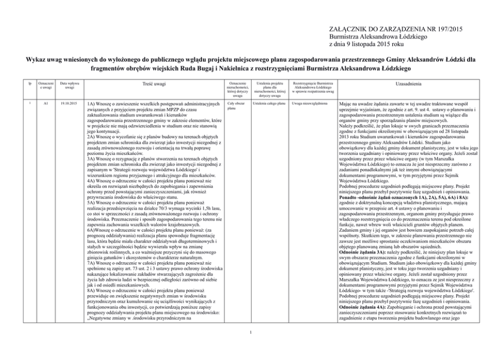 Wykaz uwag wniesionych do wyłożonego do publicznego wglądu projektu miejscowego planu zagospodarowania przestrzennego Gminy Aleksandrów Łódzki dla