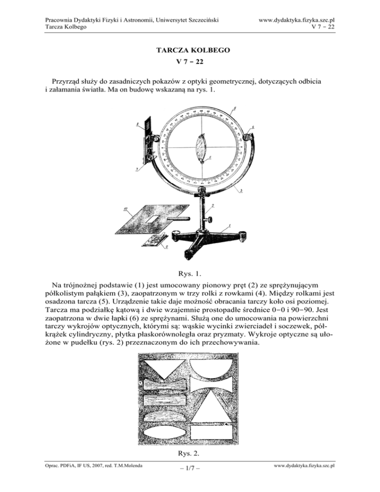 Pracownia Dydaktyki Fizyki i Astronomii, Uniwersytet Szczeciński Tarcza Kolbego www.dydaktyka.fizyka.szc.pl V 7 - 22 TARCZA KOLBEGO V 7 - 22 Przyrząd służy do zasadniczych pokazów z optyki geometrycznej, dotyczących odbicia i załamania światła. Ma on budowę wskazaną na rys. 1. Rys. 1. Na trójnożnej podstawie (1) jest umocowany pionowy pręt (2) ze sprężynującym półkolistym pałąkiem (3), zaopatrzonym w trzy rolki z rowkami (4). Między rolkami jest osadzona tarcza (5). Urządzenie takie daje możność obracania tarczy koło osi poziomej. Tarcza ma podziałkę kątową i dwie wzajemnie prostopadłe średnice 0-0 i 90-90. Jest zaopatrzona w dwie łapki (6) ze sprężynami. Służą one do umocowania na powierzchni tarczy wykrojów optycznych, którymi są: wąskie wycinki zwierciadeł i soczewek, półkrążek cylindryczny, płytka płaskorównoległa oraz pryzmaty. Wykroje optyczne są ułożone w pudełku (rys. 2) przeznaczonym do ich przechowywania. Rys. 2. Oprac. PDFiA, IF US, 2007, red. T.M.Molenda – 1/7 – www.dydaktyka.fizyka.szc.pl Pracownia Dydaktyki Fizyki i Astronomii, Uniwersytet Szczeciński Tarcza Kolbego www.dydaktyka.fizyka.szc.pl V 7 - 22 Najodpowiedniejszym źródłem światła dla tarczy Kolbego jest lampa łukowa Classena. Można się posługiwać również lampą 6 V w osłonie. Źródło światła ustawiamy z boku tarczy w odległości około 0,5 metra od niej. Światło kierujemy stycznie do powierzchni tarczy. Do otrzymania wąskiej smugi światła, czyli tak zwanego w optyce geometrycznej promienia świetlnego, służy przesłona (7) z otworem prostokątnym, którą się przykręca do pałąka na takiej wysokości, aby środek otworu znalazł się na wysokości środka tarczy. Przesłona ma prowadnicę. W nią wsuwa się płytkę z jedną, trzema i pięcioma szczelinami (8). Zależnie od położenia tej płytki otrzymujemy na tarczy jeden, trzy lub pięć promieni. Równoległość promieni można korygować przesuwając w tę lub tamtą stronę kondensor przy lampie. Jeżeli potrzebny jest pojedynczy promień o zmiennej szerokości, to do prowadnicy przesłony (7) wsuwamy szczelinę regulowaną (9). Kontrast między promieniami a tłem tarczy powiększa się, jeżeli między lampą a tarczą umieścimy na statywie przesłonę (10) zaopatrzoną w uchwyt. Otwór przesłony powinien być na wysokości szczelin. Promienie świetlne powinny być widoczne wzdłuż całej szerokości tarczy. Aby to osiągnąć, obracamy nieznacznie podstawę tarczy w jedną i drugą stronę koło osi pionowej przechodzącej przez środek tarczy. Za pomocą tarczy Kolbego można przerobić następujące doświadczenia. 1. Odbicie światła. Zwierciadło p ł a s k i e (rys. 3) Rys. 3. Teraz obracamy tarczę o pewien kąt. Normalna zwierciadła, czyli średnica 0-0, odsuwa się od promienia padającego o ten sam kąt. Odsuwa się też i promień odbity. W każdej pozycji tarczy można odczytać na skali kąty padania i odbicia. Kąty te są równe (rys. 3b i 3c). Może się zdarzyć, że promienia odbitego nie będzie widać na tarczy lub też będzie on widoczny tylko w pobliżu zwierciadła. Ten przypadek zachodzi wówczas, gdy płaszczyzna zwierciadeł nie jest prostopadła do płaszczyzny tarczy. Należy wtedy pod jedną lub drugą krawędź zwierciadła podłożyć skrawek grubszego papieru. Doświadczenie powtarzamy stosując przesłonę z 3 i 5 szczelinami. Uwaga. Doświadczenie opisane wyżej - poza stwierdzeniem zasadniczego prawa odbicia światła – daje okazję do zwrócenia uwagi na następującą zależność. Kiedy względem nieruchomego promienia świetlnego padającego na zwierciadło obrócimy to zwierciadło o kąt φ, to promień odbity odchyli się od swego poprzedniego kierunku o kąt 2 φ. Oprac. PDFiA, IF US, 2007, red. T.M.Molenda – 2/7 – www.dydaktyka.fizyka.szc.pl Pracownia Dydaktyki Fizyki i Astronomii, Uniwersytet Szczeciński Tarcza Kolbego www.dydaktyka.fizyka.szc.pl V 7 - 22 2. Zwierciadło wklęsłe (rys. 4) Rys. 4. Pod łapkami umieszczamy zwierciadło wklęsłe tak, aby średnica 0-0 była jego główną osią optyczną. Kierujemy promień pojedynczy wzdłuż osi. Promień odbity pokrywa się z padającym (rys. 4a). Obracamy tarczę o pewien kąt. Promień padający i odbity tworzą z osią równe kąty. Przesuwamy na pałąku przesłonę ze szczeliną do góry. Podwyższamy cokolwiek lampę, aby promień biegł równolegle do osi zwierciadła i padał na nie blisko górnego brzegu. Promień odbity przecina oś zwierciadła w ognisku głównym - rzeczywistym (rys. 4b). Kierujemy na zwierciadło wiązkę pięciu promieni równoległych, przy tym tak, że środkowy biegnie wzdłuż średnicy 0-0. promienie po dobiciu przecinają się na osi zwierciadła w ognisku rzeczywistym (rys. 4c). 3. Zwierciadło wypukłe (rys. 5) Rys. 5. Zwracamy zwierciadło stroną wypukłą ku szczelinom i przerabiamy te same doświadczenia co w p. 2. Wynik ich: zwierciadło rozprasza promienie, ognisko jest urojone Oprac. PDFiA, IF US, 2007, red. T.M.Molenda – 3/7 – www.dydaktyka.fizyka.szc.pl Pracownia Dydaktyki Fizyki i Astronomii, Uniwersytet Szczeciński Tarcza Kolbego 4. www.dydaktyka.fizyka.szc.pl V 7 - 22 Z a ł a m a n i e ś w i a t ł a . W s p ó ł c z y n n i k z a ł a m a nia (rys. 6) Rys. 6. sin α = n = const. sin β Na tarczy umieszczamy półkrążek szklany tak, że płaska jego ścianka przylega do średnicy 90-90, a średnica 0-0 trafia w środek geometryczny dolnej podstawy. Tarczę ustawiamy tak, aby promień z pojedynczej zwężonej szczeliny biegł wzdłuż średnicy 0-0. Kąt padania jest 0, promień wchodzi bez załamania do szkła i trafia na powierzchnię walcową również pod kątem 0. Wychodzi więc ze szkła do powietrza bez załamania. Obracamy tarczę o kąt α ; odczytujemy go na skali między promieniem padającym a średnicą 0-0. Zjawia się promień odbity, nachylony do normalnej pod kątem α (na rysunku ni