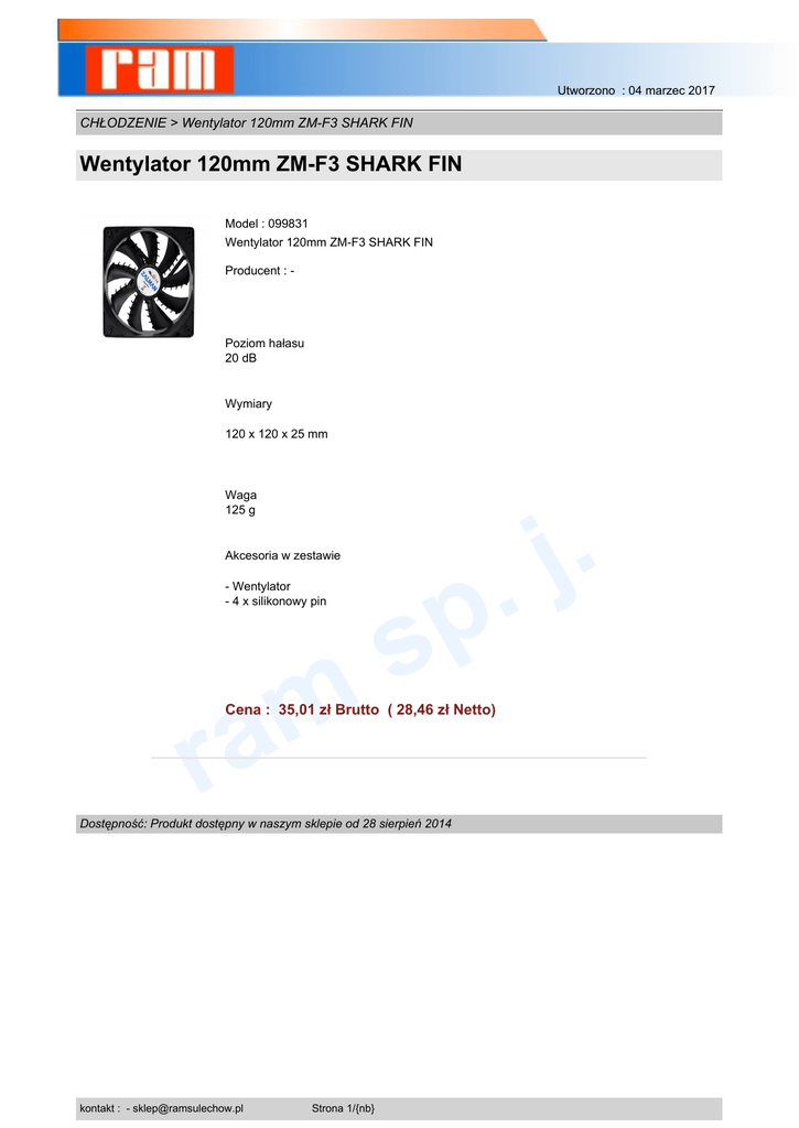 Utworzono : 04 marzec 2017 CHŁODZENIE > Wentylator 120mm ZM-F3 SHARK FIN Wentylator 120mm ZM-F3 SHARK FIN Model : 099831 Wentylator 120mm ZM-F3 SHARK FIN Producent : - Poziom hałasu 20 dB Wymiary 120 x 120 x 25 mm . j . Waga 125 g Akcesoria w zestawie - Wentylator - 4 x silikonowy pin m a r p s Cena : 35,01 zł Brutto ( 28,46 zł Netto) Dostępność: Produkt dostępny w naszym sklepie od 28 sierpień 2014 kontakt : - [email protected] Strona 1/{nb}
