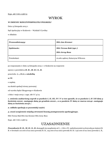 Sygn. akt I ACa 1158/15 WYROK W IMIENIU RZECZYPOSPOLITEJ POLSKIEJ Dnia 13 listopada 2015 r. Sąd Apelacyjny w Krakowie – Wydział I Cywilny w składzie: Przewodniczący: SSA Jan Kremer Sędziowie: SSA Teresa Rak (spr.) SSA Jerzy Bess Protokolant: st.sekr.sądowy Katarzyna Wilczura po rozpoznaniu w dniu 13 listopada 2015 r. w Krakowie na rozprawie sprawy z powództwa H. B. ,M. B. i Ł. B. przeciwko (...) S.A. z siedzibą w W. o zapłatę na skutek apelacji strony pozwanej od wyroku Sądu Okręgowego w Krakowie z dnia 7 maja 2015 r. sygn. akt I C 4/14 1. zmienia zaskarżony wyrok w punkcie I, II, III, IV i V w ten sposób, że w punkcie I, II i III datę 5 kwietnia 2010r. zastępuje datą 30 grudnia 2010r., a w punkcie IV datę 21 marca 2014r. zastępuje datą 21 kwietnia 2014r.; 2. oddala apelację w pozostałej części; 3. znosi wzajemnie między stronami koszty postępowania apelacyjnego. SSA Teresa Rak SSA Jan Kremer SSA Jerzy Bess Sygn. akt I ACa 1158/15 UZASADNIENIE Powodowie H. B., M. B. i Ł. B. domagali się zasądzenia od (...) SA w W. zadośćuczynień za krzywdę po śmierci B. B. w kwotach 110.000 zł na rzecz powoda H. B., 125.000 zł na rzecz powoda M. B. i 130.000 zł na rzecz powoda Ł. B., z odsetkami od dnia 5 kwietnia 2010 roku do dnia zapłaty. Dodatkowo powód H. B. wniósł o zasądzenie na jego rzecz kwoty 7.000 zł z ustawowymi odsetkami od dnia wytoczenia powództwa tytułem zwrotu kosztów pogrzebu. Wnieśli też powodowie o zasądzenie kosztów postępowania. Podali, że w dniu 2 grudnia 2009 roku w wyniku obrażeń doznanych w wypadku komunikacyjnym zginęła B. B.. Sprawca wypadku od odpowiedzialności cywilnej ubezpieczony był w pozwanym Towarzystwie. Szkodę powodowie zgłosili w dniu 4 marca 2010 roku. W postępowaniu likwidacyjnym ubezpieczyciel każdemu z powodów wypłacił kwoty pieniężne tytułem zadośćuczynienia po śmierci matki i żony oraz dodatkowo H. B. z tytułu odszkodowania za znaczne pogorszenie się sytuacji życiowej po śmierci żony i tytułem zwrotu kosztów pogrzebu. B. B. w chwili śmierci miała 49 lat, była aktywną, energiczną osobą, kochającą żoną i matką, wspierała całą rodziną, mąż i synowie mogli na nią liczyć. Nagła śmierć żony stała się przyczyną ogromnej rozpaczy i poczucia osamotnienia powoda H. B.. Z dnia na dzień powód stał się bezradny, zagubiony. Powód M. B. po śmierci matki musiał zmienić plany życiowe, nie mógł rozpocząć studiów, ponieważ nie dysponował odpowiednimi środkami pieniężnymi na ponoszenie wydatków z tym związanych. Nie mógł także poradzić sobie z uczuciem pustki i osamotnienia, bowiem pomimo osiągniętej pełnoletniości więź między powodem, a matką była bardzo silna. Ł. B. w chwili śmierci matki przebywał we Francji. Kilka miesięcy przed tym zdarzeniem ożenił się i rozpoczął budowę własnego domu , którą zajmowała się zmarła matka. Powód na nowo musiał zorganizować życie tak w kraju jak i zagranicą. Wszyscy powodowie po śmierci matki i żony cierpieli na bezsenność, bóle głowy, permanentne zmęczenie i rozdrażnienie. Strona pozwana (...) S.A. z siedzibą w W. wniosła o oddalenie powództwa i zasądzenie kosztów. Uznała jednak powództwo co do kwoty 7.000 zł z tytułu zwrotu kosztów za nagrobek, podnosząc, że to roszczenie nie było zgłaszane w postępowaniu likwidacyjnym, zatem 30 – dniowy termin na spełnienie świadczenia należy liczyć od dnia kiedy otrzymała pozew czyli 21 marca 2014 roku. Nieuzasadnione jest zatem żądanie zasądzenia odsetek od tej kwoty od dnia wniesienia pozwu. Wskazała też, że doliczając to co powodowie otrzymali, to każdy z nich domaga się kwoty 150.000 zł. Żądanie takie należy zaś uznać za rażąco wygórowane i odbiegające od kwot zasądzanych w tego rodzaju sprawach. Wyrokiem z dnia 7 maja 2015 roku Sąd Okręgowy w Krakowie zasądził od strony pozwanej na rzecz powoda H. B. kwotę 40.000 zł, na rzecz powoda M. B. kwotę 45.000 zł i na rzecz powoda Ł. B. kwotę 40.000 zł, wszystkie kwoty z odsetkami od dnia 5 kwietnia 2010 roku do dnia zapłaty. Zasądził nadto odsetki ustawowe od kwoty 7.000 zł od dnia 21 marca 2014 roku do dnia 22 maja 2014 roku. W pozostałym zakresie powództwa oddalił. Ponadto nakazał ściągnąć na rzecz Skarbu Państwa – Sądu Okręgowego w Krakowie kwotę 355,86 zł tytułem zwrotu wydatków i ustalił , że na zasadzie art. 100 kpc strony ponoszą koszty postępowania stosownie do wyników postępowania pozostawiając ich wyliczenie referendarzowi sądowemu. Rozstrzygnięcie wydał Sąd w oparciu o następujące okoliczności niesporne i ustalenia faktyczne: W dniu 2 grudnia 2009 roku kierujący samochodem H. G. nr rej (...) E. J. nie udzielił pierwszeństwa jadącej na rowerze B. B. i potrącił ją. B. B. doznała ciężkich obrażeń ciała, w konsekwencji których zmarła w dniu 2 stycznia 2010 roku. Sprawca za spowodowanie wypadku ze skutkiem śmiertelnym został prawomocnie skazany przez Sąd Rejonowy w O. (sygn. akt II K 237/10). Samochód ubezpieczony był u strony pozwanej. Pismem z dnia 4 marca 2010 roku powodowie zgłosili ubezpieczycielowi szkodę. Pozwany wypłacił H. B. kwotę 40.000 zł zadośćuczynienia po śmierci żony B. B., kwotę 30.000 zł tytułem odszkodowania za znaczne pogorszenie się sytuacji życiowej po śmierci żony oraz kwotę 9.885 zł tytułem zwrotu kosztów pogrzebu; Ł. B. 20 000 zł tytułem zadośćuczynienia po śmierci matki oraz M. B. kwotę 25 000 zł tytułem zadośćuczynienia po śmierci matki i kwotę 20 000 zł tytułem znacznego pogorszenia się sytuacji życiowej po śmierci matki B. B.. B. B. miała 49 lat. H. B. i B. B. byli małżeństwem przez 27 lat. Relacje między nimi były bardzo dobre, razem budowali dom, wspólnie podejmowali decyzje, wychowywali dzieci, razem chodzili na imprezy rodzinne, a przede wszystkim wspierali się. Mieszkali z synem M.. B. B. poza pracą 