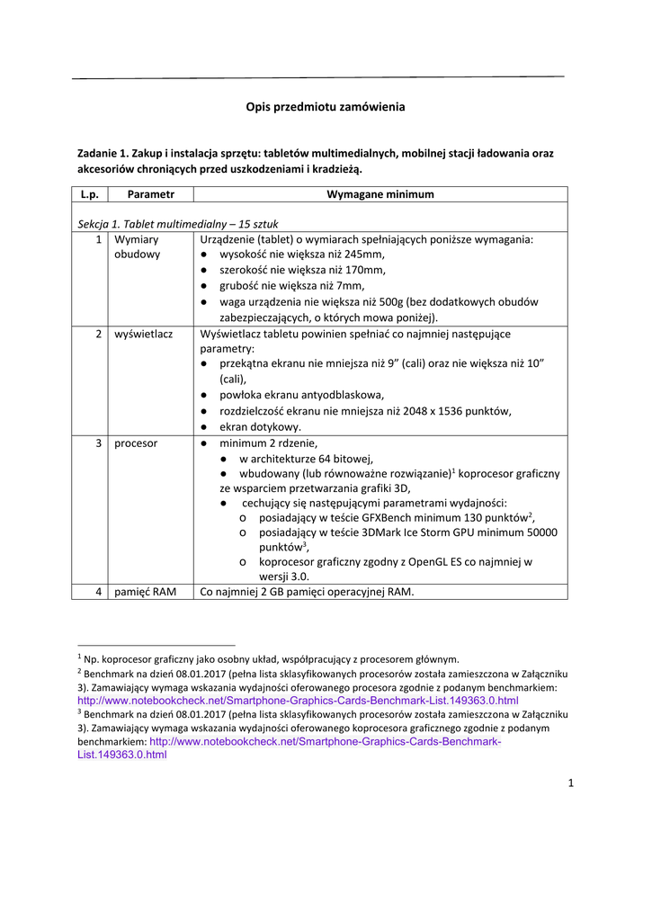 Opis przedmiotu zamówienia Zadanie 1. Zakup i instalacja sprzętu: tabletów multimedialnych, mobilnej stacji ładowania oraz akcesoriów chroniących przed uszkodzeniami i kradzieżą. L.p. Parametr Wymagane minimum Sekcja 1. Tablet multimedialny – 15 sztuk 1 Wymiary Urządzenie (tablet) o wymiarach spełniających poniższe wymagania: obudowy ● wysokość nie większa niż 245mm, ● szerokość nie większa niż 170mm, ● grubość nie większa niż 7mm, ● waga urządzenia nie większa niż 500g (bez dodatkowych obudów zabezpieczających, o których mowa poniżej). 2 wyświetlacz Wyświetlacz tabletu powinien spełniać co najmniej następujące parametry: ● przekątna ekranu nie mniejsza niż 9” (cali) oraz nie większa niż 10” (cali), ● powłoka ekranu antyodblaskowa, ● rozdzielczość ekranu nie mniejsza niż 2048 x 1536 punktów, ● ekran dotykowy. 3 procesor ● minimum 2 rdzenie, ● w architekturze 64 bitowej, ● wbudowany (lub równoważne rozwiązanie)1 koprocesor graficzny ze wsparciem przetwarzania grafiki 3D, ● cechujący się następującymi parametrami wydajności: o posiadający w teście GFXBench minimum 130 punktów2, o posiadający w teście 3DMark Ice Storm GPU minimum 50000 punktów3, o koprocesor graficzny zgodny z OpenGL ES co najmniej w wersji 3.0. 4 pamięć RAM Co najmniej 2 GB pamięci operacyjnej RAM. 1 Np. koprocesor graficzny jako osobny układ, współpracujący z procesorem głównym. Benchmark na dzień 08.01.2017 (pełna lista sklasyfikowanych procesorów została zamieszczona w Załączniku 3). Zamawiający wymaga wskazania wydajności oferowanego procesora zgodnie z podanym benchmarkiem: http://www.notebookcheck.net/Smartphone-Graphics-Cards-Benchmark-List.149363.0.html 3 Benchmark na dzień 08.01.2017 (pełna lista sklasyfikowanych procesorów została zamieszczona w Załączniku 3). Zamawiający wymaga wskazania wydajności oferowanego koprocesora graficznego zgodnie z podanym benchmarkiem: http://www.notebookcheck.net/Smartphone-Graphics-Cards-BenchmarkList.149363.0.html 2 1 5 pamięć na dane Co najmniej 32GB pamięci wewnętrznej, wbudowanej (nie dotyczy karty pamięci). 6 aparat 7 komunikacja 8 pozostałe wymagania 9 zasilanie Tylny aparat (aparat na obudowie) o następujących cechach: ● rozdzielczość co najmniej 12 megapikseli, ● jasność maksymalna przysłony F/2.2, ● obsługa HDR, ● autofokus, ● osłona obiektywu ze szkła szafirowego, ● automatyczna stabilizacja obrazu, ● nagrywanie wideo w rozdzielczości co najmniej FHD 1080p przy częstotliwości 30 kl/s. Obsługiwane standardy: ● Wi-Fi, ● LTE, ● Bluetooth w wersji co najmniej 4.2. Pozostałe wymagania: ● NFC, ● głośniki stereo, ● złącze słuchawkowe jack 3,5mm, ● obsługa GPS oraz Glonass: o bez konieczności stosowania dodatkowych urządzeń zewnętrznych, o bez konieczności stosowania karty SIM, ● wbudowany trójosiowy żyroskop, trójosiowy kompas cyfrowy (magnetometr) oraz trójosiowy akcelerometr. Załączona ładowarka w zestawie. Bateria o pojemności minimum 25Wh. Urządzenia wyposażone w pakiet gwarancyjno-serwisowy: 10 gwarancja i serwis • • • gwarancja nie krótsza niż 36 miesięcy na części i robociznę, serwis realizowany przez producenta lub autoryzowanego partnera serwisowego producenta sprzętu z gwarantowanym czasem zakończenia naprawy do 14 dni od dnia przyjęcia zgłoszenia, serwisujący ponosi koszty napraw gwarancyjnych, włączając w to koszt części i transportu. Sekcja 2. Obudowy zabezpieczające – 15 sztuk 1 obudowa Dodatkowa obudowa dedykowana dla urządzenia, pozwalająca na właściwości montaż szkła hartowanego oraz możliwość ładowania tabletu bez zdejmowania tej obudowy. Przeznaczeniem obudowy ma być ochrona przed uszkodzeniami zewnętrznymi. 2 szkło hartowane Szkło hartowane, przeznaczone dla oferowanego w Sekcji 1 urządzenia, - właściwości cechujące się odpornością na zarysowania 9H lub lepszą. 2 Sekcja 3. Dodatkowa obudowa drewniana stylizująca – 15 sztuk 1 właściwości Obudowa drewniana, której celem ma być ułatwione trzymanie tabletu oburącz oraz nadanie urządzeniu stylu zgodnego z ekspozycją MGPE: ● obudowa musi pomieścić urządzenie (Sekcja 1) wraz z obudową zabezpieczającą (Sekcja 2) oraz szkłem hartowanym (Sekcja 2), ● zamontowana obudowa musi umożliwiać podłączenie kabla zasilającego oraz słuchawek, ● obudowa musi posiadać parametry pozwalające na chłodzenie urządzenia podczas pracy z pełnym obciążeniem. Sekcja 4. Mobilna stacja przechowywania i ładowania – 1 kpl. 1 budowa Mobilna stacja przechowywania i ładowania w postaci szafki (lub stolika) pozwalającej na bezpieczne przechowywanie 15 tabletów (jak opisano w Sekcji 1, z założonymi obudowami, opisanymi w Sekcji 2 i 3), pozwalająca na jednoczesne ładowanie 15 urządzeń jednocześnie. 2 zabezpieczenie Mobilna stacja przechowywania i ładowania musi posiadać zabezpieczenie w postaci zamknięcia oraz zamka z kluczem, utrudniającego ew. kradzież urządzeń znajdujących się wewnątrz. Jednocześnie zabezpieczenie to musi zapewniać odpowiednie odprowadzanie ciepła podczas ładowania urządzeń. Stacja musi posiadać stalową linkę zabezpieczającą, która pozwala na przymocowanie całości do stałych elementów ekspozycji. 4 3 mobilność 4 zasilanie Mobilna stacja przechowywania i ładowania musi posiadać duże pompowane koła i/lub system zawieszenia minimalizujący wstrząsy podczas transportu pomiędzy miejscem wydawania i przechowywania (transport odbywa się po nierównej powierzchni). Szczegóły opisano w załączniku nr 2: „Koncepcja systemu aplikacji internetowych dla urządzeń mobilnych na potrzeby prezentacji regionalnej kultury ludowej.”. Mobilna stacja przechowywania i ładowania musi posiadać wewnątrz zestaw ładowarek przeznaczonych do ładowania tabletów zgodnie ze specyfikacją producenta urządzeń: ● ładowarki muszą b