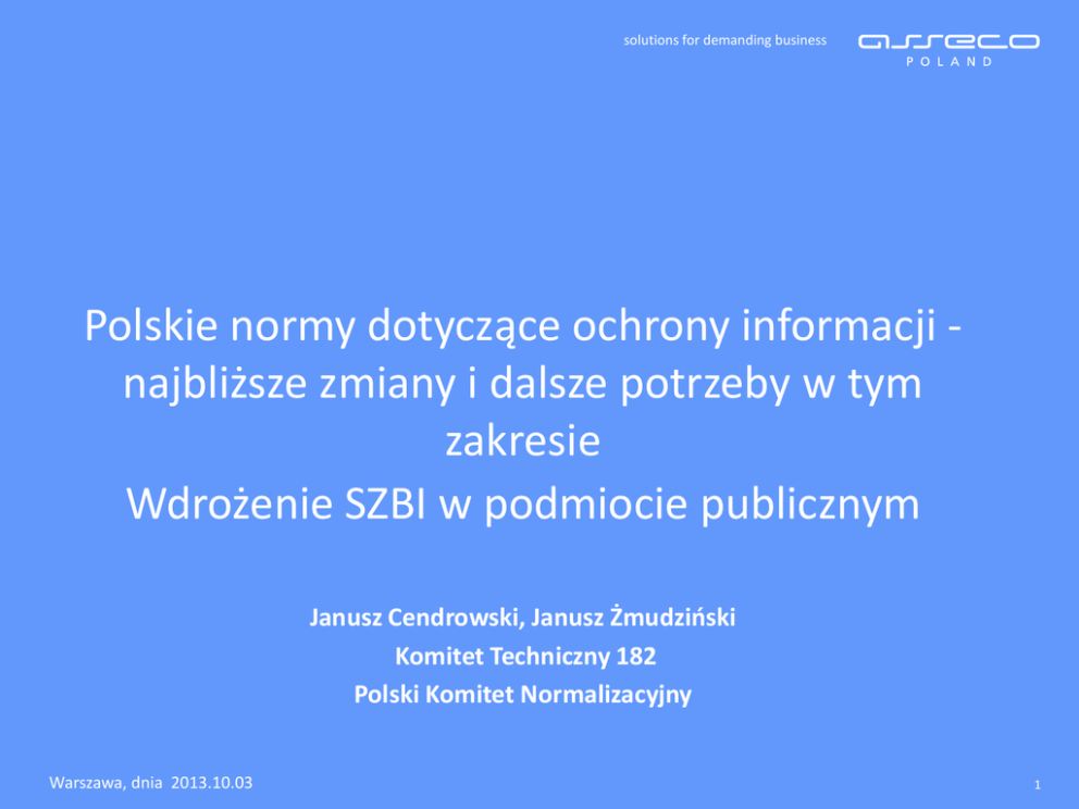 solutions for demanding business Polskie normy dotyczące ochrony informacji najbliższe zmiany i dalsze potrzeby w tym zakresie Wdrożenie SZBI w podmiocie publicznym Janusz Cendrowski, Janusz Żmudziński Komitet Techniczny 182 Polski Komitet Normalizacyjny Warszawa, dnia 2013.10.03 1 solutions for demanding business Agenda prezentacji Polskie Normy dotyczące ochrony informacji Potrzeby w zakresie nowych PN Wdrożenie SZBI w podmiotach publicznych Nowe normy w ISO/IEC 2 solutions for demanding business Komitet Techniczny 182 w PKN – Polskie Normy dotyczące bezpieczeństwa informacji Systemy zarządzania bezpieczeństwem informacji – 6 szt. Kryptograficzne i niekryptograficzne techniki i mechanizmy zabezpieczeń – 21 szt. Kryteria oceny bezpieczeństwa oraz metodyki testów bezpieczeństwa - 3 szt. Usługi i aplikacje wspierające wdrożenie celów stosowania zabezpieczeń i zabezpieczeń – 1 szt. Aspekty bezpieczeństwa w zarządzaniu tożsamością, w biometrii oraz ochronie danych osobowych – 2 szt. Terminologia – 1 szt. 3 solutions for demanding business Polskie Normy w obszarze SZBI Numer Nazwa PN-I-133351:1999 Technika informatyczna -- Wytyczne do zarządzania bezpieczeństwem systemów informatycznych -- Pojęcia i modele bezpieczeństwa systemów informatycznych PN-ISO/IEC 17799:2007 Technika informatyczna -- Techniki bezpieczeństwa -- Praktyczne zasady zarządzania bezpieczeństwem informacji PN-ISO/IEC 27001:2007 Technika informatyczna -- Techniki bezpieczeństwa -- Systemy zarządzania bezpieczeństwem informacji -- Wymagania PN-ISO/IEC 27005:2010 Technika informatyczna -- Techniki bezpieczeństwa -- Zarządzanie ryzykiem w bezpieczeństwie informacji PN-ISO/IEC 27006:2009 PN-ISO/IEC 27000:2012 Technika informatyczna -- Techniki bezpieczeństwa -- Wymagania dla jednostek prowadzących audyt i certyfikację systemów zarządzania bezpieczeństwem informacji Technika informatyczna -- Techniki bezpieczeństwa -- Systemy zarządzania bezpieczeństwem informacji -- Przegląd i terminologia PN-EN ISO 27799:2010 Informatyka w ochronie zdrowia – Zarządzanie bezpieczeństwem informacji w ochronie zdrowia z wykorzystaniem ISO/IEC 27002 4 solutions for demanding business Przywołanie Polskich Norm w przepisach Nazwa aktu prawnego Normy Rozporządzenie MSWiA z 10.09.2010 r. w sprawie wykazu certyfikatów uprawniających do prowadzenia kontroli projektów informatycznych i systemów teleinformatycznych Załącznik – Wykaz certyfikatów … Rozporządzenie MSWiA z 21.04.2011 r. w sprawie szczegółowych warunków organizacyjnych i technicznych, które powinien spełniać system teleinformatyczny służący do identyfikacji użytkowników Rozporządzenie Prezesa RM z 18 stycznia 2011 r. w sprawie instrukcji kancelaryjnej, jednolitych rzeczowych wykazów akt oraz instrukcji w sprawie organizacji i zakresu działania archiwów zakładowych Rozporządzenie RM z 12.04.2012 r. w sprawie Krajowych Ram Interoperacyjności, minimalnych wymagań dla rejestrów publicznych i wymiany informacji w postaci elektronicznej oraz minimalnych wymagań dla systemów teleinformatycznych PN-ISO/IEC 27001 Rozporządzenie RM z 7.08.2002 r. w sprawie określenia warunków technicznych i organizacyjnych dla kwalifikowanych podmiotów świadczących usługi certyfikacyjne, polityk certyfikacji dla kwalifikowanych certyfikatów wydawanych przez te podmioty oraz warunków technicznych dla bezpiecznych urządzeń służących do składania i weryfikacji podpisu elektronicznego. Rozporządzenie Prezesa RM z 14.09.2011 r. w sprawie sporządzania pism w formie dokumentów elektronicznych, doręczania dokumentów elektronicznych oraz udostępniania formularzy, wzorów i kopii dokumentów elektronicznych PN-ISO/IEC 27001 PN-ISO/IEC 27001 PN-ISO/IEC 27001 PN-ISO/IEC 17799 PN-ISO/IEC 27005 PN-ISO/IEC 24762 PN-ISO/IEC 20000 PN-ISO/IEC 15408 ISO/IEC 15946-2 ISO/IEC 26300 5 solutions for demanding business Przywołanie Polskich Norm w przepisach Nazwa aktu prawnego Rozporządzenie Ministra Zdrowia z dnia 28 marca 2013 r. w sprawie wymagań dla Systemu Informacji Medycznej Rozporządzenie Ministra Zdrowia z dnia 19 kwietnia 2013 r. w sprawie Systemu Rejestru Usług Medycznych Narodowego Funduszu Zdrowia Rozporządzenie Ministra Zdrowia z dnia 6 czerwca 2013 r. w sprawie Systemu Monitorowania Kosztów Leczenia i Sytuacji Finansowo-Ekonomicznej Podmiotów Leczniczych Rozporządzenie Ministra Zdrowia z dnia 6 czerwca 2013 r. w sprawie Systemu Ewidencji Zasobów Ochrony Zdrowia Rozporządzenie Ministra Zdrowia z dnia 25 czerwca 2013 r. w sprawie Systemu Statystyki w Ochronie Zdrowia Rozporządzenie Ministra Zdrowia z dnia 9 lipca 2013 r. w sprawie Systemu Monitorowania Zagrożeń Rozporządzenie Ministra Zdrowia z dnia 14 sierpnia 2013 r. w sprawie minimalnych wymagań dla niektórych systemów teleinformatycznych funkcjonujących w ramach systemu informacji w ochronie zdrowia Rozporządzenie Ministra Zdrowia z dnia 14 sierpnia 2013 r. w sprawie opisu, minimalnej funkcjonalności oraz warunków organizacyjno-technicznych funkcjonowania Platformy Udostępniania On-Line Usług i Zasobów Cyfrowych Rejestrów Medycznych oraz Elektronicznej Platformy Gromadzenia, Analizy i Udostępnienia Zasobów Cyfrowych o Zdarzeniach Medycznych Normy PN-EN ISO 27799:2010 Ustawa o informatyzacji => Rozporządzenie KRI=> PN-ISO/IEC 27001 i pozostałe Inne normy dotyczące informatyki w ochronie zdrowia 6 solutions for demanding business Przywołanie norm ISO/IEC w aktach UE Nazwa aktu prawnego Normy Rozporządzenie WYKONAWCZE KOMISJI (UE) NR 1179/2011 z dnia 17 listopada 2011 r. ustanawiające specyfikacje techniczne w odniesieniu do systemów zbierania deklaracji online na mocy rozporządzenia Parlamentu Europejskiego i Rady (UE) nr 211/2011 w sprawie inicjatywy obywatelskiej Rozporządzenie KOMISJI (WE) NR 885/2006 z dnia 21 czerwca 2006 r. ustanawiające szczegółowe zasady stosowania rozporządzenia Rady (WE) nr 1290/2005 w zakr