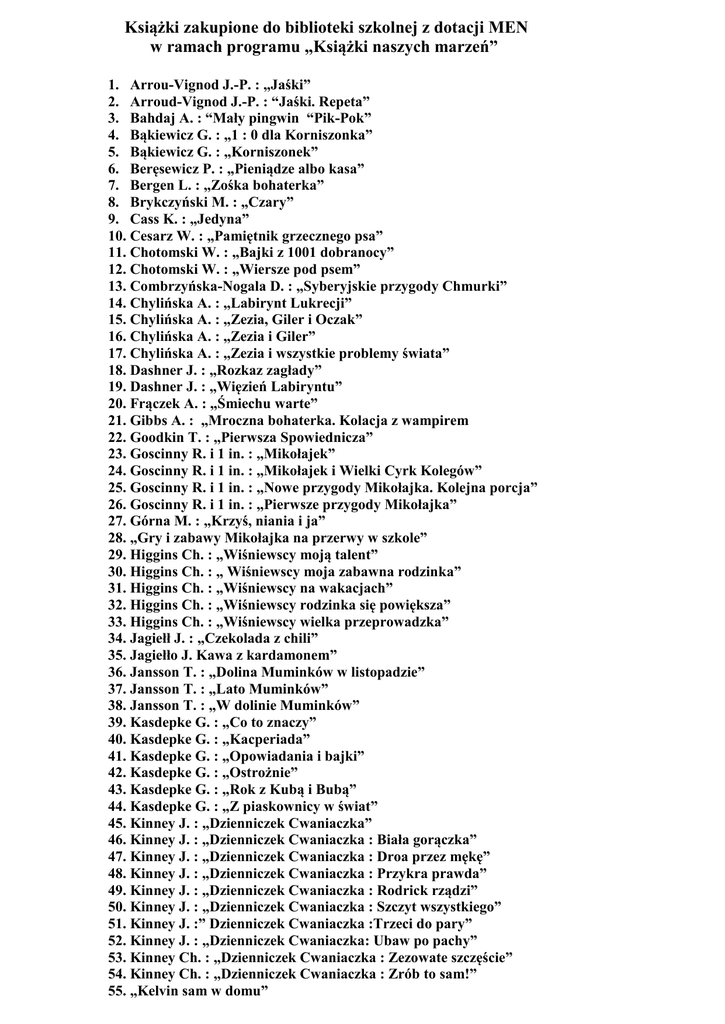 Książki zakupione do biblioteki szkolnej z dotacji MEN w ramach programu „Książki naszych marzeń” 1. Arrou-Vignod J.-P. : „Jaśki” 2. Arroud-Vignod J.-P. : “Jaśki. Repeta” 3. Bahdaj A. : “Mały pingwin “Pik-Pok” 4. Bąkiewicz G. : „1 : 0 dla Korniszonka” 5. Bąkiewicz G. : „Korniszonek” 6. Beręsewicz P. : „Pieniądze albo kasa” 7. Bergen L. : „Zośka bohaterka” 8. Brykczyński M. : „Czary” 9. Cass K. : „Jedyna” 10. Cesarz W. : „Pamiętnik grzecznego psa” 11. Chotomski W. : „Bajki z 1001 dobranocy” 12. Chotomski W. : „Wiersze pod psem” 13. Combrzyńska-Nogala D. : „Syberyjskie przygody Chmurki” 14. Chylińska A. : „Labirynt Lukrecji” 15. Chylińska A. : „Zezia, Giler i Oczak” 16. Chylińska A. : „Zezia i Giler” 17. Chylińska A. : „Zezia i wszystkie problemy świata” 18. Dashner J. : „Rozkaz zagłady” 19. Dashner J. : „Więzień Labiryntu” 20. Frączek A. : „Śmiechu warte” 21. Gibbs A. : „Mroczna bohaterka. Kolacja z wampirem 22. Goodkin T. : „Pierwsza Spowiednicza” 23. Goscinny R. i 1 in. : „Mikołajek” 24. Goscinny R. i 1 in. : „Mikołajek i Wielki Cyrk Kolegów” 25. Goscinny R. i 1 in. : „Nowe przygody Mikołajka. Kolejna porcja” 26. Goscinny R. i 1 in. : „Pierwsze przygody Mikołajka” 27. Górna M. : „Krzyś, niania i ja” 28. „Gry i zabawy Mikołajka na przerwy w szkole” 29. Higgins Ch. : „Wiśniewscy moją talent” 30. Higgins Ch. : „ Wiśniewscy moja zabawna rodzinka” 31. Higgins Ch. : „Wiśniewscy na wakacjach” 32. Higgins Ch. : „Wiśniewscy rodzinka się powiększa” 33. Higgins Ch. : „Wiśniewscy wielka przeprowadzka” 34. Jagiełł J. : „Czekolada z chili” 35. Jagiełło J. Kawa z kardamonem” 36. Jansson T. : „Dolina Muminków w listopadzie” 37. Jansson T. : „Lato Muminków” 38. Jansson T. : „W dolinie Muminków” 39. Kasdepke G. : „Co to znaczy” 40. Kasdepke G. : „Kacperiada” 41. Kasdepke G. : „Opowiadania i bajki” 42. Kasdepke G. : „Ostrożnie” 43. Kasdepke G. : „Rok z Kubą i Bubą” 44. Kasdepke G. : „Z piaskownicy w świat” 45. Kinney J. : „Dzienniczek Cwaniaczka” 46. Kinney J. : „Dzienniczek Cwaniaczka : Biała gorączka” 47. Kinney J. : „Dzienniczek Cwaniaczka : Droa przez mękę” 48. Kinney J. : „Dzienniczek Cwaniaczka : Przykra prawda” 49. Kinney J. : „Dzienniczek Cwaniaczka : Rodrick rządzi” 50. Kinney J. : „Dzienniczek Cwaniaczka : Szczyt wszystkiego” 51. Kinney J. :” Dzienniczek Cwaniaczka :Trzeci do pary” 52. Kinney J. : „Dzienniczek Cwaniaczka: Ubaw po pachy” 53. Kinney Ch. : „Dzienniczek Cwaniaczka : Zezowate szczęście” 54. Kinney Ch. : „Dzienniczek Cwaniaczka : Zrób to sam!” 55. „Kelvin sam w domu” 56. Kosik R. : „Felix, Net i Nika oraz Niebezpieczne dorastanie” 57. Laybourne E. : „Monument 14 T.1 Odcięci od świata” 58. Laybourne E. : „Monument 14 T.2 Niebo w ogniu” 59. Laybourne E. : „Monument 14 T.3 Wściekły wiatr” 60. Maleszka A. : „Magiczne drzewo : Cień Smoka” 61. Maleszka A. : „Magiczne drzewo : Czerwone krzesło” 62. Maleszka A. : „Magiczne drzewo : Gra” 63. Maleszka A. : „Magiczne drzewo : Olbrzym” 64. Maleszka A. : „Magiczne drzewo : Świat ogromnych” 65. Maleszka A. : „Magiczne drzewo :Tajemnica mostu” 66. McKain K. : „Emilka i Magik : Stajnia po Podkową” 67. McKain K. : „Hania i Nadzieja : Stajnia pod Podkową” 68. McKain K. : „Julka i Książę : Stajnia pod Podkową” 69. McKain K. : „Marta i Psotnik : Stajnia pod Podkową” 70. McKain K. : „Marysia i Szczęściarz : Stajnia pod Podkową” 71. McKain K. : „Zuzia i Kartacz : Stajnia pod Podkową” 72. Mull B. : „Baśniobór T.1 – 5” 73. Mull B. : „Spirit Animals T.1 Zwierzoduchy” 74. „Nela mała reporterka : 10 niesamowitych przygód Neli” 75. „Nela mała reporterka : Nela na 3 kontynentach” 76. „Nela mała reporterka : Nela na tropie przygód” 77. „Nela mała reporterka : Nela i tajemnice świata” 78. Nix G. i 1 in. : „Spirit Animals T.3 Więzy krwi” 79. Onichimowska A. : “Osiem metrów niespodzianki” 80. „Opowiadania na dobranoc. Polscy pisarze dzieciom” 81. „Opowiadania o psach. Na psa urok! . Polscy pisarze dzieciom” 82. „Opowiadania z dreszczykiem . Polscy pisarze dzieciom” 83. „Opowiadania z kluczem. Polscy pisarze dzieciom” 84. „Opowiadania z uśmiechem. Polscy pisarze dzieciom” 85. Ostrowicka B. : „Franuś, gdzie ty masz głowę” 86. Papuzińska J. : „Smok w powidłach” 87. Riordan R. : „Percy Jackson i bogowie olimpijscy T.1 – 5” 88. „Rodzinne przygody Mikołajka” 89. Russel R.R. : „Dzienniki Niki T.2, T. 4, T.5, T.6” 90. Sapkowski A. : „Wiedźmin T.1 -5” 91. Sapkowski A. : „Wiedźmin : Miecz przeznaczenia” 92. Sapkowski A. : „Wiedźmin : Ostatnie życzenie” 93. Schmidt E.E. : „Ulisses z Bagdadu” 94. Simon F. : „Koszmarny Karolek : Podręczny rocznik” 95. Simon F. : „Koszmarny Karolek : Straszne czaszki i niemiłe mumie” 96. Simon F. : „Koszmarny Karolek : Wariackie wakacje” 97. Simon F. : „Koszmarny Karolek : Zemsta Gangu Purpurowej Ręki” 98. Strękowska-Zaremba M. : „Filipek i dziewczyny” 99. Strękowska-Zaremba M. : „Filipek i rodzina” 100. Strękowska-Zaremba M. : „Filipek i wakacje” 101. Stiefvater M. : „Spirit Animals T.2 Polowanie” 102. Strękowska-Zaremba M. : “Willa trzech łotrów” 103. Szymeczko K. : „Czworo i kości” 104. Tolkien J.R.R. : „Hobbit” 105. Tolkien J.R.R. : “Władca Pierścieni T.1-3” 106. Tyszka A. : „Zosia z ulicy Kociej na wycieczce” 107. Widmark M. i 1 in. : 20 tytułów z serii „Biuro detektywistyczne Lassego i Mai” 108. „Wiedźmin : Dom ze szkła” 109. Wojciechowska M. : „Zwierzęta świata” 110. Zafon C.R. : „Książę Mgły” 111. Zafon C.R. : „Pałac Północy” 112. Zafon C.R. Światła września”