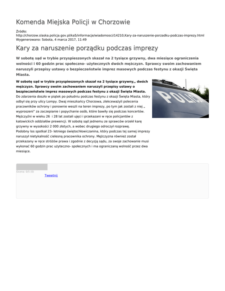 Komenda Miejska Policji w Chorzowie Źródło: http://chorzow.slaska.policja.gov.pl/ka5/informacje/wiadomosci/14210,Kary-za-naruszenie-porzadku-podczas-imprezy.html Wygenerowano: Sobota, 4 marca 2017, 11:49 Kary za naruszenie porządku podczas imprezy W sobotę sąd w trybie przyspieszonych skazał na 2 tysiące grzywny, dwa miesiące ograniczenia wolności i 60 godzin prac społeczno- użytecznych dwóch mężczyzn. Sprawcy swoim zachowaniem naruszyli przepisy ustawy o bezpieczeństwie imprez masowych podczas festynu z okazji Święta Miasta. W sobotę sąd w trybie przyspieszonych skazał na 2 tysiące grzywny,, dwóch mężczyzn. Sprawcy swoim zachowaniem naruszyli przepisy ustawy o bezpieczeństwie imprez masowych podczas festynu z okazji Święta Miasta. Do zdarzenia doszło w piątek po południu podczas festynu z okazji Święta Miasta, który odbył się przy ulicy Lompy. Dwaj mieszkańcy Chorzowa, zlekceważyli polecenia pracowników ochrony i ponownie weszli na teren imprezy, po tym jak zostali z niej „ wyproszeni” za zaczepianie i popychanie osób, które bawiły się podczas koncertów. Mężczyźni w wieku 26 i 28 lat zostali ujęci i przekazani w ręce policjantów z katowickich oddziałów prewencji. W sobotę sąd jednemu ze sprawców orzekł karę grzywny w wysokości 2 000 złotych, a wobec drugiego odroczył rozprawę. Podobny los spotkał 23- letniego świętochłowiczanina, który podczas tej samej imprezy naruszył nietykalność cielesną pracownika ochrony. Mężczyzna również został przekazany w ręce stróżów prawa i zgodnie z decyzją sądu, za swoje zachowanie musi wykonać 60 godzin prac użyteczno- społecznych i ma ograniczaną wolność przez dwa miesiące. Ocena: 0/5 (0) Tweetnij