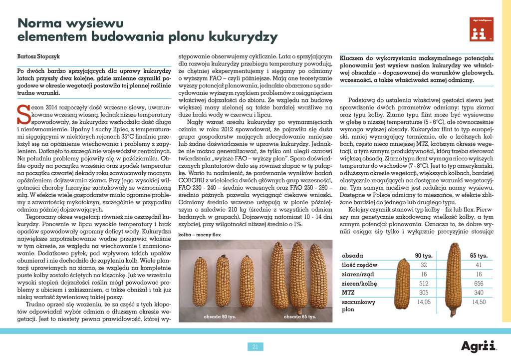 Norma wysiewu elementem budowania plonu kukurydzy Bartosz Stopczyk Po dwóch bardzo sprzyjających dla uprawy kukurydzy latach przyszły dwa kolejne, gdzie zmienne czynniki pogodowe w okresie wegetacji postawiła tej plennej roślinie trudne warunki. S ezon 2014 rozpoczęły dość wczesne siewy, uwarunkowane wczesną wiosną. Jednak niższe temperatury spowodowały, że kukurydza wschodziła dość długo i nierównomiernie. Upalny i suchy lipiec, z temperaturami sięgającymi w niektórych rejonach 35°C finalnie przełożył się na opóźnienie wiechowania i problemy z zapyleniem. Dotknęło to szczególnie województw centralnych. Na południu problemy pojawiły się w październiku. Obfite opady na początku września oraz spadek temperatur na początku czwartej dekady roku zaowocowały mocnym opóźnieniem dojrzewania ziarna. Przy jego wysokiej wilgotności choroby fuzaryjne zaatakowały ze wzmocnioną siłą. W efekcie wiele gospodarstw miało ogromne problemy z zawartością mykotoksyn, szczególnie w przypadku odmian później dojrzewających. Tegoroczny okres wegetacji również nie oszczędził kukurydzy. Ponownie w lipcu wysokie temperatury i brak opadów spowodowały ogromny deficyt wody. Kukurydza największe zapotrzebowanie wodne przejawia właśnie w tym okresie, ze względu na wiechowanie i znamionowanie. Dodatkowo pyłek, pod wpływem takich upałów obumierał i nie dochodziło do zapylenia kolb. Wiele plantacji uprawianych na ziarno, ze względu na kompletnie puste kolby zostało ściętych na kiszonkę. Już we wrześniu wysoki stopień dojrzałości roślin mógł powodować problemy z ubiciem i zakiszaniem, a także obniżał i tak już niską wartość żywieniową takiej paszy. Trudno oprzeć się wrażeniu, że za część z tych kłopotów odpowiadał wybór odmian o dłuższym okresie wegetacji. Jest to niestety pewna prawidłowość, której wy- stępowanie obserwujemy cyklicznie. Lata o sprzyjającym dla rozwoju kukurydzy przebiegu temperatury powodują, że chętniej eksperymentujemy i sięgamy po odmiany o wyższym FAO – czyli późniejsze. Mają one teoretycznie wyższy potencjał plonowania, jednakże obarczone są zdecydowanie wyższym ryzykiem problemów z osiągnięciem właściwej dojrzałości do zbioru. Ze względu na budowę większej masy zielonej są także bardziej wrażliwe na duże braki wody w czerwcu i lipcu. Nagły wzrost areału kukurydzy po wymarznięciach ozimin w roku 2012 spowodował, że pojawiła się duża grupa gospodarstw mających zdecydowanie mniejsze lub żadne doświadczenie w uprawie kukurydzy. Jednakże nie można generalizować, że tylko oni ulegli czarowi twierdzenia „wyższe FAO – wyższy plon”. Sporo doświadczonych plantatorów dało się również złapać w tę pułapkę. Warto tu nadmienić, że porównanie wyników badań COBORU z wielolecia dwóch głównych grup wczesności, FAO 230 - 240 – średnio wczesnych oraz FAO 250 - 290 – średnio późnych pozwala wyciągnąć ciekawe wnioski. Odmiany średnio wczesne ustępują w plonie późniejszym o zaledwie 210 kg (średnie z wszystkich odmian badanych w grupach). Dojrzewają natomiast 10 - 14 dni szybciej, przy wilgotności niższej średnio o 1%. kolba – mocny flex Kluczem do wykorzystania maksymalnego potencjału plonowania jest wysiew nasion kukurydzy we właściwej obsadzie – dopasowanej do warunków glebowych, wczesności, a także właściwości samej odmiany. Podstawą do ustalenia właściwej gęstości siewu jest sprawdzenie dwóch parametrów odmiany: typu ziarna oraz typu kolby. Ziarno typu flint może być wysiewane w glebę o niższej temperaturze (5 - 6°C), ale równocześnie wymaga wyższej obsady. Kukurydza flint to typ europejski, mniej wymagający termicznie, ale o krótszych kolbach, często nieco mniejszej MTZ, krótszym okresie wegetacji, a tym samym produktywności, którą trzeba sterować większą obsadą. Ziarno typu dent wymaga nieco wyższych temperatur do wschodów (7 - 8°C). Jest to typ amerykański, o dłuższym okresie wegetacji, większych kolbach, bardziej elastycznie reagujących na dostępne warunki wegetacyjne. Tym samym możliwa jest redukcja normy wysiewu. Dostępne w Polsce odmiany to mieszańce, w efekcie zbliżone bardziej do jednego lub drugiego typu. Kolejny czynnik stanowi typ kolby – fix lub flex. Pierwszy ma genetycznie zakodowaną wielkość kolby, a tym samym potencjał plonowania. Oznacza to, że dobre wyniki osiąga się tylko i wyłącznie precyzyjnie stosując obsada 90 tys. 65 tys. ilość rzędów 32 41 ziaren/rząd 16 16 zieren/kolbę 512 656 MTZ 305 340 14,05 14,50 szacunkowy plon obsada 90 tys. obsada 65 tys. 21 KUKURYDZA KUKURYDZA BOBOWATE SŁONECZNIK odpowiednią obsadę. Przy zbyt gęstym siewie rośliny o kolbach typu fix nie są w stanie wykarmić zaprogramowanego plonu, a przy zbyt rzadkim siewie, tracimy poprzez za niską obsadę. Flex natomiast reaguje wielkością kolby na warunki uprawy. W przypadku zasobniejszych stanowisk kukurydza flex potrafi rozbudować wielkość kolby oraz wytworzyć ziarna o wyższej MTZ. Dzięki temu jest również w stanie skompensować pewien procent wypadnięć w łanie. Na słabszych stanowiskach, przy niższej obsadzie, mniejsza konkurencyjność powoduje wykształ- Ballade Chavoxx Palazzo Cockpit Inagua Codikart Sixxtus Wielkopolska Norma Plon Plon wysiewu 2013 2014 74 tys. 9,65 8,6 83 tys. 10,2 8 94 tys. 12,28 8,3 74 tys. 11,82 9,8 83 tys. 12,63 10,3 94 tys. 12,79 11,3 74 tys. 12,17 10,8 83 tys. 13,24 10,8 94 tys. 14,38 11,5 74 tys. 12,46 11 83 tys. 13,98 11 94 tys. 14,05 11,7 74 tys. 9,7 83 tys. 9,9 94 tys. 8,4 74 tys. 8,8 83 tys. 9,3 94 tys. 9,7 74 tys. 10,87 83 tys. 12,09 94 tys. 11,41 Opolskie Norma Plon wysiewu 2014 85 tys. 90 tys. 95 tys. 85 tys. 90 tys. 95 tys. 85 tys. 90 tys. 95 tys. 85 tys. 90 tys. 95 tys. 85 tys. 90 tys. 95 tys. 85 tys. 90 tys. 95 tys. 9,74 10,15 10,47 12,3 9,79 10,18 10,44 11,05 11,16 12,41 9,76 10,76 11,61 13,11 13,