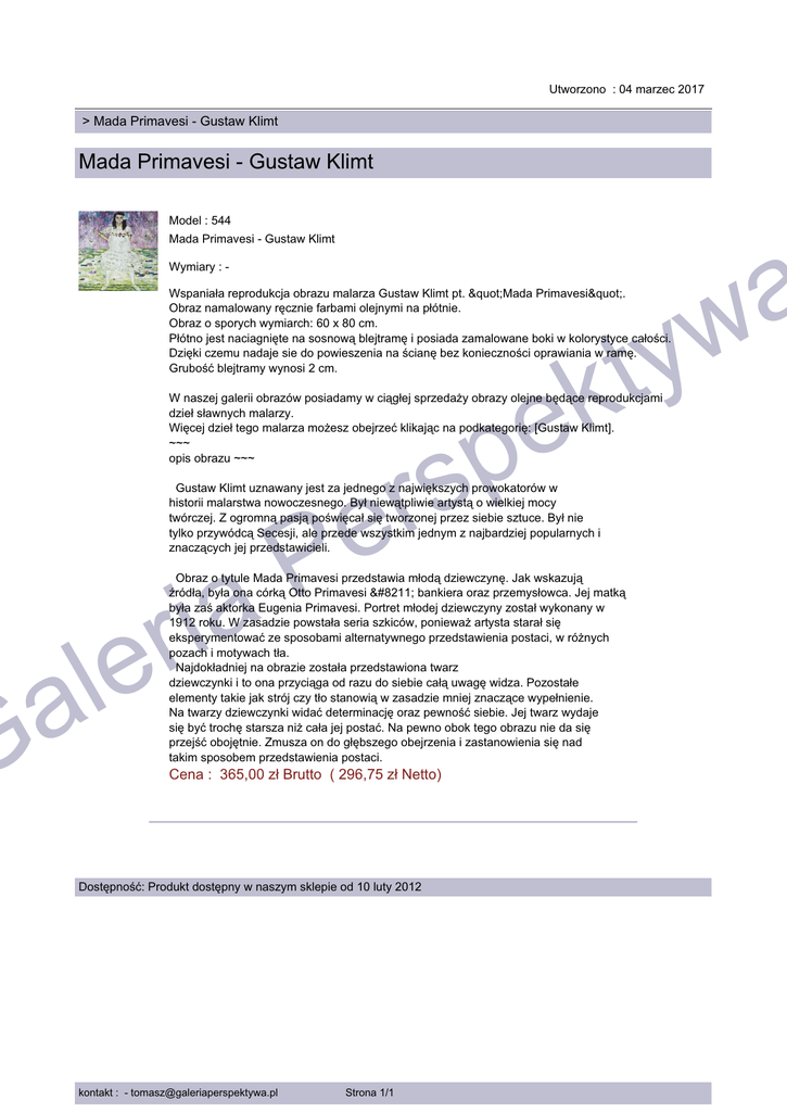 Utworzono : 04 marzec 2017 > Mada Primavesi - Gustaw Klimt Mada Primavesi - Gustaw Klimt Model : 544 Mada Primavesi - Gustaw Klimt a w ty Wymiary : - Wspaniała reprodukcja obrazu malarza Gustaw Klimt pt. "Mada Primavesi". Obraz namalowany ręcznie farbami olejnymi na płótnie. Obraz o sporych wymiarch: 60 x 80 cm. Płótno jest naciagnięte na sosnową blejtramę i posiada zamalowane boki w kolorystyce całości. Dzięki czemu nadaje sie do powieszenia na ścianę bez konieczności oprawiania w ramę. Grubość blejtramy wynosi 2 cm. k e W naszej galerii obrazów posiadamy w ciągłej sprzedaży obrazy olejne będące reprodukcjami dzieł sławnych malarzy. Więcej dzieł tego malarza możesz obejrzeć klikając na podkategorię: [Gustaw Klimt]. ~~~ opis obrazu ~~~ a i r e l a G p rs e P Gustaw Klimt uznawany jest za jednego z największych prowokatorów w historii malarstwa nowoczesnego. Był niewątpliwie artystą o wielkiej mocy twórczej. Z ogromną pasją poświęcał się tworzonej przez siebie sztuce. Był nie tylko przywódcą Secesji, ale przede wszystkim jednym z najbardziej popularnych i znaczących jej przedstawicieli. Obraz o tytule Mada Primavesi przedstawia młodą dziewczynę. Jak wskazują źródła, była ona córką Otto Primavesi – bankiera oraz przemysłowca. Jej matką była zaś aktorka Eugenia Primavesi. Portret młodej dziewczyny został wykonany w 1912 roku. W zasadzie powstała seria szkiców, ponieważ artysta starał się eksperymentować ze sposobami alternatywnego przedstawienia postaci, w różnych pozach i motywach tła. Najdokładniej na obrazie została przedstawiona twarz dziewczynki i to ona przyciąga od razu do siebie całą uwagę widza. Pozostałe elementy takie jak strój czy tło stanowią w zasadzie mniej znaczące wypełnienie. Na twarzy dziewczynki widać determinację oraz pewność siebie. Jej twarz wydaje się być trochę starsza niż cała jej postać. Na pewno obok tego obrazu nie da się przejść obojętnie. Zmusza on do głębszego obejrzenia i zastanowienia się nad takim sposobem przedstawienia postaci. Cena : 365,00 zł Brutto ( 296,75 zł Netto) Dostępność: Produkt dostępny w naszym sklepie od 10 luty 2012 kontakt : - [email protected] Strona 1/1