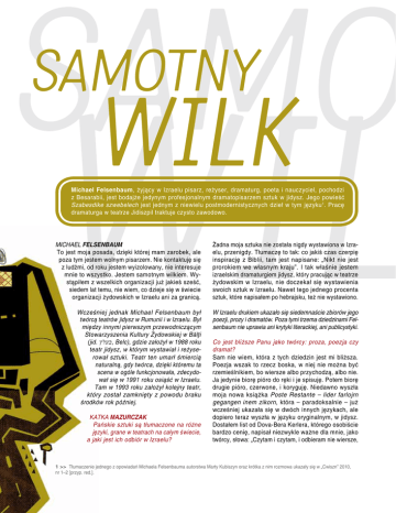 Samotny Wilk Michael Felsenbaum, żyjący w Izraelu pisarz, reżyser, dramaturg, poeta i nauczyciel, pochodzi z Besarabii, jest bodajże jedynym profesjonalnym dramatopisarzem sztuk w jidysz. Jego powieść Szabesdike szwebelech jest jednym z niewielu postmodernistycznych dzieł w tym języku 1. Pracę dramaturga w teatrze Jidiszpil traktuje czysto zawodowo. Michael Felsenbaum To jest moja posada, dzięki której mam zarobek, ale poza tym jestem wolnym pisarzem. Nie kontaktuję się z ludźmi, od roku jestem wyizolowany, nie interesuje mnie to wszystko. Jestem samotnym wilkiem. Wystąpiłem z wszelkich organizacji już jakieś sześć, siedem lat temu, nie wiem, co dzieje się w świecie organizacji żydowskich w Izraelu ani za granicą. Żadna moja sztuka nie została nigdy wystawiona w Izraelu, przenigdy. Tłumaczę to tak: co jakiś czas czerpię inspirację z Biblii, tam jest napisane: „Nikt nie jest prorokiem we własnym kraju”. I tak właśnie jestem izraelskim dramaturgiem jidysz, który pracując w teatrze żydowskim w Izraelu, nie doczekał się wystawienia swoich sztuk w Izraelu. Nawet tego jednego procenta sztuk, które napisałem po hebrajsku, też nie wystawiono. Wcześniej jednak Michael Felsenbaum był twórcą teatrów jidysz w Rumunii i w Izraelu. Był między innymi pierwszym przewodniczącym Stowarzyszenia Kultury Żydowskiej w Bălţi (jid. בעלץ, Belc), gdzie założył w 1988 roku teatr jidysz, w którym wystawiał i reżyserował sztuki. Teatr ten umarł śmiercią naturalną, gdy twórca, dzięki któremu ta scena w ogóle funkcjonowała, zdecydował się w 1991 roku osiąść w Izraelu. Tam w 1993 roku założył kolejny teatr, który został zamknięty z powodu braku środków rok później. W Izraelu drukiem ukazało się siedemnaście zbiorów jego poezji, prozy i dramatów. Poza tymi trzema dziedzinami Felsenbaum nie uprawia ani krytyki literackiej, ani publicystyki. Katka Mazurczak Pańskie sztuki są tłumaczone na różne języki, grane w teatrach na całym świecie, a jaki jest ich odbiór w Izraelu? Co jest bliższe Panu jako twórcy: proza, poezja czy dramat? Sam nie wiem, która z tych dziedzin jest mi bliższa. Poezja wszak to rzecz boska, w niej nie można być rzemieślnikiem, bo wiersze albo przychodzą, albo nie. Ja jedynie biorę pióro do ręki i je spisuję. Potem biorę drugie pióro, czerwone, i koryguję. Niedawno wyszła moja nowa książka Poste Restante – lider farlojrn gegangen inem zikorn, która – paradoksalnie – już wcześniej ukazała się w dwóch innych językach, ale dopiero teraz wyszła w języku oryginalnym, w jidysz. Dostałem list od Dova-Bera Kerlera, którego osobiście bardzo cenię, napisał niezwykle ważne dla mnie, jako twórcy, słowa: „Czytam i czytam, i odbieram nie wiersze, 1 >> Tłumaczenie jednego z opowiadań Michaela Felsenbauma autorstwa Marty Kubiszyn oraz krótka z nim rozmowa ukazały się w „Cwiszn” 2010, nr 1–2 [przyp. red.]. temat numeru / rozmowy o izraelu 9 lecz prawdziwą poezję”. Dla tych słów jedynie warto było tworzyć przez całe życie. Jaka jest sytuacja jidysz w Izraelu? Już od lat siedemdziesiątych można było zauważyć pierwsze symptomy tego, że z jidysz zaczyna się źle dziać. Pierwszy problem, na który już wcześniej zwracali uwagę wielcy jidyszyści, jak na przykład Mordke Schaechter, to fakt, że po wojnie nie było żadnego dramaturga jidysz i to nie tylko z przyczyn demograficznych, na skutek Holokaustu czy represji w ZSRR. Do tego mniej więcej od połowy lat sześćdziesiątych do połowy lat siedemdziesiątych nie było znaczącego autorytetu w krytyce literackiej jidysz. A bez tych dwóch ważnych dziedzin: dramaturgii i krytyki literackiej, język nie może rozwijać się, jak powinien. Drugą kwestią jest to, że od lat siedemdziesiątych, osiemdziesiątych XX wieku były tylko dwie duże grupy odbiorców jidysz – starsze pokolenie mówców jidysz oraz nowe, całkiem młode pokolenie. Nie było pokolenia „pomiędzy”, ludzi w wieku od 30 do 50 lat, aktywnych zawodowo, którzy w innych językach stanowią dziewięćdziesiąt procent czytelników/odbiorców kultury. Kto czyta literaturę poważną? Przeważnie ludzie w wieku od 25 do 60 lat. Tych odbiorców zabrakło w pewnym okresie z powodów demograficznych, ponieważ ludzie z pokolenia powojennego, do których ja również należę, byli pasywnymi znawcami kultury jidysz. Tych, którzy znali język jidysz i czynnie go używali, było bardzo niewielu; choć trzeba powiedzieć, że większość biernie rozumiała jidysz. Niestety, ten stan utrzymuje się do dziś. Ilu bowiem jest pisarzy tworzących w jidysz? Mam na myśli pisarzy w rozumieniu profesjonalnych literatów, którzy żyją z pisania, a nie grafomanów, którzy wyuczyli się jidysz i myślą, że umieją coś napisać. A z tych naprawdę ważnych i wielkich pisarzy urodzonych przed wojną jeszcze – ilu się ostało? Pojedynczy pisarze. Większość odbiorców dziś stanowią młodzi, bardzo młodzi ludzie. Za moich czasów, kiedy pisałem doktorat na Uniwersytecie Bar-Ilan, zajęcia były w jidysz, można było pisać prace dyplomowe w jidysz. Teraz już nie. Pana córka, Vira Lozinsky, jest piosenkarką jidysz. Wykonuje głównie pańskie piosenki. Czy ona reprezentuje to nowe pokolenie? Ona, podobnie jak jej ojciec, idzie własną drogą. Wychowała się w wielopokoleniowym domu, gdzie mówiono trzema językami. Do tej pory rozmawiamy w jidysz z moją mamą, niech długie będą jej lata, która mieszka nadal we Floreşti. Vira prosi mnie czasem o poradę co do jakiegoś słowa w piosence. Jestem bardzo dumny z mojej córki, tak jak z moich studentów i wnuków. Cały wywiad z Michaelem Felsenbauem dostępny jest jako podkast w archiwum „Naje Chwaljes” z listopada 2011 roku.