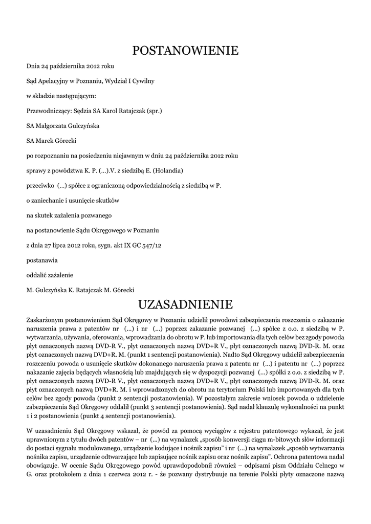 POSTANOWIENIE Dnia 24 października 2012 roku Sąd Apelacyjny w Poznaniu, Wydział I Cywilny w składzie następującym: Przewodniczący: Sędzia SA Karol Ratajczak (spr.) SA Małgorzata Gulczyńska SA Marek Górecki po rozpoznaniu na posiedzeniu niejawnym w dniu 24 października 2012 roku sprawy z powództwa K. P. (...).V. z siedzibą E. (Holandia) przeciwko (...) spółce z ograniczoną odpowiedzialnością z siedzibą w P. o zaniechanie i usunięcie skutków na skutek zażalenia pozwanego na postanowienie Sądu Okręgowego w Poznaniu z dnia 27 lipca 2012 roku, sygn. akt IX GC 547/12 postanawia oddalić zażalenie M. Gulczyńska K. Ratajczak M. Górecki UZASADNIENIE Zaskarżonym postanowieniem Sąd Okręgowy w Poznaniu udzielił powodowi zabezpieczenia roszczenia o zakazanie naruszenia prawa z patentów nr (...) i nr (...) poprzez zakazanie pozwanej (...) spółce z o.o. z siedzibą w P. wytwarzania, używania, oferowania, wprowadzania do obrotu w P. lub importowania dla tych celów bez zgody powoda płyt oznaczonych nazwą DVD-R V., płyt oznaczonych nazwą DVD+R V., płyt oznaczonych nazwą DVD-R. M. oraz płyt oznaczonych nazwą DVD+R. M. (punkt 1 sentencji postanowienia). Nadto Sąd Okręgowy udzielił zabezpieczenia roszczeniu powoda o usunięcie skutków dokonanego naruszenia prawa z patentu nr (...) i patentu nr (...) poprzez nakazanie zajęcia będących własnością lub znajdujących się w dyspozycji pozwanej (...) spółki z o.o. z siedzibą w P. płyt oznaczonych nazwą DVD-R V., płyt oznaczonych nazwą DVD+R V., płyt oznaczonych nazwą DVD-R. M. oraz płyt oznaczonych nazwą DVD+R. M. i wprowadzonych do obrotu na terytorium Polski lub importowanych dla tych celów bez zgody powoda (punkt 2 sentencji postanowienia). W pozostałym zakresie wniosek powoda o udzielenie zabezpieczenia Sąd Okręgowy oddalił (punkt 3 sentencji postanowienia). Sąd nadał klauzulę wykonalności na punkt 1 i 2 postanowienia (punkt 4 sentencji postanowienia). W uzasadnieniu Sąd Okręgowy wskazał, że powód za pomocą wyciągów z rejestru patentowego wykazał, że jest uprawnionym z tytułu dwóch patentów – nr (...) na wynalazek „sposób konwersji ciągu m-bitowych słów informacji do postaci sygnału modulowanego, urządzenie kodujące i nośnik zapisu” i nr (...) na wynalazek „sposób wytwarzania nośnika zapisu, urządzenie odtwarzające lub zapisujące nośnik zapisu oraz nośnik zapisu”. Ochrona patentowa nadal obowiązuje. W ocenie Sądu Okręgowego powód uprawdopodobnił również – odpisami pism Oddziału Celnego w G. oraz protokołem z dnia 1 czerwca 2012 r. - że pozwany dystrybuuje na terenie Polski płyty oznaczone nazwą DVD –+ R V. i D. M.. Z kolei opinią prywatną Instytutu (...) w G. powód uprawdopodobnił, że płyty oznaczone posiadają cechy zastrzeżenia nr (...)patentu nr (...) oraz zastrzeżenia nr (...) patentu (...). W ocenie Sądu Okręgowego uprawdopodobnione nadto zostało, że płyty wkraczają w zakres ochrony patentowej. Opinia prywatna jest bowiem zdaniem Sądu Okręgowego wystarczająca dla przyjęcia uprawdopodobnienia. Z uprawdopodobnione Sąd Okręgowy uznał nadto roszczenie powoda wynikające z deliktu nieuczciwej konkurencji. Pozwany naruszając prawa płynące z patentów nr (...) i (...) w sposób bezprawny czerpał korzyści z efektów prac badawczo-rozwojowych powoda bez ponoszenia ciężarów związanych z obowiązkiem uzyskania licencji na wszystkie importowane i wprowadzane do obrotu na terytorium RP płyty. Powyższe zachowanie w ocenie Sądu Okręgowego wypełnia znamiona deliktu. Rozważając kwestię uprawdopodobnienia interesu prawnego Sąd Okręgowy powołał się na specyfikę zabezpieczenia roszczeń w sprawach z zakresu ochrony własności intelektualnej. Interes prawny w udzieleniu zabezpieczenia może wyrażać się także w potrzebie natychmiastowej ochrony prawnej np. ze względu na konieczność zapobieżenia szkodzie lub innym niekorzystnym następstwom, które może ponieść uprawniony. Z takim przypadkiem w ocenie Sądu mamy do czynienia w sprawach o naruszenie praw z patentu. Na uwzględnienie zasługuje także argument uprawnionego odwołujący się do przewidywanego długiego trwania procesu oraz terminowości udzielonej ochrony patentowej. Brak udzielenie zabezpieczenia w niniejszej sprawie spowodowałby więc faktyczne skrócenie okresu zagwarantowanej ochrony, które jest nieodwracalne. W ocenie Sądu Okręgowego powód nie wykazał natomiast interesu prawnego w udzieleniu zabezpieczenia roszczeń z tytułu deliktu nieuczciwej konkurencji. Sąd I instancji przytoczył poglądy doktryny odnośnie sposobów zabezpieczenia roszczeń niepieniężnych. Wskazał, że w przypadku roszczeń niepieniężnych z zakresu własności przemysłowej w grę wchodzą takie sposoby zabezpieczenia jak zakaz dalszego naruszania prawa czy też zakaz wprowadzania do obrotu. Sąd Okręgowy ocenił wszystkie sposoby zabezpieczenia zażądane we wniosku przez uprawnionego za dopuszczalne w świetle art. 755 k.p.c. w zw. z art. 7301 k.p.c. Niemniej jednak sposób zabezpieczenia wskazany przez uprawnionego, a mianowicie zakaz wytwarzania, używania, wprowadzania do obrotu w Polsce lub importowanie dla tych celów bez zgody powoda poprzez nakazanie zajęcia wszystkich jakichkolwiek płyt DVD-R i DVD+R narusza w ocenie Sądu regulację art. 7301 § 3 k.p.c. Skoro powód uprawdopodobnił jedynie, że płyty DVD-R V. i płyty DVD- R. M. naruszają prawa wyłączne z patentu przysługujące powodowi, niemożliwym było udzielenie zabezpieczenia także w stosunku do płyt, które nie zostały poddane analizie w opinii prywatnej załączonej do pozwu. Na powyższe postanowienie zażalenie wniósł pozwany. Zarzucił, że nie zgadza się z punktem 1 zaskarżonego postanowienia albowiem powód w pozwie uprawdopodobnił swoje roszczenia natomiast ich nie udowodnił. Podał, że spółka (...) nie wytwarza, nie używa, nie oferuje i nie wpr