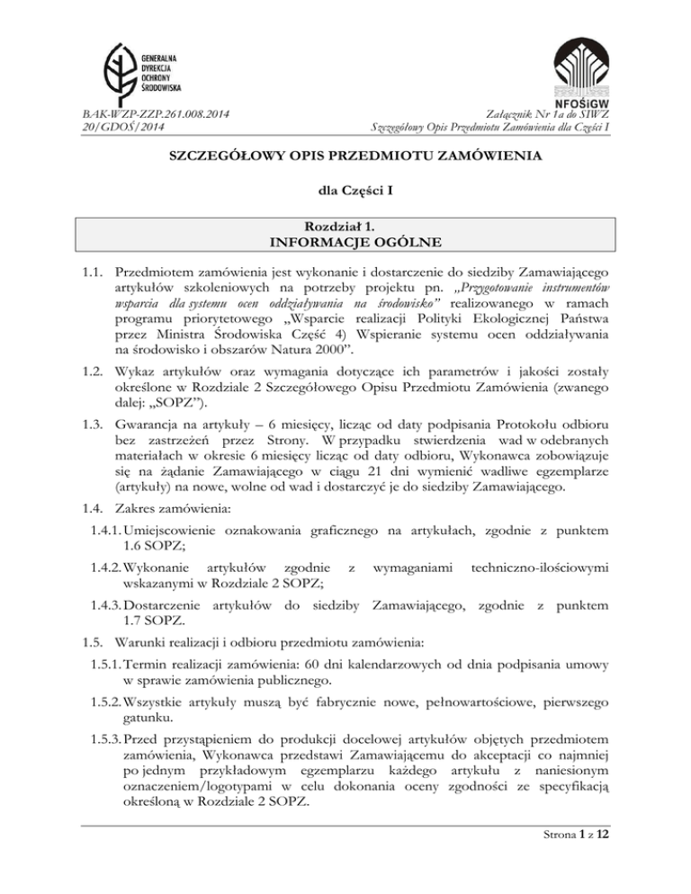 BAK-WZP-ZZP.261.008.2014 20/GDOŚ/2014 Załącznik Nr 1a do SIWZ Szczegółowy Opis Przedmiotu Zamówienia dla Części I SZCZEGÓŁOWY OPIS PRZEDMIOTU ZAMÓWIENIA dla Części I Rozdział 1. INFORMACJE OGÓLNE 1.1. Przedmiotem zamówienia jest wykonanie i dostarczenie do siedziby Zamawiającego artykułów szkoleniowych na potrzeby projektu pn. „Przygotowanie instrumentów wsparcia dla systemu ocen oddziaływania na środowisko” realizowanego w ramach programu priorytetowego „Wsparcie realizacji Polityki Ekologicznej Państwa przez Ministra Środowiska Część 4) Wspieranie systemu ocen oddziaływania na środowisko i obszarów Natura 2000”. 1.2. Wykaz artykułów oraz wymagania dotyczące ich parametrów i jakości zostały określone w Rozdziale 2 Szczegółowego Opisu Przedmiotu Zamówienia (zwanego dalej: „SOPZ”). 1.3. Gwarancja na artykuły – 6 miesięcy, licząc od daty podpisania Protokołu odbioru bez zastrzeżeń przez Strony. W przypadku stwierdzenia wad w odebranych materiałach w okresie 6 miesięcy licząc od daty odbioru, Wykonawca zobowiązuje się na żądanie Zamawiającego w ciągu 21 dni wymienić wadliwe egzemplarze (artykuły) na nowe, wolne od wad i dostarczyć je do siedziby Zamawiającego. 1.4. Zakres zamówienia: 1.4.1. Umiejscowienie oznakowania graficznego na artykułach, zgodnie z punktem 1.6 SOPZ; 1.4.2. Wykonanie artykułów zgodnie wskazanymi w Rozdziale 2 SOPZ; z wymaganiami techniczno-ilościowymi 1.4.3. Dostarczenie artykułów do siedziby Zamawiającego, zgodnie z punktem 1.7 SOPZ. 1.5. Warunki realizacji i odbioru przedmiotu zamówienia: 1.5.1. Termin realizacji zamówienia: 60 dni kalendarzowych od dnia podpisania umowy w sprawie zamówienia publicznego. 1.5.2. Wszystkie artykuły muszą być fabrycznie nowe, pełnowartościowe, pierwszego gatunku. 1.5.3. Przed przystąpieniem do produkcji docelowej artykułów objętych przedmiotem zamówienia, Wykonawca przedstawi Zamawiającemu do akceptacji co najmniej po jednym przykładowym egzemplarzu każdego artykułu z naniesionym oznaczeniem/logotypami w celu dokonania oceny zgodności ze specyfikacją określoną w Rozdziale 2 SOPZ. Strona 1 z 12 BAK-WZP-ZZP.261.008.2014 20/GDOŚ/2014 Załącznik Nr 1a do SIWZ Szczegółowy Opis Przedmiotu Zamówienia dla Części I 1.5.4. Po uzyskaniu akceptacji Zamawiającego, nastąpi produkcja całkowitego nakładu artykułów w ilościach wskazanych w Rozdziale 2 SOPZ. 1.5.5. W przypadku stwierdzenia przez Zamawiającego zastrzeżeń dotyczących niezgodności artykułów z wymaganiami opisanymi w SOPZ, Wykonawca zobowiązany jest dostarczyć artykuły wolne od wad wskazane przez Zamawiającego. W przypadku niedostarczenia przez Wykonawcę materiałów wolnych od wad przed upływem terminu realizacji umowy, Zamawiający zgłosi w protokole odbioru ww. zastrzeżenia. 1.5.6. Rodzaj, metoda oraz miejsce oznakowania, a także liczba kolorów oznakowania na poszczególnych artykułach została wskazana w Rozdziale 2 SOPZ. Kolory oznakowania do ustalenia na etapie wizualizacji. 1.6. Wytyczne techniczne odnoszące się do oznaczeń artykułów: 1.6.1. Logotypy powinny mieć zbliżoną wielkość. 1.6.2. Nie należy zniekształcać proporcji logotypów przez ściąganie i rozciąganie, zmieniać proporcji elementów logotypów. 1.6.3. Przykłady wzorów graficznych do wykorzystania przy oznakowaniu poszczególnych artykułów (logotypy programu priorytetowego, bazy danych o ocenach oddziaływania na środowisko, Generalnej Dyrekcji Ochrony Środowiska i Narodowego Funduszu Ochrony Środowiska i Gospodarki Wodnej): 1.6.3.1. logotypy monochromatyczne (z nazwą programu priorytetowego): 1.6.3.2. logotypy monochromatyczne (bez nazwy programu priorytetowego): 1.7. Dostawa zamówienia 1.7.1. W ramach wynagrodzenia, Wykonawca dostarczy artykuły w liczbie oraz rodzaju wskazanym przez Zamawiającego na adres: Generalna Dyrekcja Ochrony Środowiska Departament Ocen Oddziaływania na Środowisko ul. Wawelska 52/54 Strona 2 z 12 BAK-WZP-ZZP.261.008.2014 20/GDOŚ/2014 Załącznik Nr 1a do SIWZ Szczegółowy Opis Przedmiotu Zamówienia dla Części I 00-922 Warszawa 1.7.2. Wykonawca zapewni wyładunek artykułów oraz złożenie w miejscu wskazanym przez Zamawiającego. Sposób transportu oraz opakowanie artykułów muszą zapewniać zabezpieczenie przed uszkodzeniami. Za szkody powstałe z winy nienależytego opakowania oraz/lub transportu winę ponosi Wykonawca. Rozdział 2. SZCZEGÓŁOWY OPIS TECHNICZNY ARTYKUŁÓW Uwaga! Ilekroć poniżej jest mowa w stosunku do określonego artykułu o wymiarze „ok” należy przez to rozumieć wymiar z tolerancją +/- 10% od wymiaru podanego dla danego artykułu, z zastrzeżeniem, że różnica w ww. granicach nie może powodować utraty funkcjonalności danego artykułu oraz nie burzy estetyki koncepcji graficznej. Lp 1 Przedmiot Opis Ilość Cienkopis Opis: Anodowany aluminiowy cienkopis, posiadający zamknięcie na skuwkę z klipem, matowe wykończenie z czarnym lub niebieskim wkładem piszącym. Wymiary: ok. 135 mm x ø12 mm x 12 mm; Kolor: czarny – 100 sztuk; niebieski – 100 sztuk; srebrny – 100 sztuk. Oznakowanie: określone w punkcie 1.6.3.2. SOPZ Metoda oznakowania: grawer w jednym miejscu; Miejsce oznakowania: do ustalenia z Wykonawcą na etapie wizualizacji; Opakowanie jednostkowe: brak wymagań; Opakowanie zbiorcze: karton opisany nazwą produktu, kolorem (każdy kolor w osobnym opakowaniu zbiorczym) i ilością sztuk; 300 Zdjęcie poglądowe Strona 3 z 12 BAK-WZP-ZZP.261.008.2014 20/GDOŚ/2014 Lp 2 3 Przedmiot Załącznik Nr 1a do SIWZ Szczegółowy Opis Przedmiotu Zamówienia dla Części I Opis Opis: Ekologiczny, kartonowy przyciskany długopis z plastikową kolorową końcówką i plastikowym klipem z niebieskim lub czarnym wkładem piszącym; Wymiary: ok. 140 mm x ø10 mm; Kolory: zielony – 300 sztuk; niebieski – 100 sztuk; czerwony – 100 sztuk; Oznakowanie: określone w Długopis punkcie 1.6.3.2. SOPZ; 