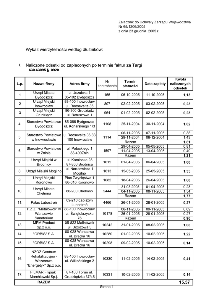 Załącznik do Uchwały Zarządu Województwa Nr 65/1206/2005 z dnia 23 grudnia 2005 r. Wykaz wierzytelności według dłużników: I. Naliczone odsetki od zapłaconych po terminie faktur za Targi 630.63095 § 0920 L.p. 1 2 3 Nazwa firmy Adres firmy Urząd Miasta Bydgoszcz Urząd Miejski Inowrocław Urząd Miejski Grudziądz ul. Jezuicka 1 85-102 Bydgoszcz 88-100 Inowrocław ul. Roosevelta 36 86-300 Grudziądz ul. Ratuszowa 1 Termin płatności Data zapłaty 155 06-10-2005 11-10-2005 1,13 807 02-02-2005 03-02-2005 0,23 964 01-02-2005 02-02-2005 0,23 25-11-2004 30-11-2004 1,02 06-11-2005 29-11-2004 Razem 29-04-2005 11-04-2005 Razem 07-11-2005 06-12-2004 0,38 1,43 1,81 0,81 0,40 1,21 1612 01-04-2005 06-04-2005 1,00 1613 15-05-2005 25-05-2005 1,35 1682 18-04-2005 26-04-2005 1,60 2444 31.03.2005 04-11-2005 Razem 01-04-2005 08-11-2005 0,23 1,54 1,77 4466 26-01-2005 28-01-2005 0,27 10178 06-11-2005 26-01-2005 Razem 09-11-2005 28-01-2005 0,69 0,27 0,96 10242 31-01-2005 08-02-2005 1,08 10280 01-02-2005 10-02-2005 1,22 10298 09-02-2005 10-02-2005 0,14 10330 11-02-2005 14-02-2005 0,41 10331 10-02-2005 11-02-2005 0,14 4. Starostwo Powiatowe 85-066 Bydgoszcz Bydgoszcz ul. Konarskiego 1/3 1108 5. Starostwo Powiatowe u. Roosevelta 36 88w Inowrocławiu 100 Inowrocław 1114 6. Starostwo Powiatowe w Żninie 1597 7. Urząd Miejski w Brodnicy 8. 9. ul. Kamionka 23 87-300 Brodnica ul. Narutowicza 1 Urząd Miejski Mogilno Mogilno Urząd Miejski Plac Zwycięstwa 1 Koronowo 86-010 Koronowo 10. Urząd Miasta Chełmna 11. Pałac Lubostroń 12. 13. F.Z.Z. "Metalowcy" w Warszawie Sanatorium MPM Product Sp.z o.o. 14. "ORBIS" S.A. 15. "ORBIS" S.A. 16. 17. ul. Potockiego 1 88-400Żnin 86-200 Chełmno 89-210 Łabiszyn Lubostroń 88-100 Inowrocław ul. Świętokrzyska 76 05-822 Malinówek ul. Brzozowa 3 00-028 Warszawa ul. Bracka 16 00-028 Warszawa ul. Bracka 16 NZOZ Centrum Rehabilitacyjno 88-100 Inowrocław Wczasowe ul. Wilkońskiego 2 "Energetyk" Sp.z o.o. FILMAR Filipiak i Marchlewski Sp.j. RAZEM 87-100 Toruń ul. Grudziądzka 37/45 Kwota naliczonych odsetek Nr kontrahenta 05-05-2005 13-04-2005 15,57 Strona 1 II. Naliczone odsetki od zapłaconych po terminie faktur z tytułu najmu i sprzedaży nieruchomości. 700.70005.§ 0920 L.p. 1 2 3 III. Nazwa firmy Adres firmy Kwota naliczonych odsetek Nr kontrahenta Termin płatności Data zapłaty 4414 31.03.2005 01-04-2005 0,08 12717 10-11-2005 01-09-2005 Razem 15-11-2005 13-09-2005 0,13 0,08 0,21 9004 10-10-2004 09-11-2005 6,82 Bejrach Waldemar i Rypin ul. Piaski 35 Renata Związek Gmin i ul. Dąbrowskiego Stowarzyszeń 11/13 Grudziądzki Bank 86-300 Grudziądz Kancelaria podatkowa Toruń ul. :Bilans " s.c. W.D. Broniewskiego /17 Cytowicz 15 Razem 7,11 Naliczone odsetki od zapłaconych po terminie należności przejętych z Zakładu Usług Technicznych i Pralniczych w Bydgoszczy. 710.71095 § 0920 L.p. Nazwa firmy Adres firmy Nr kontrahenta Termin płatności Data zapłaty 1 Hurt Art.Spoż-Przem. BERT-HURT Bydgoszcz ul.Objazdowa3 5242 06-03-2004 12-03-2004 Razem: IV. 2 3 0,50 0,50 Razem naliczone odsetki wg klasyfikacji Tytuł Klasyfikacja L.p. 1 Kwota naliczonych odsetek 630.63095 § 0920 700.70005.§ 0920 710.71095 § 0920 Naliczone odsetki od zapłaconych po terminie faktur za Targi Naliczone odsetki od zapłaconych po terminie faktur z tytułu najmu i sprzedaży nieruchomości. Naliczone odsetki od zapłaconych po terminie należności przejętych z Zakładu Usług Technicznych i Pralniczych w Razem Kwota naliczonych odsetek 15,57 7,11 0,50 23,18 Strona 2