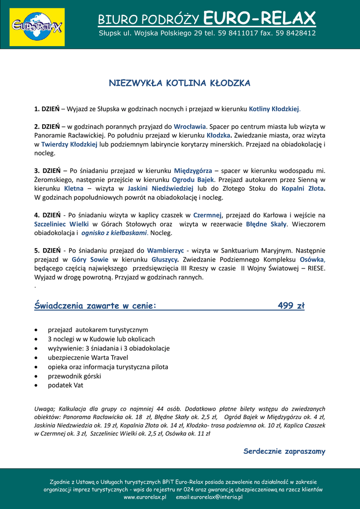 BIURO PODRÓŻY EURO-RELAX Słupsk ul. Wojska Polskiego 29 tel. 59 8411017 fax. 59 8428412 [email protected] NIEZWYKŁA KOTLINA KŁODZKA 1. DZIEŃ – Wyjazd ze Słupska w godzinach nocnych i przejazd w kierunku Kotliny Kłodzkiej. 2. DZIEŃ – w godzinach porannych przyjazd do Wrocławia. Spacer po centrum miasta lub wizyta w Panoramie Racławickiej. Po południu przejazd w kierunku Kłodzka. Zwiedzanie miasta, oraz wizyta w Twierdzy Kłodzkiej lub podziemnym labiryncie korytarzy minerskich. Przejazd na obiadokolację i nocleg. 3. DZIEŃ – Po śniadaniu przejazd w kierunku Międzygórza – spacer w kierunku wodospadu mi. Żeromskiego, następnie przejście w kierunku Ogrodu Bajek. Przejazd autokarem przez Sienną w kierunku Kletna – wizyta w Jaskini Niedźwiedziej lub do Złotego Stoku do Kopalni Złota. W godzinach popołudniowych powrót na obiadokolację i nocleg. 4. DZIEŃ - Po śniadaniu wizyta w kaplicy czaszek w Czermnej, przejazd do Karłowa i wejście na Szczeliniec Wielki w Górach Stołowych oraz wizyta w rezerwacie Błędne Skały. Wieczorem obiadokolacja i ognisko z kiełbaskami. Nocleg. 5. DZIEŃ - Po śniadaniu przejazd do Wambierzyc - wizyta w Sanktuarium Maryjnym. Następnie przejazd w Góry Sowie w kierunku Głuszycy. Zwiedzanie Podziemnego Kompleksu Osówka, będącego częścią największego przedsięwzięcia III Rzeszy w czasie II Wojny Światowej – RIESE. Wyjazd w drogę powrotną. Przyjazd w godzinach rannych. . Świadczenia zawarte w cenie: 499 zł przejazd autokarem turystycznym 3 noclegi w w Kudowie lub okolicach wyżywienie: 3 śniadania i 3 obiadokolacje ubezpieczenie Warta Travel opieka oraz informacja turystyczna pilota przewodnik górski podatek Vat Uwaga; Kalkulacja dla grupy co najmniej 44 osób. Dodatkowo płatne bilety wstępu do zwiedzanych obiektów: Panorama Racławicka ok. 18 zł, Błędne Skały ok. 2,5 zł, Ogród Bajek w Międzygórzu ok. 4 zł, Jaskinia Niedzwiedzia ok. 19 zł, Kopalnia Złota ok. 14 zł, Kłodzko- trasa podziemna ok. 10 zł, Kaplica Czaszek w Czermnej ok. 3 zł, Szczeliniec Wielki ok. 2,5 zł, Osówka ok. 11 zł Serdecznie zapraszamy Zgodnie z Ustawą o Usługach turystycznych BPiT Euro-Relax posiada zezwolenie na działalność w zakresie organizacji imprez turystycznych - wpis do rejestru nr 024 oraz gwarancję ubezpieczeniową na rzecz klientów www.eurorelax.pl email:[email protected]