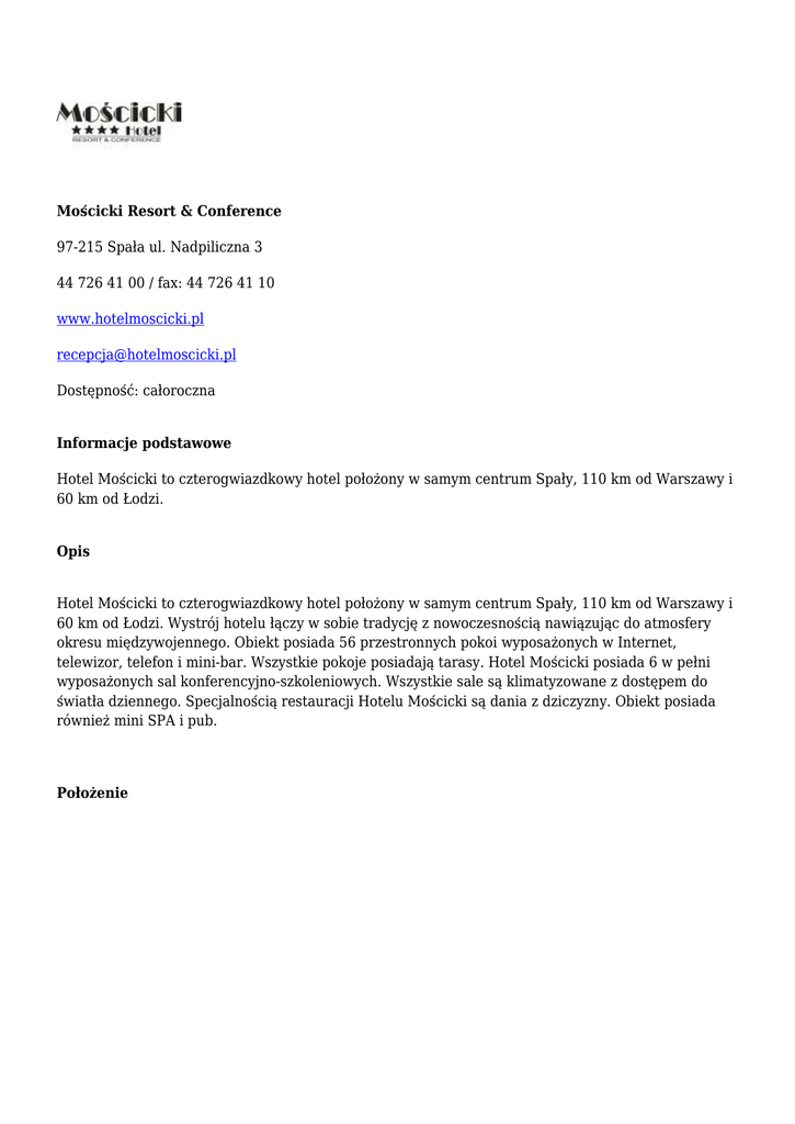 Mościcki Resort & Conference 97-215 Spała ul. Nadpiliczna 3 44 726 41 00 / fax: 44 726 41 10 www.hotelmoscicki.pl [email protected] Dostępność: całoroczna Informacje podstawowe Hotel Mościcki to czterogwiazdkowy hotel położony w samym centrum Spały, 110 km od Warszawy i 60 km od Łodzi. Opis Hotel Mościcki to czterogwiazdkowy hotel położony w samym centrum Spały, 110 km od Warszawy i 60 km od Łodzi. Wystrój hotelu łączy w sobie tradycję z nowoczesnością nawiązując do atmosfery okresu międzywojennego. Obiekt posiada 56 przestronnych pokoi wyposażonych w Internet, telewizor, telefon i mini-bar. Wszystkie pokoje posiadają tarasy. Hotel Mościcki posiada 6 w pełni wyposażonych sal konferencyjno-szkoleniowych. Wszystkie sale są klimatyzowane z dostępem do światła dziennego. Specjalnością restauracji Hotelu Mościcki są dania z dziczyzny. Obiekt posiada również mini SPA i pub. Położenie 325 364 100 110 59.8 Lokalizacja: Położenie poza miastem W sąsiedztwie w lesie, nad zbiornikiem wodnym Typ obiektu budynek nowo wybudowany Odległość od lotniska - czas dojazdu 62 km / 60 min Odległość od PKP - czas dojazdu 61,6 km / 60 min Dojazd komunikacją miejską ● ● A: T: - Odleglość od obiektu ● ● ● ● ● Przystanek autobusowy: 0.05 km Centrum (Piotrkowska - Tuwima/Struga): 59.8 km Lotnisko Lublinek: 62 km Lotnisko Okęcie: 110 km Manufaktura: 61,3 km Budynek: Liczba kondygnacji 3 Windy 1 Poniżej parteru Tak Zaplecze konferencyjne (piętro) ● ● ● 0 1 2 Oferta konferencyjna: Nazwa sali Teatr Bankiet Szkolenie Szkoła Prezydent Mościcki 130 90 64 Prezydent 70 45 24 Mościcki 50 27 Parkowa 35 24 Biznes I 20 12 12 Biznes II 20 10 10 24 30 Prezydent Mościcki Sala konferencyjna Prezydent Mościcki o powierzchni 132 m2. ● ● ● zaćmienie sali światło naturalne klimatyzacja ● ● ● ● ● ● ● ● ● bezprzewodowy Internet ekran flipchart mikrofon bezprzewodowy mównica nagłośnienie projektor multimedialny scena obsługa biurowa: faks, xero, skaner Prezydent Sala konferencyjna Prezydent o powierzchni 78 m2. ● ● ● ● ● ● ● ● ● ● ● ● zaćmienie sali światło naturalne klimatyzacja bezprzewodowy Internet ekran flipchart mikrofon bezprzewodowy mównica nagłośnienie projektor multimedialny scena obsługa biurowa: faks, xero, skaner Mościcki Sala konferencyjna Mościcki o powierzchni 54 m2. ● ● ● ● ● ● ● ● ● ● zaćmienie sali światło naturalne klimatyzacja bezprzewodowy Internet ekran flipchart mikrofon bezprzewodowy mównica projektor multimedialny obsługa biurowa: faks, xero, skaner Parkowa Sala konferencyjna Parkowa o powierzchni 45 m2. ● ● ● ● zaćmienie sali światło naturalne klimatyzacja bezprzewodowy Internet ● ● ● ● ● ● ekran flipchart mikrofon bezprzewodowy mównica projektor multimedialny obsługa biurowa: faks, xero, skaner Biznes I Sala konferencyjna Biznes I o powierzchni 27,5 m2. ● ● ● ● ● ● ● ● ● zaćmienie sali światło naturalne klimatyzacja bezprzewodowy Internet ekran flipchart mikrofon bezprzewodowy projektor multimedialny obsługa biurowa: faks, xero, skaner Biznes II Sala konferencyjna Biznes II o powierzchni 27,5 m2. ● ● ● ● ● ● ● ● zaćmienie sali światło naturalne klimatyzacja bezprzewodowy Internet ekran flipchart projektor multimedialny obsługa biurowa: faks, xero, skaner Oferta noclegowa: Typ obiektu hotel Kategoria 4* Maksymalna liczba miejsc noclegowych 100 Typ pokoju Ilość inny 13 2 osobowy TWIN 38 2 osobowy DOUBLE 1 apartament 2 inny 2 Oferta gastronomiczna: Nazwa Przeważająca kuchnia Liczba miejsc - ustawienia bankietowe weselne standardowe Restauracja Hotelowa kuchnia europejska, kuchnia myśliwska 110 Inne usługi i udogodnienia: ● ● ● ● ● ● ● ● ● ● ● ● ● ● ● ● możliwość płatności kartą kredytową zniżki dla grup Internet bezprzewodowy w pokoju: bezpłatny sejf udogodnienia dla niepełnosprawnych TV/SAT obsługa w języku angielskim parking strzeżony pod gołym niebem sauna lub sauny jacuzzi usługi kosmetyczne masaż sklep z upominkami wypożyczalnia rowerów prasowanie odzieży pranie odzieży 110 110