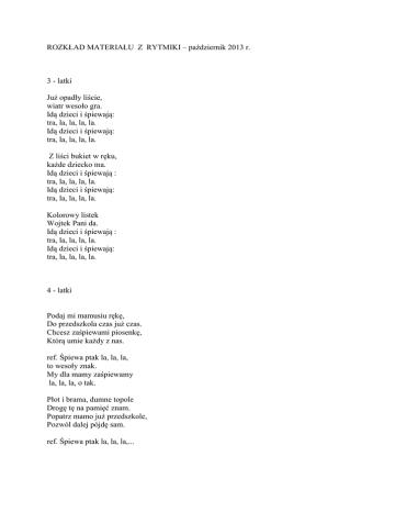 ROZKŁAD MATERIAŁU Z RYTMIKI – październik 2013 r. 3 - latki Już opadły liście, wiatr wesoło gra. Idą dzieci i śpiewają: tra, la, la, la, la. Idą dzieci i śpiewają: tra, la, la, la, la. Z liści bukiet w ręku, każde dziecko ma. Idą dzieci i śpiewają : tra, la, la, la, la. Idą dzieci i śpiewają: tra, la, la, la, la. Kolorowy listek Wojtek Pani da. Idą dzieci i śpiewają : tra, la, la, la, la. Idą dzieci i śpiewają: tra, la, la, la, la. 4 - latki Podaj mi mamusiu rękę, Do przedszkola czas już czas. Chcesz zaśpiewami piosenkę, Którą umie każdy z nas. ref. Śpiewa ptak la, la, la, to wesoły znak. My dla mamy zaśpiewamy la, la, la, o tak. Płot i brama, dumne topole Drogę tę na pamięć znam. Popatrz mamo już przedszkole, Pozwól dalej pójdę sam. ref. Śpiewa ptak la, la, la,... 5, 6 - latki 1. Rano budzę się, jaki piękny to czas, słońce wstało już, a więc pora już wstać. Szybko myję się, jem śniadanie i już gotów jestem, bo chcę już iść, chcę już iść. Ref. Do przedszkola, do przedszkola, jak cudownie tutaj co dzień mija czas. Do przedszkola, do przedszkola, o tym już od rana marzy każdy z nas. 2. Pani czeka już i koledzy już są, siadam w kole – to jest magiczny nasz krąg. Obok siedzi Jaś, Weronika i Staś tu bawimy się, więc przychodzę co dzień. Ref. Do przedszkola, do przedszkola, jak cudownie tutaj co dzień mija czas. Do przedszkola, do przedszkola, o tym już od rana marzy każdy z nas.