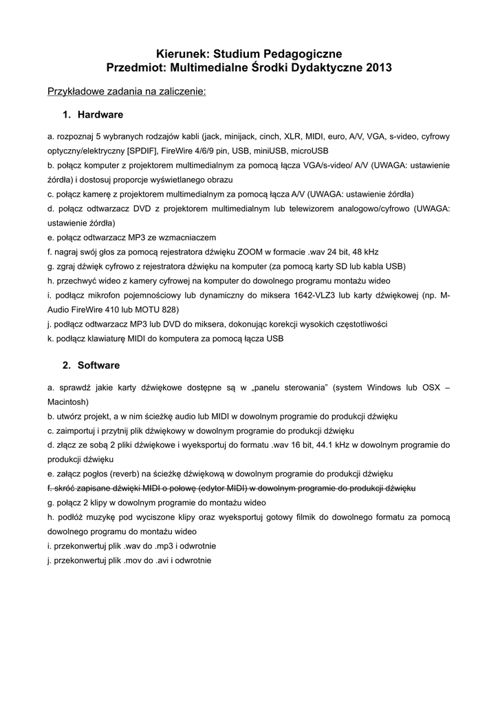 Kierunek: Studium Pedagogiczne Przedmiot: Multimedialne Środki Dydaktyczne 2013 Przykładowe zadania na zaliczenie: 1. Hardware a. rozpoznaj 5 wybranych rodzajów kabli (jack, minijack, cinch, XLR, MIDI, euro, A/V, VGA, s-video, cyfrowy optyczny/elektryczny [SPDIF], FireWire 4/6/9 pin, USB, miniUSB, microUSB b. połącz komputer z projektorem multimedialnym za pomocą łącza VGA/s-video/ A/V (UWAGA: ustawienie źórdła) i dostosuj proporcje wyświetlanego obrazu c. połącz kamerę z projektorem multimedialnym za pomocą łącza A/V (UWAGA: ustawienie źórdła) d. połącz odtwarzacz DVD z projektorem multimedialnym lub telewizorem analogowo/cyfrowo (UWAGA: ustawienie źórdła) e. połącz odtwarzacz MP3 ze wzmacniaczem f. nagraj swój głos za pomocą rejestratora dźwięku ZOOM w formacie .wav 24 bit, 48 kHz g. zgraj dźwięk cyfrowo z rejestratora dźwięku na komputer (za pomocą karty SD lub kabla USB) h. przechwyć wideo z kamery cyfrowej na komputer do dowolnego programu montażu wideo i. podłącz mikrofon pojemnościowy lub dynamiczny do miksera 1642-VLZ3 lub karty dźwiękowej (np. MAudio FireWire 410 lub MOTU 828) j. podłącz odtwarzacz MP3 lub DVD do miksera, dokonując korekcji wysokich częstotliwości k. podłącz klawiaturę MIDI do komputera za pomocą łącza USB 2. Software a. sprawdź jakie karty dźwiękowe dostępne są w „panelu sterowania” (system Windows lub OSX – Macintosh) b. utwórz projekt, a w nim ścieżkę audio lub MIDI w dowolnym programie do produkcji dźwięku c. zaimportuj i przytnij plik dźwiękowy w dowolnym programie do produkcji dźwięku d. złącz ze sobą 2 pliki dźwiękowe i wyeksportuj do formatu .wav 16 bit, 44.1 kHz w dowolnym programie do produkcji dźwięku e. załącz pogłos (reverb) na ścieżkę dźwiękową w dowolnym programie do produkcji dźwięku f. skróć zapisane dźwięki MIDI o połowę (edytor MIDI) w dowolnym programie do produkcji dźwięku g. połącz 2 klipy w dowolnym programie do montażu wideo h. podłóż muzykę pod wyciszone klipy oraz wyeksportuj gotowy filmik do dowolnego formatu za pomocą dowolnego programu do montażu wideo i. przekonwertuj plik .wav do .mp3 i odwrotnie j. przekonwertuj plik .mov do .avi i odwrotnie