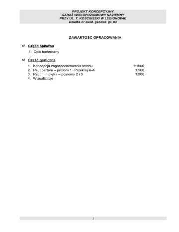 PROJEKT KONCEPCYJNY GARAŻ WIELOPOZIOMOWY NAZIEMNY PRZY UL. T. KOŚCIUSZKI W LEGIONOWIE Działka nr ewid. geodez. gr. 63 ZAWARTOŚĆ OPRACOWANIA a/ Część opisowa 1. Opis techniczny b/ Część graficzna 1. 2. 3. 4. Koncepcja zagospodarowania terenu Rzut parteru – poziom 1 i Przekrój A-A Rzut I i II piętra – poziomy 2 i 3 Wizualizacje 1 1:1000 1:500 1:500 PROJEKT KONCEPCYJNY GARAŻ WIELOPOZIOMOWY NAZIEMNY PRZY UL. T. KOŚCIUSZKI W LEGIONOWIE Działka nr ewid. geodez. gr. 63 OPIS TECHNICZNY PROJEKT KONCEPCYJNY GARAŻ WIELOPOZIOMOWY NAZIEMNY PRZY UL. T. KOŚCIUSZKI W LEGIONOWIE „Centrum Komunikacyjne w Legionowie – Etap II” Działka nr ewid. 3/26 obręb 63 I. CZĘŚĆ OGÓLNA 1. Inwestor : 2. Jednostka projektowa : Atelier ZETTA ul. Pratulińska 10/2 03-511 Warszawa 3. Zespół autorski : 4. URZĄD MIASTA LEGIONOWO ul. marsz. J. Piłsudskiego 41 05-120 Legionowo mgr inż. arch. Zenon Zabagło mgr inż. arch. Monika Siwik Podstawa opracowania : c/ Umowa z Zamawiającym d/ Wizja lokalna w terenie wrzesień 2013 r. e/ Materiały archiwalne. f/ Dokumentacja fotograficzna. g/ Mapa sytuacyjno-wysokościowa do celów projektowych. h/ Projekt budowlany i wykonawczy budowy „Centrum Komunikacyjnego w Legionowie” z dn. 28.02.2012 r., gł. projektant Anna Urban IKA sp. z o.o. zatwierdzony prawomocnym pozwoleniem na budowę. II. DANE LICZBOWE Powierzchnia zabudowy - razem 7.427,4 m2 Powierzchnia całkowita w tym użytkowa - razem 20.614,7 m2 Kubatura - razem 60.161,9 m3 III. BILANS TERENU Powierzchnia zabudowy 7.427,4 m2 78,8 % 662,3 m2 7,0 % Powierzchnia zieleni 1.338,7 m2 14,2 % Powierzchnia terenu opracowania 9.428,4 m2 100,00 % Powierzchnia dojazdów i dojść 2 PROJEKT KONCEPCYJNY GARAŻ WIELOPOZIOMOWY NAZIEMNY PRZY UL. T. KOŚCIUSZKI W LEGIONOWIE Działka nr ewid. geodez. gr. 63 IV. CHARAKTERYSTYKA OBIEKTU Przedmiotem niniejszego opracowania jest projekt koncepcyjny budowy garażu wielopoziomowego przy ul. Kościuszki w Legionowie dla „Centrum Komunikacyjne w Legionowie – Etap II” na działce o numerze ewid. 3/26 obręb 63. Projekt przewiduje lokalizację parkingu wielostanowiskowego wielokondygnacyjnego z ilością miejsc zapewniającą parkingi w większości dla osób korzystających z dojazdów koleją z przyległego dworca. Od strony realizowanego dworca kolejowego zaprojektowano 2 – 3 kondygnacyjną część usługową połączoną łącznikiem na 2 kondygnacji z dworcem kolejowym. Teren inwestycji znajduje się po jednej stronie istniejących torów kolejowych od strony centrum miasta, w pobliżu znajduje się realizowany obecnie budynek dworca kolejowego oraz przejście na perony. Teren objęty opracowaniem nie jest wpisany do rejestru zabytków ani nie podlega ochronie konserwatorskiej. Zaprojektowano budynek garażu wielopoziomowego na 765 miejsc parkingowych w budynku oraz 16 m.p. na terenie inwestycji. Projektowany budynek miałby wysokość 9,80 m nad poziom terenu z dominantą w części usługowej do 11,50 m. Budynek w konstrukcji żelbetowej, obsługiwany przez elektroniczny system dostępu. Do obiektu prowadzić będzie realizowany zjazd przy dworcu kolejowym. Projektuje się wolnostojący garaż wielostanowiskowy o łącznej ilości 3 kondygnacji. Obszar oddziaływania obiektu zamyka się na terenie własnej działki. Budynek położony na terenie inwestycji nie podlega ochronie konserwatorskiej i nie leży w strefie ochronnej innych obiektów. Roboty budowlane zaprojektowano zgodnie z obowiązującymi przepisami i normami, a w szczególności zgodnie z : • rozporządzeniem Ministra Infrastruktury z dnia 12 kwietnia 2002 r. w sprawie warunków technicznych, jakim powinny odpowiadać budynki i ich usytuowanie (Dz.U. nr 75 poz. 690 z 2002r z późniejszymi zmianami), • ustawą z dnia 07 lipca 1994r. Prawo Budowlane (Dz.U. Nr 243 z 2010 r., poz. 1623 z późniejszymi zmianami), Obiekt spełnia warunki techniczne i wymagania wydane przez prawomocne jednostki. Jednocześnie nowy obiekt porządkuje zabudowę oraz uzupełnia braki co do miejsc postojowych. Bryłę budynku dostosowano do charakteru zabudowy oraz w zgodzie z oczekiwaniami Inwestora. Uwaga: ze względu na bliskość obiektu od strony trakcji kolejowej konieczne jest uzyskanie odstępstwa na wymaganą odległość obiektu od szyn kolejowych. 3 PROJEKT KONCEPCYJNY GARAŻ WIELOPOZIOMOWY NAZIEMNY PRZY UL. T. KOŚCIUSZKI W LEGIONOWIE Działka nr ewid. geodez. gr. 63 V. DANE DOTYCZĄCE ELEMENTÓW BUDOWLANO-KONSTRUKCYJNYCH 1. FUNDAMENTY Zaprojektowano posadowienie budynku bezpośrednie na ławach, stopach i płycie fundamentowej na gruncie nośnym poniżej głębokości przemarzania. Całości fundamentów oraz ścian piwniczych należy zabezpieczyć przed wodą w postaci izolacji przeciwwilgociowej. 2. ŚCIANY a) Ściany garażu Projektuje się ściany konstrukcyjne zewnętrzne i wewnętrzne nadziemnych wylewane żelbetowe z betonu C30/37 zbrojone obustronnie stalą. Dodatkowo do ścian garażu zostały zamocowane żaluzje stalowe osłaniające wnętrze budynku, zapewniająca swobodny przepływ powietrza. b) Ściany usługi Ściany zewnętrzne w formie ściany szkieletowej o układzie warstw jak dla fasady wentylowanej. Układ warstw ściennych od wewnątrz: - płyta gipsowo-włóknowa, - folia paroizolacyjna stabilizowana, - ruszt stalowy z profili zimno giętych, - poszycie ściany z płyty drewnopochodnej, - pomiędzy profilami izolacja cieplna wełna mineralna grubości 15 cm, - wiatroizolacja wysokoprzepuszczalna membrana, - pustka powietrzna, - profile stalowe omega dla podwieszenia fasady zasadniczej - fasada wykonana z płyt HPL. 3. SŁUPY, FILARKI I PODCIĄGI Zaprojektowano żelbetowe monolityczne żelbetowe z betonu klasy C30/37 zbrojone stalą. 4. STROPY I WIEŃCE Stropy i wieńce zaprojektowano żelbetowe monolityczne żelbetowe z betonu kl. C30/37 zbrojone stalą. Zbrojenie na przebicie, płyt stropowych opartych bezpośrednio na słupach, projektuje się za pomocą trzpieni dyblowych.