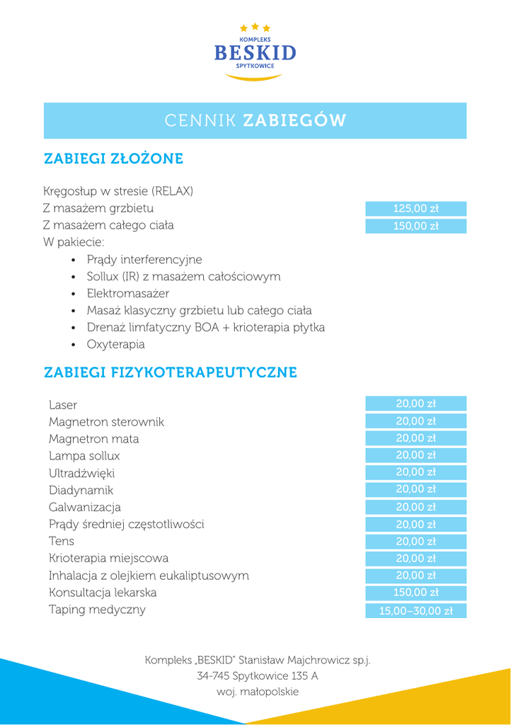 CEN N I K Z A BIEG ÓW ZABIEGI ZŁOŻONE Kręgosłup w stresie (RELAX) Z masażem grzbietu Z masażem całego ciała W pakiecie: • Prądy interferencyjne • Sollux (IR) z masażem całościowym • Elektromasażer • Masaż klasyczny grzbietu lub całego ciała • Drenaż limfatyczny BOA + krioterapia płytka • Oxyterapia 125,00 zł 150,00 zł ZABIEGI FIZYKOTERAPEUTYCZNE Laser Magnetron sterownik Magnetron mata Lampa sollux Ultradźwięki Diadynamik Galwanizacja Prądy średniej częstotliwości Tens Krioterapia miejscowa Inhalacja z olejkiem eukaliptusowym Konsultacja lekarska Taping medyczny Kompleks „BESKID” Stanisław Majchrowicz sp.j. 34-745 Spytkowice 135 A woj. małopolskie 20,00 zł 20,00 zł 20,00 zł 20,00 zł 20,00 zł 20,00 zł 20,00 zł 20,00 zł 20,00 zł 20,00 zł 20,00 zł 150,00 zł 15,00–30,00 zł