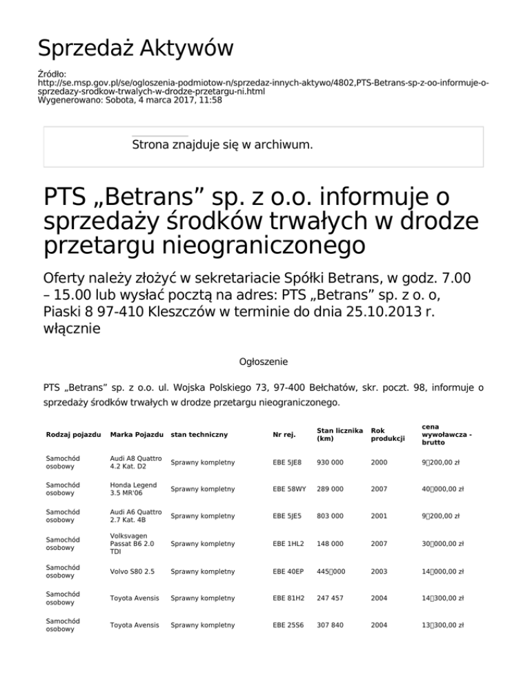 Sprzedaż Aktywów Źródło: http://se.msp.gov.pl/se/ogloszenia-podmiotow-n/sprzedaz-innych-aktywo/4802,PTS-Betrans-sp-z-oo-informuje-osprzedazy-srodkow-trwalych-w-drodze-przetargu-ni.html Wygenerowano: Sobota, 4 marca 2017, 11:58 Strona znajduje się w archiwum. PTS „Betrans” sp. z o.o. informuje o sprzedaży środków trwałych w drodze przetargu nieograniczonego Oferty należy złożyć w sekretariacie Spółki Betrans, w godz. 7.00 – 15.00 lub wysłać pocztą na adres: PTS „Betrans” sp. z o. o, Piaski 8 97-410 Kleszczów w terminie do dnia 25.10.2013 r. włącznie Ogłoszenie PTS „Betrans” sp. z o.o. ul. Wojska Polskiego 73, 97-400 Bełchatów, skr. poczt. 98, informuje o sprzedaży środków trwałych w drodze przetargu nieograniczonego. Rodzaj pojazdu Marka Pojazdu stan techniczny Nr rej. Stan licznika (km) Rok produkcji cena wywoławcza brutto Samochód osobowy Audi A8 Quattro 4.2 Kat. D2 Sprawny kompletny EBE 5JE8 930 000 2000 9 200,00 zł Samochód osobowy Honda Legend 3.5 MR'06 Sprawny kompletny EBE 58WY 289 000 2007 40 000,00 zł Samochód osobowy Audi A6 Quattro 2.7 Kat. 4B Sprawny kompletny EBE 5JE5 803 000 2001 9 200,00 zł Samochód osobowy Volksvagen Passat B6 2.0 TDI Sprawny kompletny EBE 1HL2 148 000 2007 30 000,00 zł Samochód osobowy Volvo S80 2.5 Sprawny kompletny EBE 40EP 445 000 2003 14 000,00 zł Samochód osobowy Toyota Avensis Sprawny kompletny EBE 81H2 247 457 2004 14 300,00 zł Samochód osobowy Toyota Avensis Sprawny kompletny EBE 25S6 307 840 2004 13 300,00 zł Samochód osobowy Peugeot 406 Sprawny kompletny EBE J662 404 881 2001 4 500,00 zł Samochód osobowy Peugeot 406 Sprawny kompletny EBE E767 543 949 2000 4 050,00 zł Samochód osobowy Citroen C5 Pojazd kompletny(niesprawny akumulator) EBE 01JA 190 061 2004 7 000,00 zł Samochód osobowy Volvo Pojazd, sprawny kompletny EBE 7C97 305 780 2007 35 000,00 zł Samochód osobowy Honda Legend Pojazd, sprawny kompletny EBE 71WY 208 734 2007 44 000,00 zł Samochód ciężarowy Gazela (niesprawny technicznie) EBE 90GP 197 020 2004 1 000,00 zł Samochód ciężarowy Gazela (niesprawny technicznie) EBE 11JA 230 245 2004 1 000,00 zł Istnieje możliwość oględzin w/w środków trwałych w godz. 7.00 – 15.00 po uprzednim uzgodnieniu telefoniczny +48 44 737 72 35. Bliższe informacje o stanie technicznym pojazdów pod nr tel. +48 44 735 45 21, +48 44 735 17 35 (w zakresie samochodów osobowych). Ogłoszenie zostało umieszczone na stronie www.betrans.pl Rozpatrzeniu będą podlegały oferty dostarczone w zamkniętych kopertach z napisem: „Przetarg nieograniczony BC/HH/5346/423/2013 – nie otwierać” Oferty należy złożyć w sekretariacie Spółki Betrans, w godz. 7.00 – 15.00 lub wysłać pocztą na adres: PTS „Betrans” sp. z o. o, Piaski 8 97-410 Kleszczów w terminie do dnia 25.10.2013 r. włącznie. Oferta powinna zawierać: Imię, nazwisko i adres oferenta lub firmę i siedzibę, numer kontaktowy. Jeżeli oferentem jest osoba prawna, status prawny – aktualny wypis z rejestru sądowego, zaświadczenie o wpisie w CEIDG oraz w przypadku oferty o wartości przekraczającej 5 000,00 PLN netto zaświadczenie z ZUS i US o braku zaległości w regulowaniu zobowiązań. 1. Przedmiot oferty oraz oferowaną cenę PLN brutto, nie niższą niż w/w cena wywoławcza 2. Oświadczenie, że oferent zapoznał się ze stanem faktycznym i prawnym przedmiotu konkursu ofert. O wyniku konkursu oferenci otrzymają informację w dniu 30.10.2013 r. pod nr tel. +48 44 737 72 35. W razie ustalania, że kilku oferentów zaoferowało tę samą cenę, PTS „Betrans” sp. z o.o. wyznaczy oferentom, którzy je złożyli termin na złożenie ofert dodatkowych, przyjmując jako cenę wywoławczą kwotę zgłoszoną w ofercie. Oferent, którego oferta zostanie wybrana jako najkorzystniejsza zobowiązany jest do zapłaty i odbioru przedmiotu sprzedaży w terminie 10 dni od dnia ogłoszenia wyników konkursu. W razie nie zachowania terminu 10 dniowego przez Oferenta PTS „Betrans” sp. z o.o. ma prawo dokonać wyboru oferty spośród pozostałych ofert uznanych za ważne lub unieważnić konkurs bez dokonywania wyboru którejkolwiek z ofert. PTS „Betrans” sp. z o.o. nie ponosi odpowiedzialności z tytułu gwarancji i rękojmi, ani za ukryte wady oferowanych do sprzedaży używanych środków trwałych. PTS „Betrans” sp. z o.o. przysługuje prawo swobodnego wyboru oferty, a także prawo unieważnienia konkursu ofert bez dokonania wyboru którejkolwiek z ofert lub bez podania przyczyn. Opublikowane przez: Aleksandra Sierpińska Ostatnia zmiana: 23.10.2013 Aleksandra Autor: PGE Polska Grupa Energetyczna S.A. Sierpińska Rejestr zmian