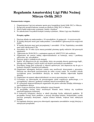 Regulamin Amatorskiej Ligi Piłki Nożnej Mircze Orlik 2013 Postanowienia wstępne. 1. 2. 3. 4. Organizatorem Ligi jest animator sportu przy kompleksie boisk Orlik 2012 w Mirczu. Rozgrywki przeprowadzone zostaną na obiekcie Orlik 2012 w Mirczu. Mecze będą rozgrywane systemem „każdy z każdym” Po zakończeniu wszystkich kolejek zostaną wyłonieni ; Mistrz Ligi oraz Medaliści Przepisy ogólne 1. Drużyna składa się maksymalnie z 10 zawodników, (6 grających + 4 rezerwowych) 2. W każdej drużynie może grać maksymalnie 2 zawodników zgłoszonych do rozgrywek PZPN 3. W każdej drużynie musi grać przynajmniej 1 zawodnik +35 lat. Najmłodszy zawodnik musi mieć ukończone15 lat. 4. Zawodnicy do 18 roku życia muszą posiadać pisemną zgodę rodziców lub prawnych opiekunów. 5. Zgłoszenia do 20.04.2013r. u animatora sportu tel. 604227219, lub osobiście. 6. Organizator nie ponosi żadnej odpowiedzialności za kontuzje, urazy i problemy zdrowotne, itp. zawodników. 7. Drużyny grają w jednakowych strojach. 8. Sędzia nie dopuszcza do gry zawodnika, który nie posiada obuwia sportowego bądź , którego strój odbiega (i może mylić) od strojów pozostałych zawodników 9. Zawodnicy mogą grać wyłącznie w obuwiu sportowym. (nie dopuszcza się do gry w korkach wkrętach i metalowych kołkach) 10. Organizator udostępnia drużynie szatnię oraz możliwość skorzystania z prysznica. Drużyna ma obowiązek pozostawienia po sobie czystej szatni. Za wszelkie szkody wyrządzone przez zawodników drużyny na terenie obiektu odpowiada kapitan drużyny. 11. Organizator nie ponosi odpowiedzialności za rzeczy pozostawione w szatni. 12. Uczestnicy są zobowiązani do przestrzegania zasad współżycia społecznego, a w szczególności: zdrowia i godności osobistej innych uczestników ligi. 13. W sytuacjach nieprzewidzianych organizator ma prawo odwołać kolejkę informując o tym kapitanów drużyn. 14. Mecz wygrywa drużyna, która zdobędzie więcej bramek. 15. W przypadku równej ilości strzelonych bramek mecz kończy się wynikiem nierozstrzygniętym (remisem). 16. O końcowej kolejności drużyn w tabeli decyduje liczba zdobytych punktów. W przypadku równej ilości punktów o pozycji decydują kolejno: bezpośrednie wyniki meczów pomiędzy drużynami , lepsza różnica bramek, większa ilość zdobytych bramek . 17. Na kapitanie drużyny spoczywa obowiązek zapoznania zawodników swojej drużyny z niniejszymi przepisami. Przepisy szczegółowe 1. Mecz składa się z dwóch równych części po 20 minuty każda z 5 minutową przerwą pomiędzy nimi. 2. Po przerwie drużyny zamieniają się stronami boiska. 3. Drużyny grają po 6 zawodników, w tym jeden bramkarz w stroju odróżniającym się od pozostałych zawodników drużyny. 4. Aby mecz mógł się rozpocząć na boisku musi znajdować się minimum 5 zawodników każdej z drużyn. 5. Walkower orzeka sędzia po upływie 15 minut od przewidzianego czasu rozpoczęcia rozgrywek. 6. Każda drużyna może tylko 2 razy przełożyć termin rozgrywania meczu. 7. Zmiany są lotne wyłącznie w strefie zmian. 8. Strefą zmian określony jest obszar przy środkowej linii boiska. 9. Piłka z autu jest wybijana nogą. 10. Po wyjściu piłki za linię końcowa boiska bramkarz wprowadza ją do gry nogą, piłka musi być rozegrana na własnej połowie, gdy bramkarz złapie piłkę wówczas wprowadza ją do gry ręką podając ją do zawodnika na własnej połowie. 11. Drużyna ma 6 sekund na wprowadzenie piłki do gry. Po tym czasie sędzia odgwizduje rzut wolny dla drużyny przeciwnej. 12. Zawodnik drużyny przeciwnej powinien znajdować się 5 metrów od miejsca wybijania autu, rzutu rożnego, bądź rzutu wolnego. 13. Wszystkie rzuty wolne są bezpośrednie. 14. Rzuty wolne podyktowane za przewinienia w obrębie pola karnego (poza rzutem karnym) wykonywane są z linii pola karnego. 15. Gra toczy się do gwizdka sędziego. Zmiany składów 1. Lista zgłoszonych zawodników poszczególnych drużyn, nie może ulec zmianie do końca rozgrywek. 2. Aby zawodnik mógł być dopuszczony do zawodów musi być formalnie zgłoszony do drużyny. 3. W przypadku stwierdzenia faktu udziału w zawodach zawodnika nie zgłoszonego do składu orzeka się walkower Kary 1. Sędzia może ukarać zawodnika karą: 2 minut lub czerwoną kartką (równoznaczną z karą meczu dla zawodnika - drużyna przez 4 minuty gra w osłabieniu bez względu na ilość straconych bramek). 2. Zawodnik powraca na boisko po wyraźnym wskazaniu sędziego. 3. Drużyna gra w osłabieniu przez okres trwania kary - w przypadku utraty bramki przez drużynę grającą w osłabieniu zawodnik powraca na boisko (nie dotyczy przewinień ukaranych czerwoną kartką). Gdy podyktowane kary czasowe dla zawodników obu drużyn miały charakter dyscyplinarny (nie za faul) to obie drużyny grają w osłabieniu do końca kary (nawet w przypadku zdobycia bramki) 4. Kary czasowe o charakterze obligatoryjnym przewidziane są za: o o o o o o o o o o o o o o o o wślizg - 2 minuty i żółta kartka celowe zagranie piłki ręką - 2 minuty i żółta kartka faul taktyczny, tzn. sfaulowanie przeciwnika wychodzącego na czystą pozycję brutalne zagranie -2 minuty i żółta kartka uderzenie przeciwnika - czerwona kartka, zachowanie prowokacyjne - czerwona kartka. obraźliwe gesty lub słowa, (wywołanie, udział w bójce), itp. - czerwona kartka Bramkarz może blokować nogami strzał lub podanie piłki w obrębie pola karnego. Za wślizg zawodnika z pola w obrębie pola karnego sędzia dyktuje rzut karny i karę 2 minut oraz żółtą kartkę dla zawodnika (jeżeli po rzucie karnym padnie bramka zawodnik powraca na boisko - nie dotyczy sytuacji, w której zawodnik otrzyma czerwoną kartkę). Nie jest uważane za wślizg zagranie, gdy w promieniu 2 metrów nie znajduje się zawodnik drużyny przeciwnej a zawodnik "przecina" tylko tor piłki. Zawodnik ukarany czerwoną kartką ponosi karę: Pierwsz