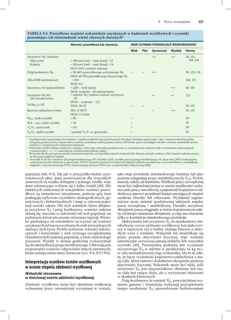 9 Testy wysiłkowe 227 TABELA 9-3. Prawidłowe wartości wskaźników uzyskanych w badaniach wysiłkowych i czynniki powodujące ich różnorodność wśród zdrowych dorosłych* Wartości prawidłowe lub równania INNE CZYNNIKI POWODUJĄCE RÓŻNORODNOŚĆ Wiek Szczytowe V·o2‡ (ml/min) Mężczyźni Kobiety Próg beztlenowy V·o2 ΔV·o2/ΔWR (ml/min/wat) Szczytowa AS (uderzeń/min) Szczytowe V·o2/AS (ml O2/uderzenie) V·e/V·co2 @ AT§ Rezerwa oddechowa l/min = (Wzrost [cm] – wiek [lata]) × 21 = (Wzrost [cm] – wiek [lata]) × 14 DGN: 83% wartości należnej = 50–60% prawidłowego szczytowego V·o2 DGN: 40–55% prawidłowego szczytowego V·o2 = 10,0 DGN: 8,5 = (220 – wiek (lata)) DGN: (należne – 20 uderzeń/min) = należne V·o2: należna wartość szczytowa AS DGN: ∼ (należna − 2,7) DGN: 28–32 + Płeć + Sprawność Wysiłek Normy +++ +++ 39, 113, 149, 150 +++ 39, 113, 150 104, 151 + +++ 40, 150 ++ ++ 113 + +++ + 39, 152 PaO2, ciężki wysiłek 28% of MVV DGN: 11 l/min > 80 39, 153 + 39 P(A – a)o2, ciężki wysiłek < 34 + 39 VD/VT, spoczynek < 0,4 + 39 VD/VT, ciężki wysiłek i poniżej VD/VT w spoczynku + 39 * Przedstawiono reprezentatywne wartości i współczynniki dla niewytrenowanych dorosłych. Wartości opisane jako < lub > stanowią określoną dolną lub górną granicę normy; innymi słowy wartości są średnią z dolnej granicy normy (DGN) tam, gdzie są dostępne. Źródła i wybrane zamienniki można znaleźć w wymienionych wartościach należnych. † Potencjalne źródła istotnej zmienności wartości u zdrowego człowieka przedstawiono w wymienionych zakresach lub w równaniach referencyjnych, z oznaczeniem +, ++, +++ wskazującym wielkość potencjalnego efektu. · # Równanie dla Vo2 jest uproszczonym równaniem opartym na niepublikowanych analizach (J.H. Hansen, kontakt osobisty). Zob. wartości należne cytowane dla poszczególnych regresji. · · § Stosunek Ve do Vco2 mierzony dla progu beztlenowego (AT). Wysiłek ciężki, wysiłek powyżej progu beztlenowego; AS, akcja serca; MVV, maksymalna wentylacja dowolna mierzona w spoczynku; VD/VT, stosunek przestrzeni martwej do objętości oddechowej obliczony z równania Bohra w modyfikacji Enghaffa z użyciem tętniczego PCO2 i jednoczesnego pomiaru VCO2 oraz współczynnika oddechowego (RQ). populacji (tab. 9-3). Tak jak w przypadku badań czynnościowych płuc, dane porównawcze dla wszystkich zmiennych są rzadko dostępne z jednego źródła, więc dane referencyjne wybiera się z kilku źródeł [40]. Dla niektórych zmierzonych wskaźników wartości prawidłowe są stosunkowo niezmienne, podczas gdy inne podlegają wpływom czynników demograficznych, genetycznych i behawioralnych i mają w zdrowej populacji szeroki zakres. Dla tych ostatnich, które obejmują szczytowe V·O2 i próg beztlenowy, wartości należne różnią się znacznie w zależności od cech populacji, na podstawie której utworzono równania regresji. Wartości pochodzące od ochotników są wyższe od wartości uzyskanych od losowo wybranych osób prowadzących siedzący tryb życia. Wybór zestawów wartości referencyjnych i korzystanie z nich wymaga uwzględnienia charakterystyki badanej populacji, a także metodologii pracowni. Wyniki w formie graficznej wykorzystuje się do identyfikacji progu beztlenowego. Ułatwiają one rozpoznanie wzorców odpowiedzi innych zmiennych, które cechują różne stany kliniczne (ryc. 9-4, 9-5 i 9-6). Interpretacja wyników testów wysiłkowych w ocenie stopnia zdolności wysiłkowej Wskaźniki stosowane w ilościowej ocenie zdolności wysiłkowej Zdolność wysiłkowa może być określona wielkością wykonanej pracy zewnętrznej wyrażonej w watach, jako etap protokołu standardowego badania lub jako poziom osiągniętej pracy metabolicznej (tj. V·O2). Wybór metody zależy od kontekstu. Wielkość pracy zewnętrznej może być najbardziej istotna w ocenie możliwości wykonywania pracy zawodowej, a pojemność krążeniowo-oddechowa stanowi przedmiot badań oceniających stopień nasilenia choroby lub rokowanie. Wydajność ergonomiczna może zmienić spodziewaną zależność między pracą zewnętrzną i metaboliczną. Ponadto szczytowe obciążenie pracą osiągnięte w teście stopniowanym zależy od tempa narastania obciążenia, a więc ma znaczenie tylko w kontekście standardowego protokołu. Maksymalne lub szczytowe V·O2 to standardowy metaboliczny wyraz zdolności wysiłkowej. Jest stale wyższy u mężczyzn niż u kobiet, malejąc liniowo u dorosłych wraz z wiekiem. Wskaźnik ten modyfikuje się przez poziom aktywności fizycznej, więc wartości referencyjne zazwyczaj ujmują niektóre lub wszystkie czynniki [40]. Powszechną praktyką jest wyrażanie szczytowego V·O2 w ml/min w przeliczeniu na kg m.c. w celu normalizowania tego wskaźnika. Ma to tę zaletę, że łączy wydolność krążeniowo-oddechową z masą ciała, która stanowi dodatkowe obciążenie podczas aktywności fizycznej. Wskaźnik może być niski, jeśli szczytowe V·O2 jest nieprawidłowo obniżone lub masa ciała jest rażąco duża, ale z wyraźnymi różnicami w skutkach klinicznych. Próg beztlenowy to wartość V·O2, powyżej której wymiana gazowa i wentylacja wykazują przyspieszone tempo uwalniania V·O2 spowodowane buforowaniem