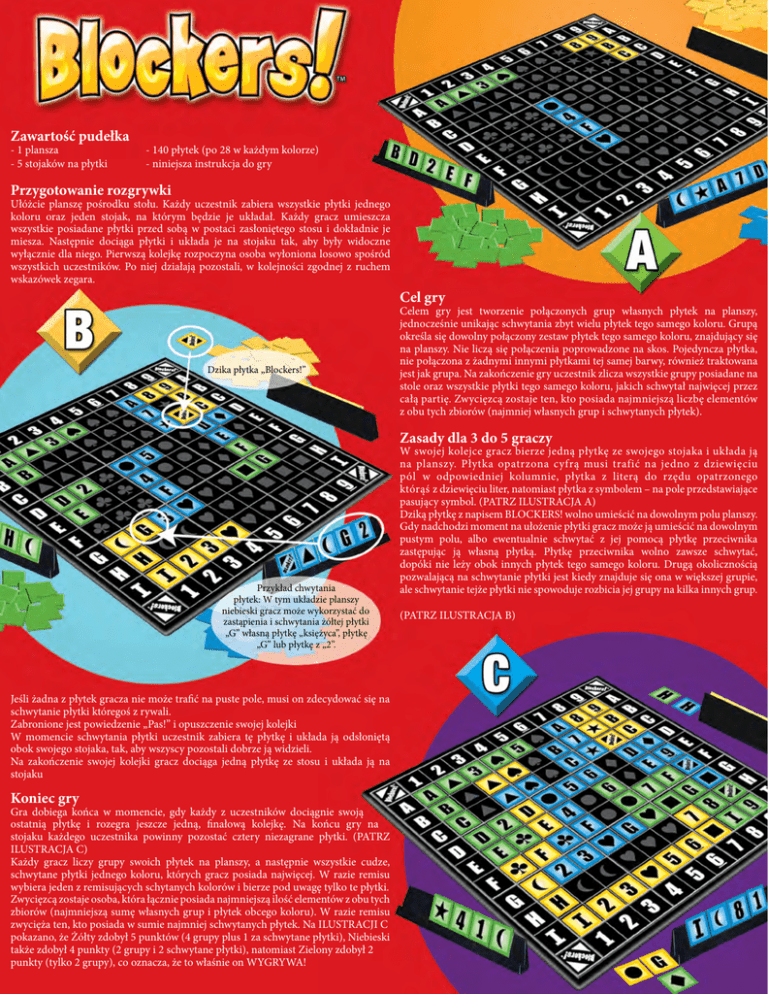 Zawartość pudełka - 1 plansza - 5 stojaków na płytki - 140 płytek (po 28 w każdym kolorze) - niniejsza instrukcja do gry Przygotowanie rozgrywki Ułóżcie planszę pośrodku stołu. Każdy uczestnik zabiera wszystkie płytki jednego koloru oraz jeden stojak, na którym będzie je układał. Każdy gracz umieszcza wszystkie posiadane płytki przed sobą w postaci zasłoniętego stosu i dokładnie je miesza. Następnie dociąga płytki i układa je na stojaku tak, aby były widoczne wyłącznie dla niego. Pierwszą kolejkę rozpoczyna osoba wyłoniona losowo spośród wszystkich uczestników. Po niej działają pozostali, w kolejności zgodnej z ruchem wskazówek zegara. Cel gry Dzika płytka „Blockers!” Celem gry jest tworzenie połączonych grup własnych płytek na planszy, jednocześnie unikając schwytania zbyt wielu płytek tego samego koloru. Grupą określa się dowolny połączony zestaw płytek tego samego koloru, znajdujący się na planszy. Nie liczą się połączenia poprowadzone na skos. Pojedyncza płytka, nie połączona z żadnymi innymi płytkami tej samej barwy, również traktowana jest jak grupa. Na zakończenie gry uczestnik zlicza wszystkie grupy posiadane na stole oraz wszystkie płytki tego samego koloru, jakich schwytał najwięcej przez całą partię. Zwycięzcą zostaje ten, kto posiada najmniejszą liczbę elementów z obu tych zbiorów (najmniej własnych grup i schwytanych płytek). Zasady dla 3 do 5 graczy Przykład chwytania płytek: W tym układzie planszy niebieski gracz może wykorzystać do zastąpienia i schwytania żółtej płytki „G” własną płytkę „księżyca”, płytkę „G” lub płytkę z „2”. Jeśli żadna z płytek gracza nie może trafić na puste pole, musi on zdecydować się na schwytanie płytki któregoś z rywali. Zabronione jest powiedzenie „Pas!” i opuszczenie swojej kolejki W momencie schwytania płytki uczestnik zabiera tę płytkę i układa ją odsłoniętą obok swojego stojaka, tak, aby wszyscy pozostali dobrze ją widzieli. Na zakończenie swojej kolejki gracz dociąga jedną płytkę ze stosu i układa ją na stojaku Koniec gry Gra dobiega końca w momencie, gdy każdy z uczestników dociągnie swoją ostatnią płytkę i rozegra jeszcze jedną, finałową kolejkę. Na końcu gry na stojaku każdego uczestnika powinny pozostać cztery niezagrane płytki. (PATRZ ILUSTRACJA C) Każdy gracz liczy grupy swoich płytek na planszy, a następnie wszystkie cudze, schwytane płytki jednego koloru, których gracz posiada najwięcej. W razie remisu wybiera jeden z remisujących schytanych kolorów i bierze pod uwagę tylko te płytki. Zwycięzcą zostaje osoba, która łącznie posiada najmniejszą ilość elementów z obu tych zbiorów (najmniejszą sumę własnych grup i płytek obcego koloru). W razie remisu zwycięża ten, kto posiada w sumie najmniej schwytanych płytek. Na ILUSTRACJI C pokazano, że Żółty zdobył 5 punktów (4 grupy plus 1 za schwytane płytki), Niebieski także zdobył 4 punkty (2 grupy i 2 schwytane płytki), natomiast Zielony zdobył 2 punkty (tylko 2 grupy), co oznacza, że to właśnie on WYGRYWA! W swojej kolejce gracz bierze jedną płytkę ze swojego stojaka i układa ją na planszy. Płytka opatrzona cyfrą musi trafić na jedno z dziewięciu pól w odpowiedniej kolumnie, płytka z literą do rzędu opatrzonego którąś z dziewięciu liter, natomiast płytka z symbolem – na pole przedstawiające pasujący symbol. (PATRZ ILUSTRACJA A) Dziką płytkę z napisem BLOCKERS! wolno umieścić na dowolnym polu planszy. Gdy nadchodzi moment na ułożenie płytki gracz może ją umieścić na dowolnym pustym polu, albo ewentualnie schwytać z jej pomocą płytkę przeciwnika zastępując ją własną płytką. Płytkę przeciwnika wolno zawsze schwytać, dopóki nie leży obok innych płytek tego samego koloru. Drugą okolicznością pozwalającą na schwytanie płytki jest kiedy znajduje się ona w większej grupie, ale schwytanie tejże płytki nie spowoduje rozbicia jej grupy na kilka innych grup. (PATRZ ILUSTRACJA B) Zasady na 2 osoby Zgodnie z podstawowymi zasadami gry na 2 osoby każdy z uczestników wykorzystuje płytki jednego koloru i gra tak samo, jak to opisano powyżej. Zgodnie z zaawansowanymi zasadami gry na 2 osoby każdy uczestnik korzysta z płytek w dwóch kolorach oraz z dwóch stojaków, z których każdy zawiera płytki w jednym z kolorów. Każdy z zestawów płytek należy trzymać osobno. W swojej kolejce uczestnik ma prawo zagrać płytkę dowolnego z posiadanych kolorów. Wolno mu również schwytać płytkę przeciwnika na normalnych zasadach, o ile nie rozdzieli jednej grupy na kilka osobnych. Dodatkowo może schwytać płytką w jednym z posiadanych kolorów płytkę w drugim z tychże kolorów, wciąż zachowując zasadę nie rozdzielania grupy. Należy jednak pamiętać, że każde takie posunięcie może działać przeciwko uczestnikowi na zakończenie rozgrywki. Po tym, jak gracz wyłoży płytkę, musi dociągnąć płytkę w tym samym kolorze. Jeśli nie ma już żadnych płytek danego koloru do dociągnięcia przewraca stojak i odsłania cztery pozostałe płytki danego koloru tak, aby przeciwnik wiedział, że dany kolor został zamknięty. Aż do zakończenia gry ten gracz może wykorzystywać wyłącznie płytki w drugim posiadanym kolorze. Rozgrywka dobiega końca w momencie, gdy obaj uczestnicy zamkną oba posiadane kolory. Każdy z nich liczy wówczas swoje grupy z planszy oraz liczbę schwytanych płytek reprezentowanych najliczniej w jednym z kolorów (bierze się pod uwagę tak płytki w kolorach przeciwnika, jak i własnych). Wygrywa osoba posiadająca łącznie najmniejszą sumę elementów z obu tych zbiorów (najmniej własnych grup na planszy plus najmniej schwytanych płytek w najsilniej reprezentowanym kolorze). W razie remisu zwycięża ten, kto schwytał najmniej płytek. Strategia Blockers! to gra o bardzo prostych zasadac